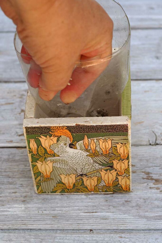 Step 4: Finish the planter by cutting off the bottom of a plastic soda bottle. Then place the soda bottle inside the tile box. You must squeeze the bottle slightly to fit it into the box.