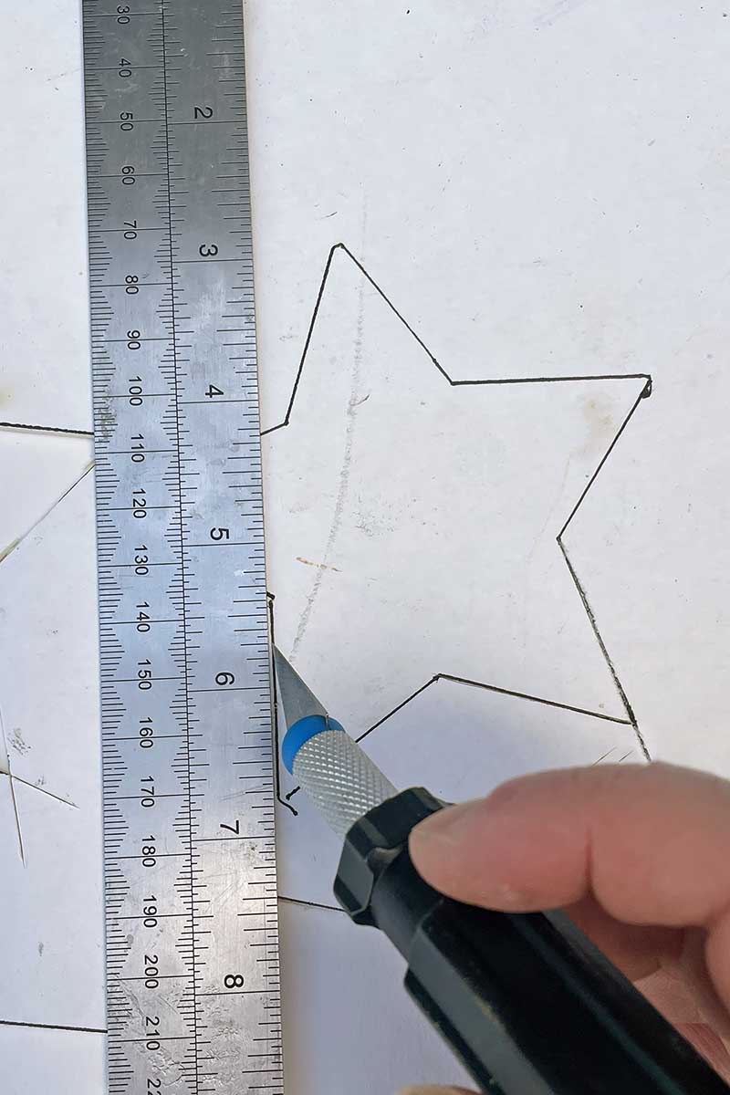 Then, using a cutting blade and steel ruler, I cut several cardboard stars. I just used a bradawl to punch hanging holes in the top of the stars.