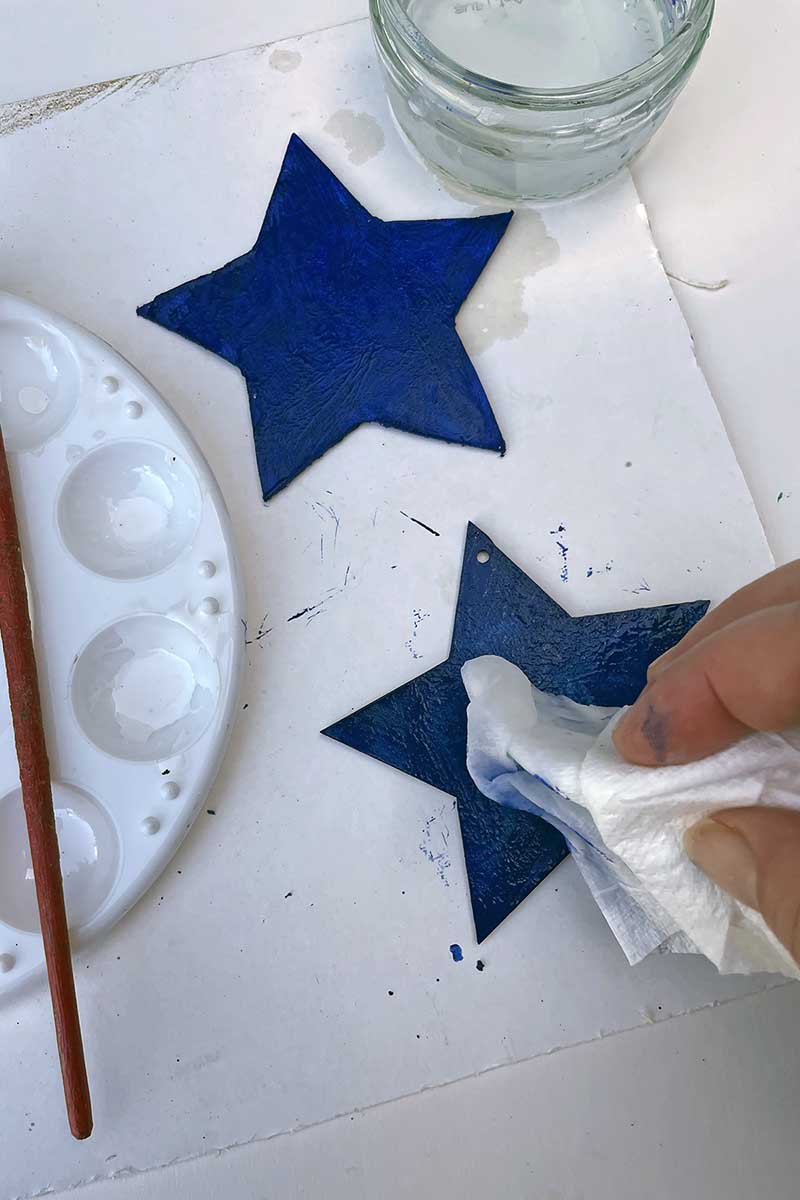 While the paint was fresh, I gently dabbed it with a tissue, aiming for a patchy ombre look to mimic the night sky.