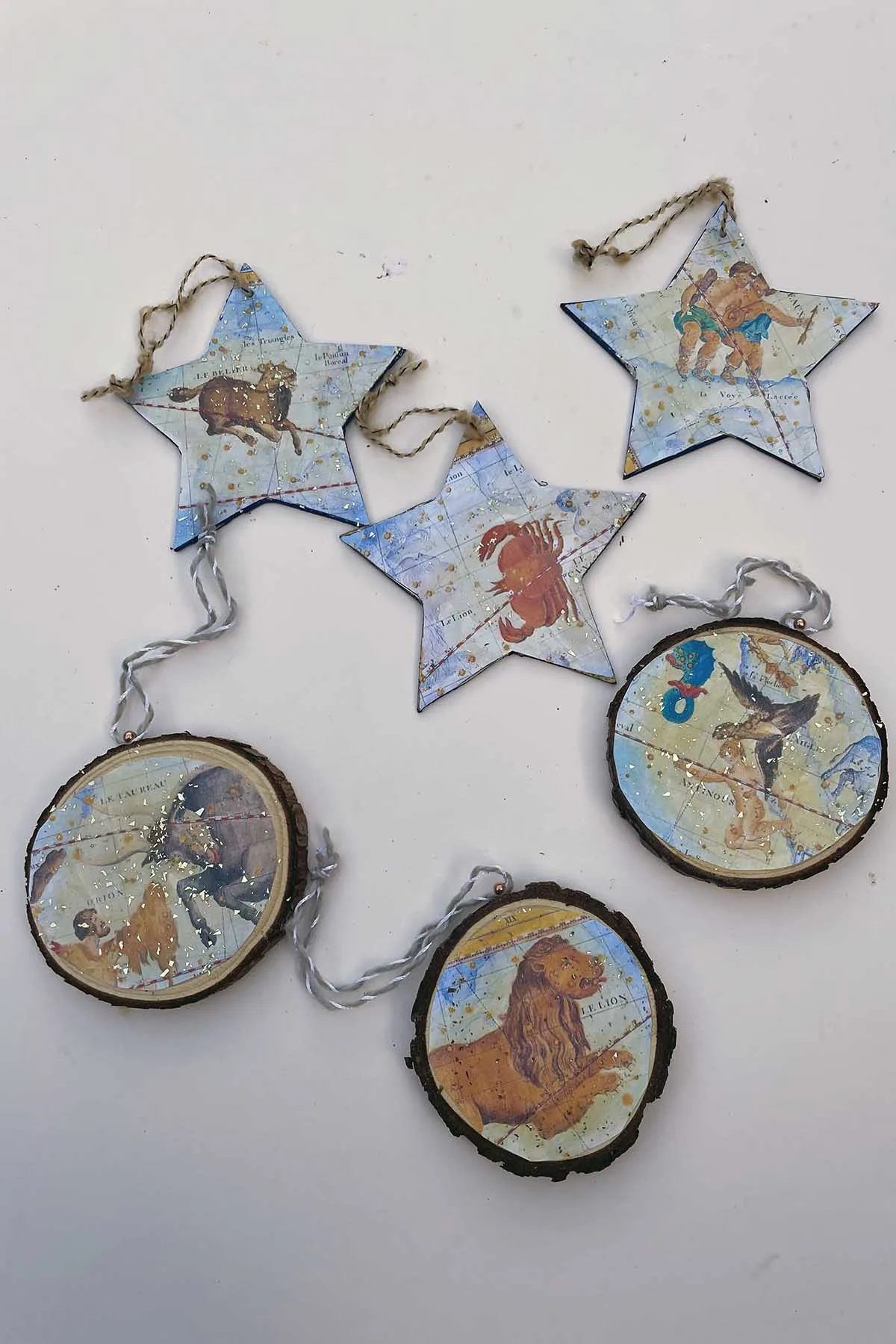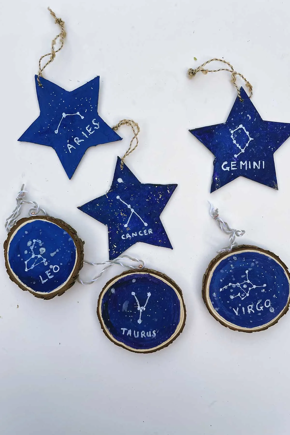 I made both star shaped zodiac ornaments and round wood slice versions.