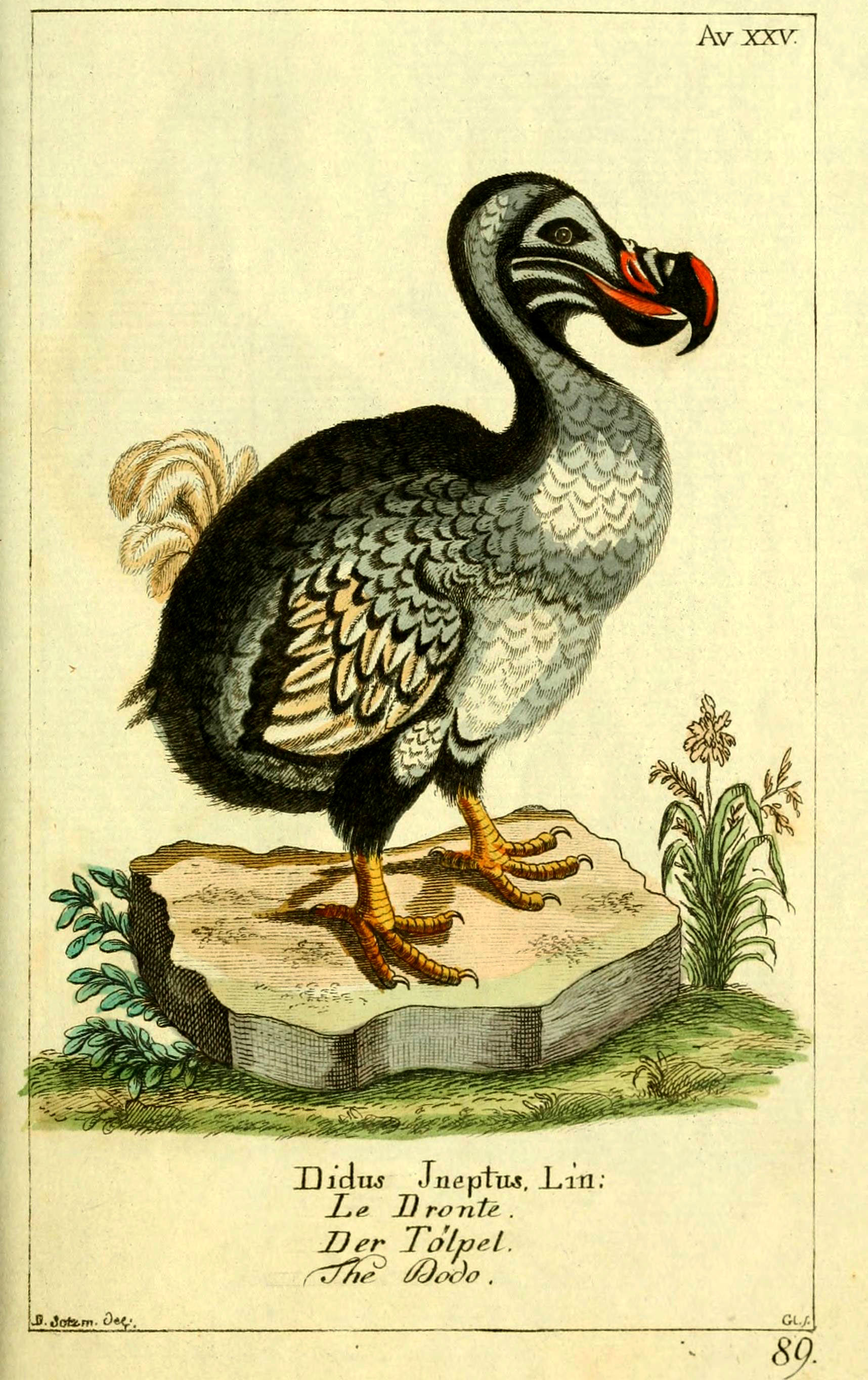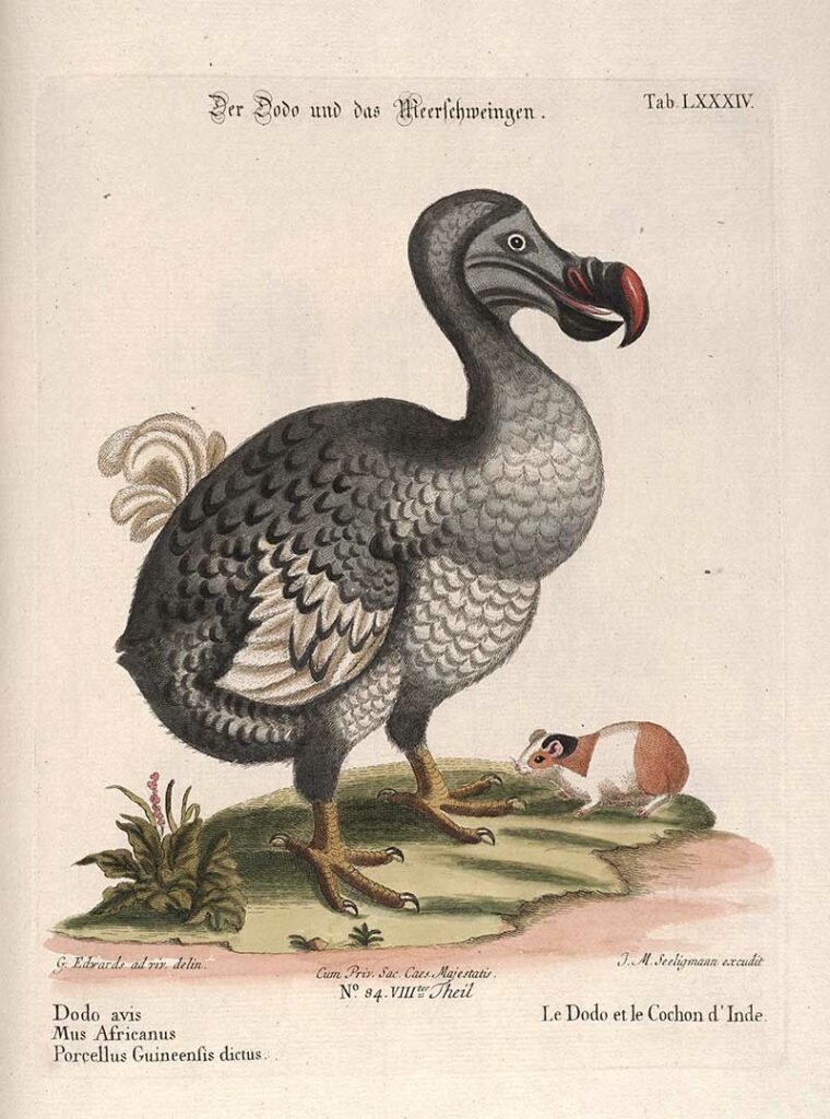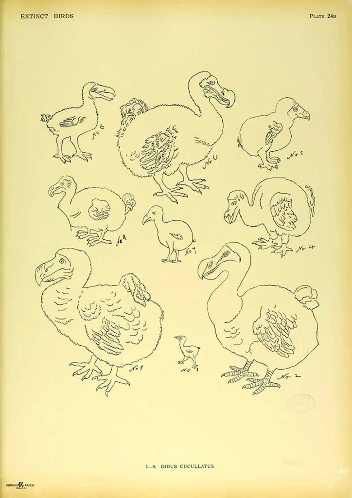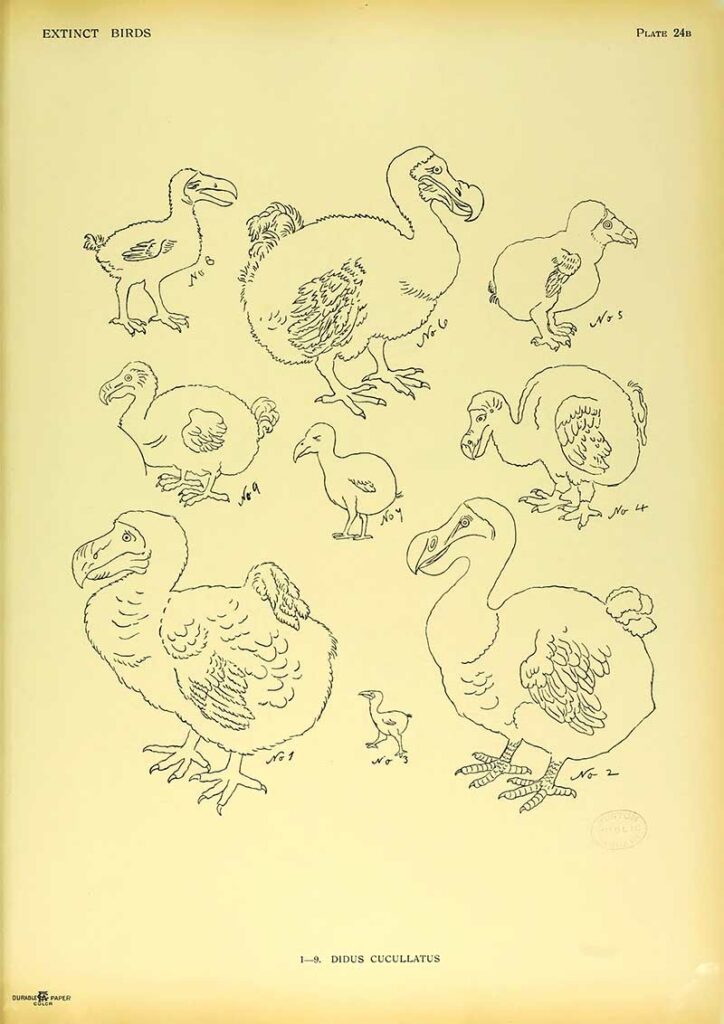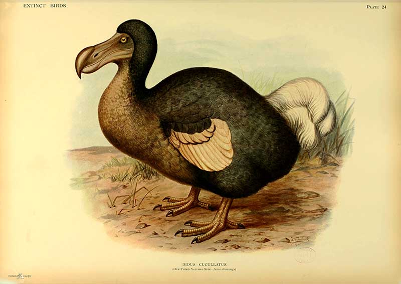 A dodo illustration from the 1907 book “Extinct birds: an attempt to unite in one volume a short account of those birds which have become extinct in historical times: that is, within the last six or seven hundred years: to which are added a few which still exist, but are on the verge of extinction“. By Lionel Walter Rothschild.