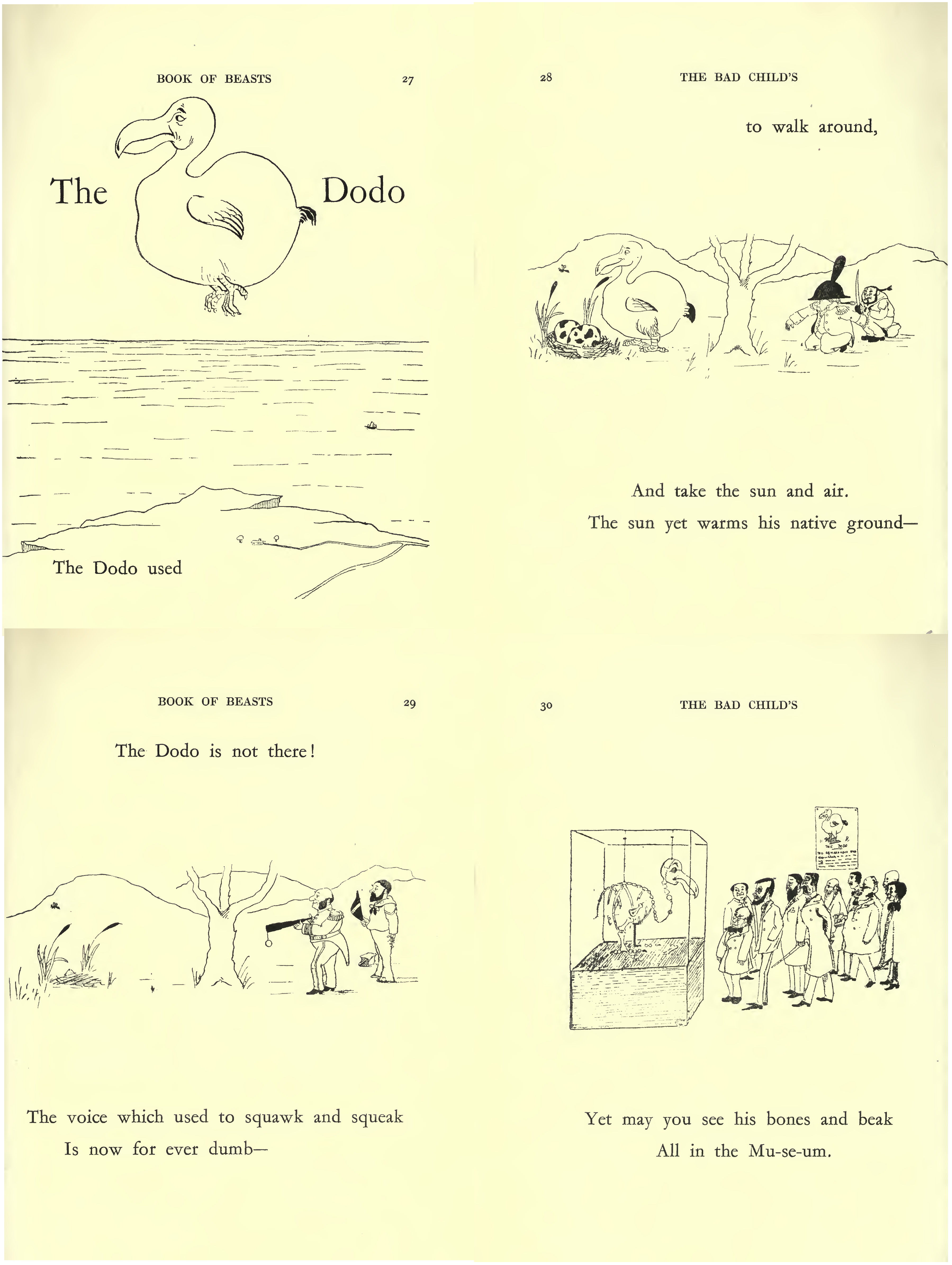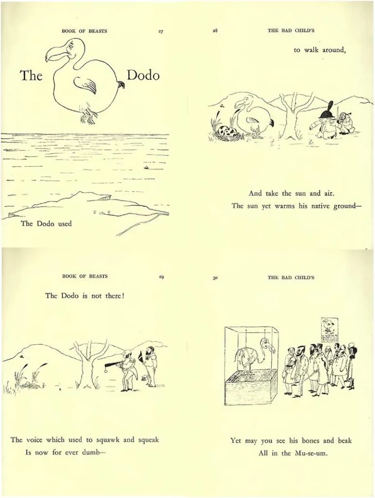 The poet Hilaire Belloc included the following poem about the dodo in his Bad Child’s Book of Beasts from 1896:
