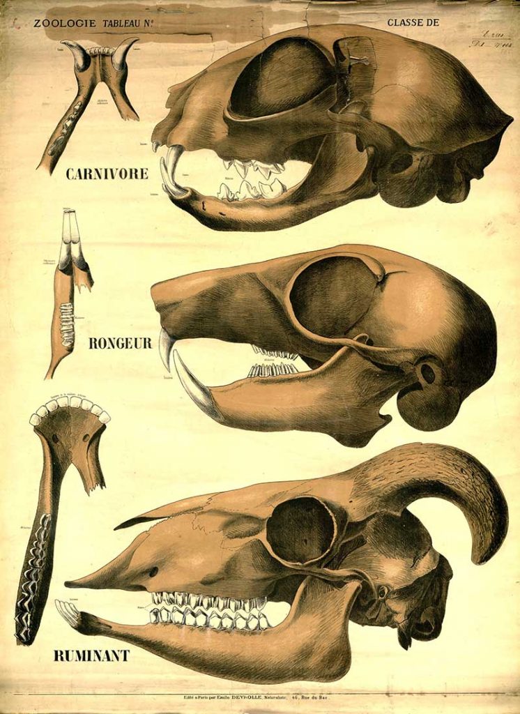 This educational poster illustrates 3 different types of mammalian skulls, those of carnivores, rodents and herbivores.