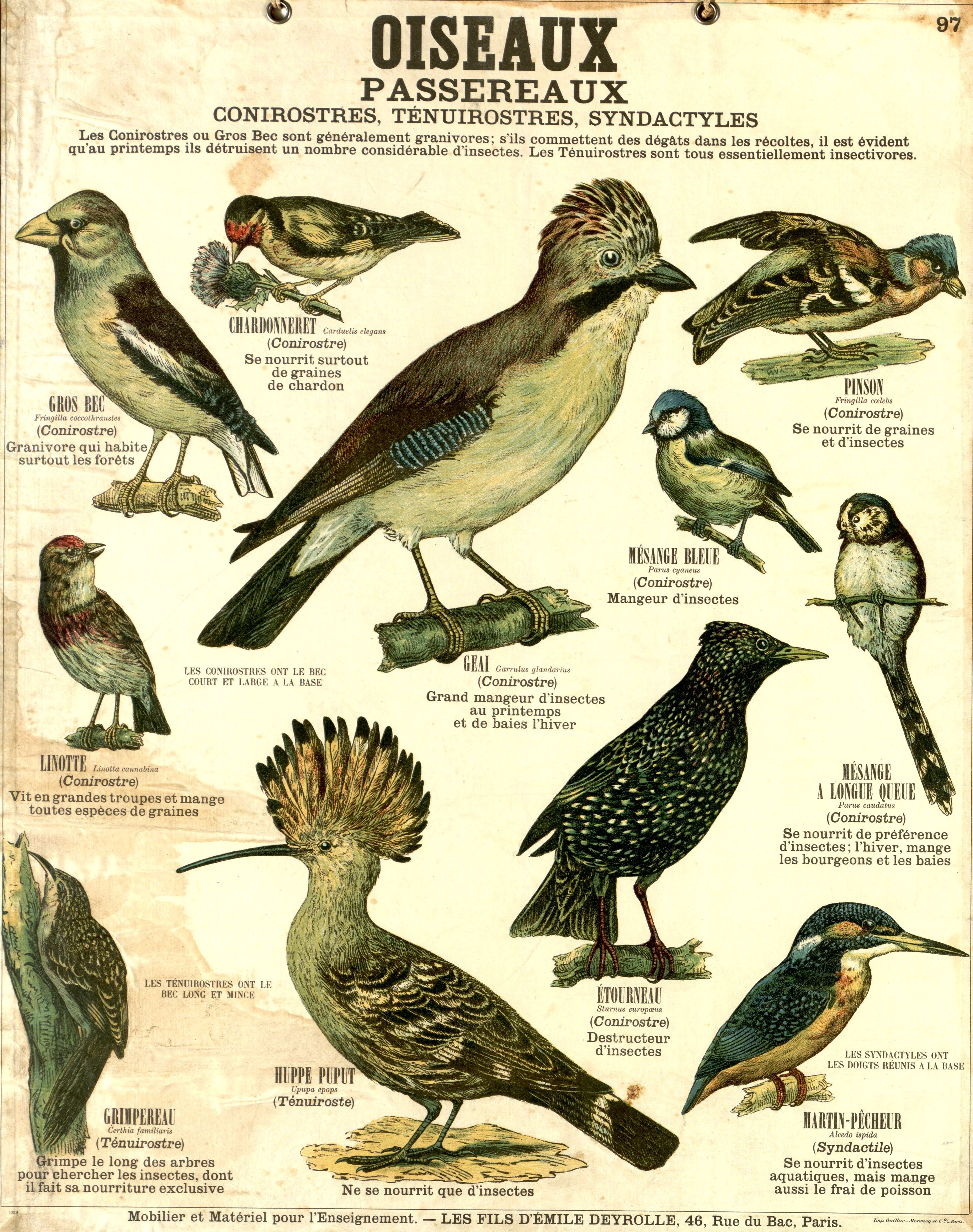 A second poster grouping of birds, this includes sparrows (passereaux) and finches. Also, Tenuirostres which are mostly passerine birds (as hummingbirds, sunbirds, honeyeaters, nuthatches) having slender bills.