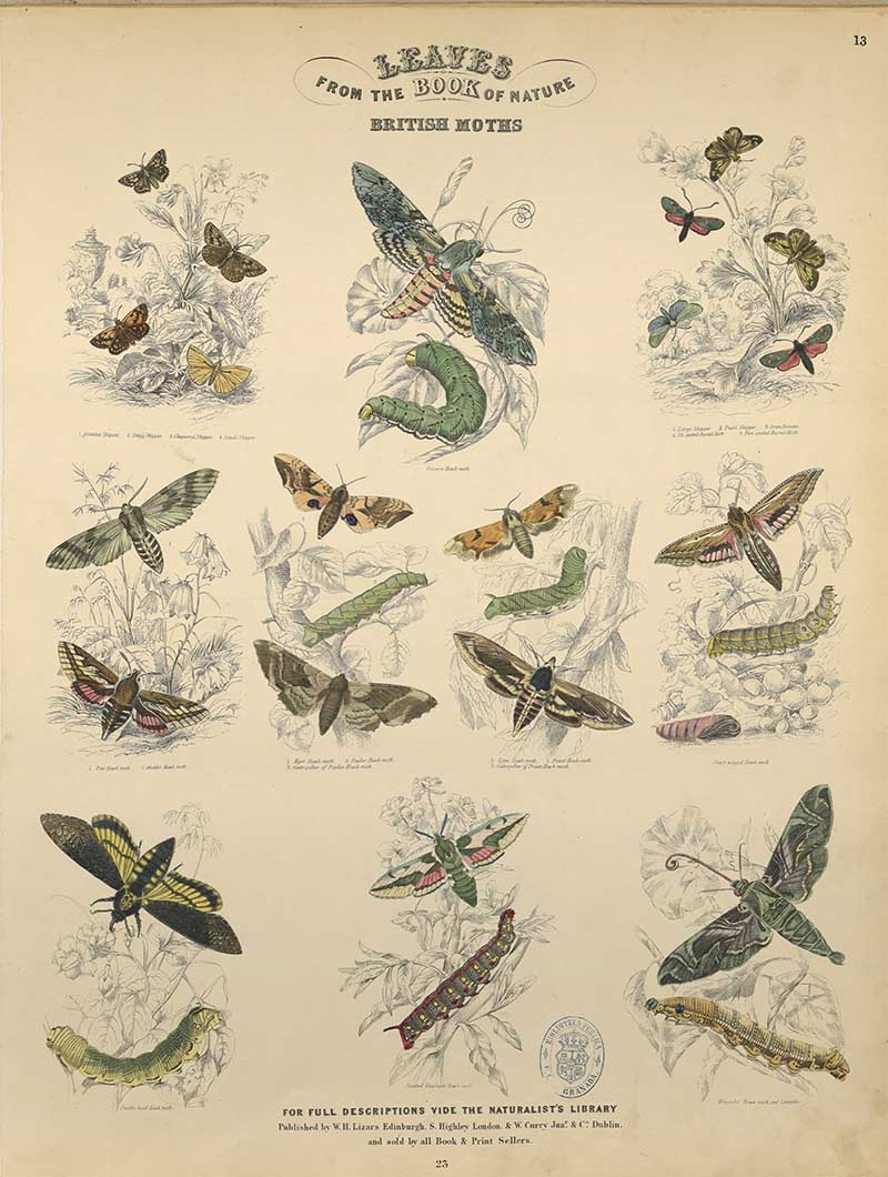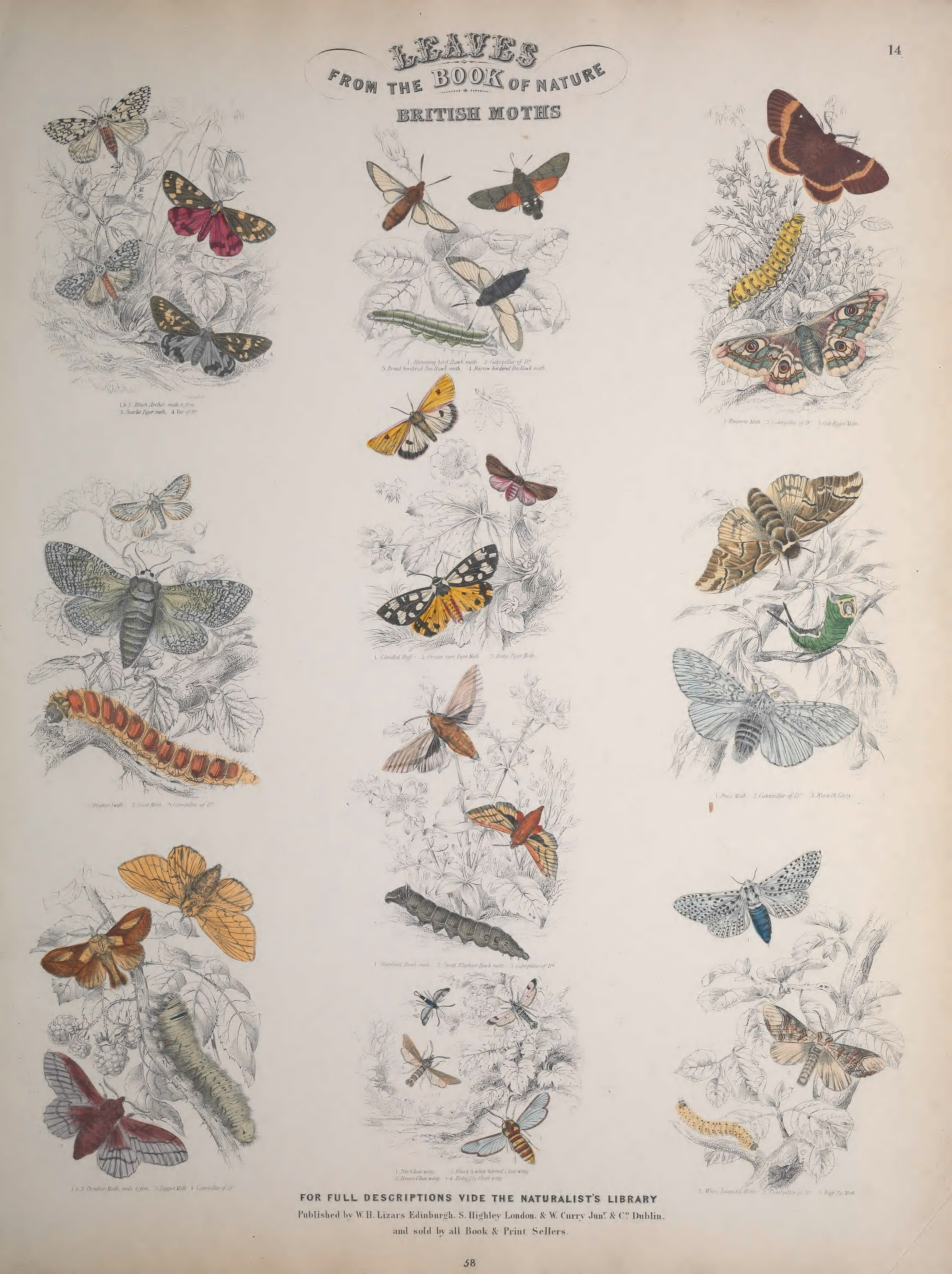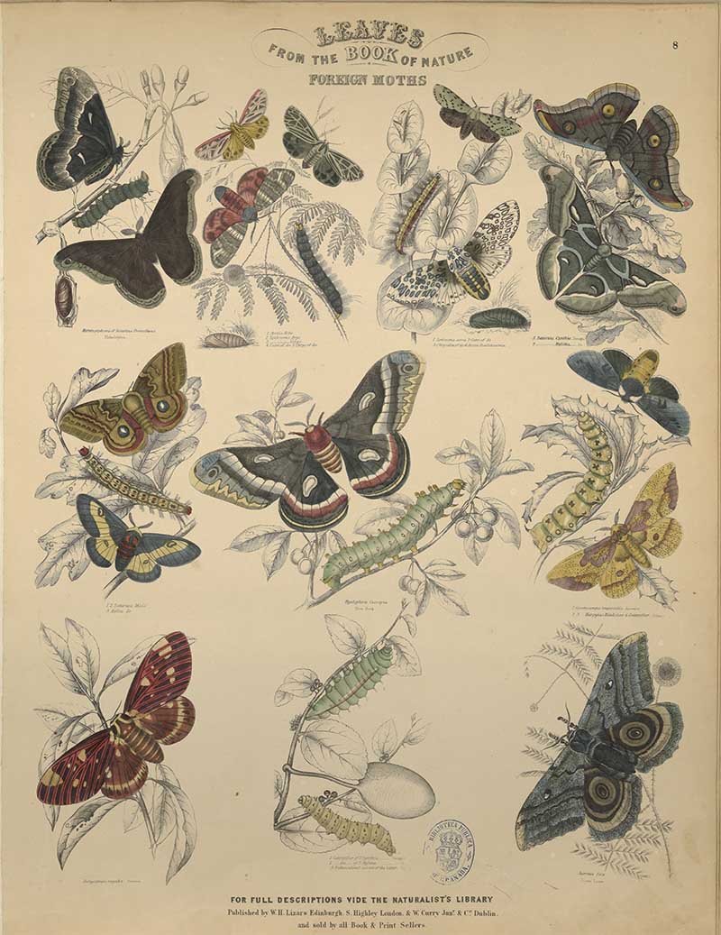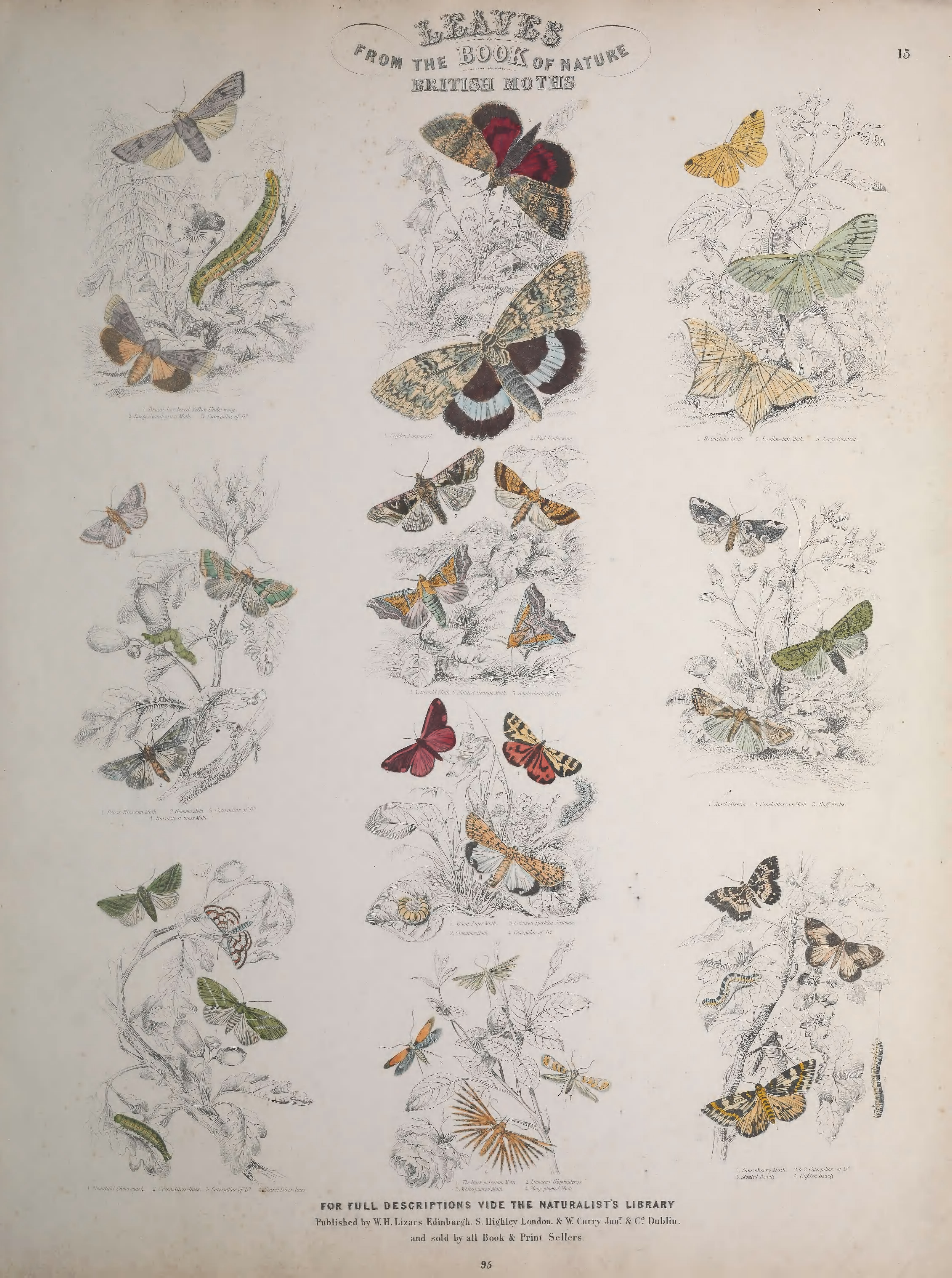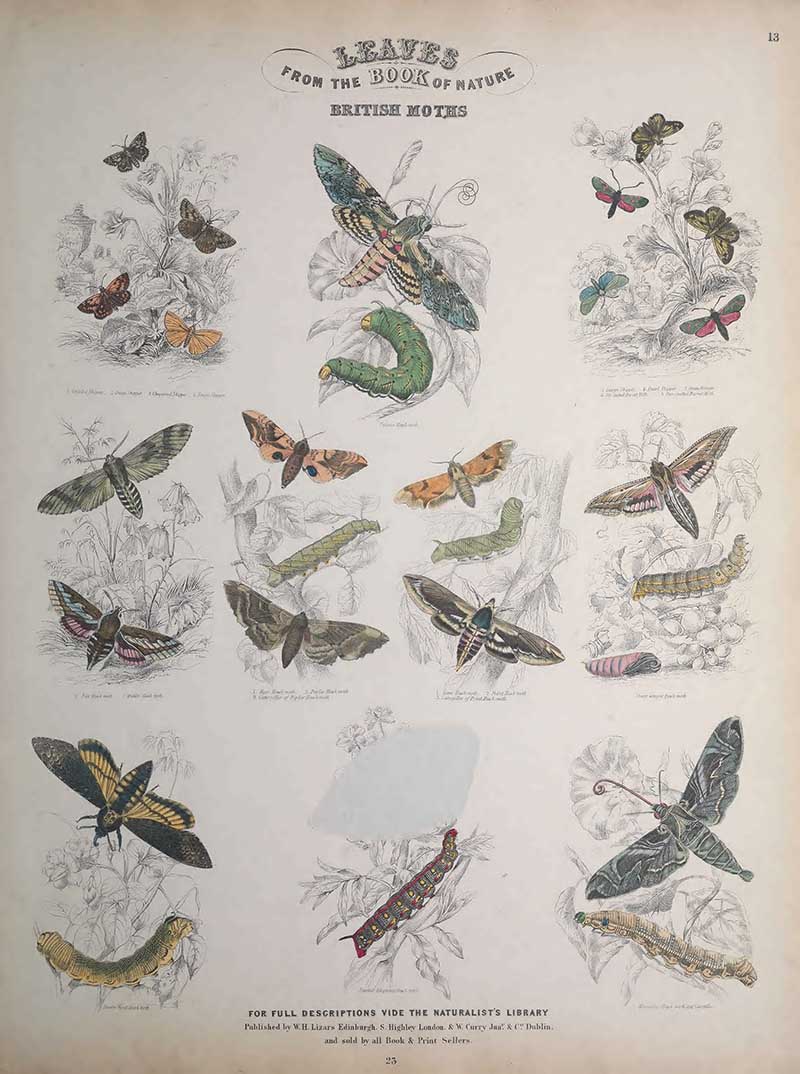 Although this is the same print as the one above, the colour saturation of the moths is noticeably different. It’s hard to say whether this variation comes from differences in the original printing or simply the result of the scanning process.