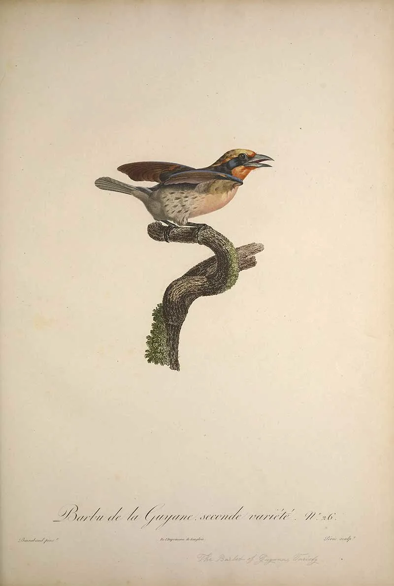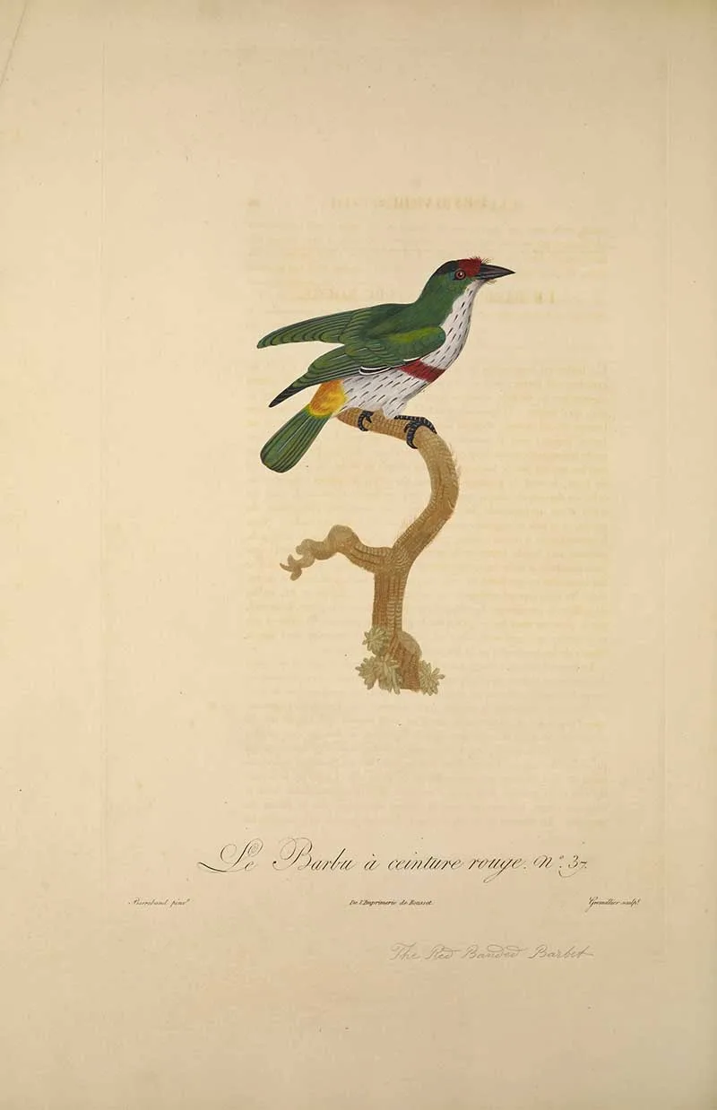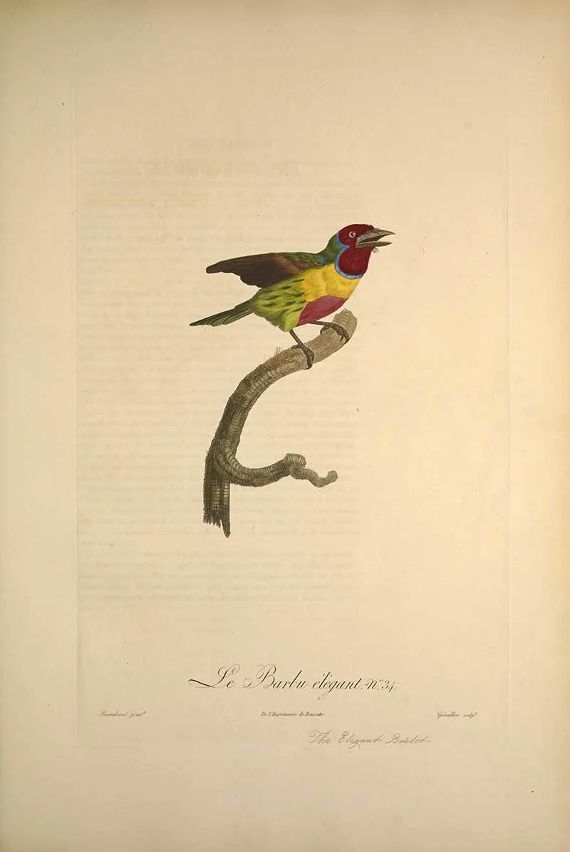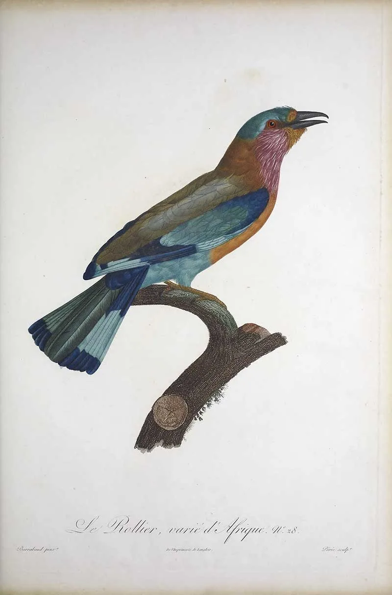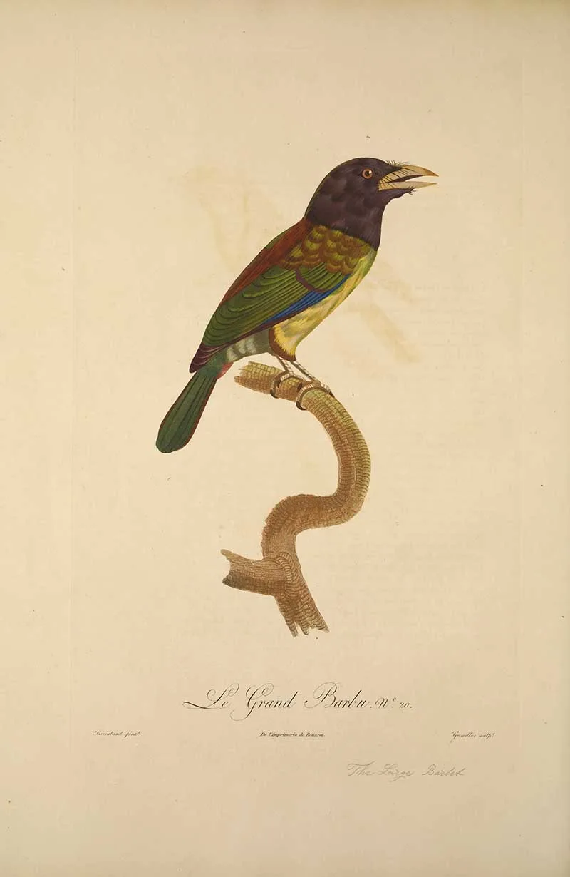 In this masterwork, Le Vaillant focuses on some of the most visually striking species: the ethereal birds of paradise, the vibrant rollers, and toucans and barbets known for their bold colours and distinctive patterns.