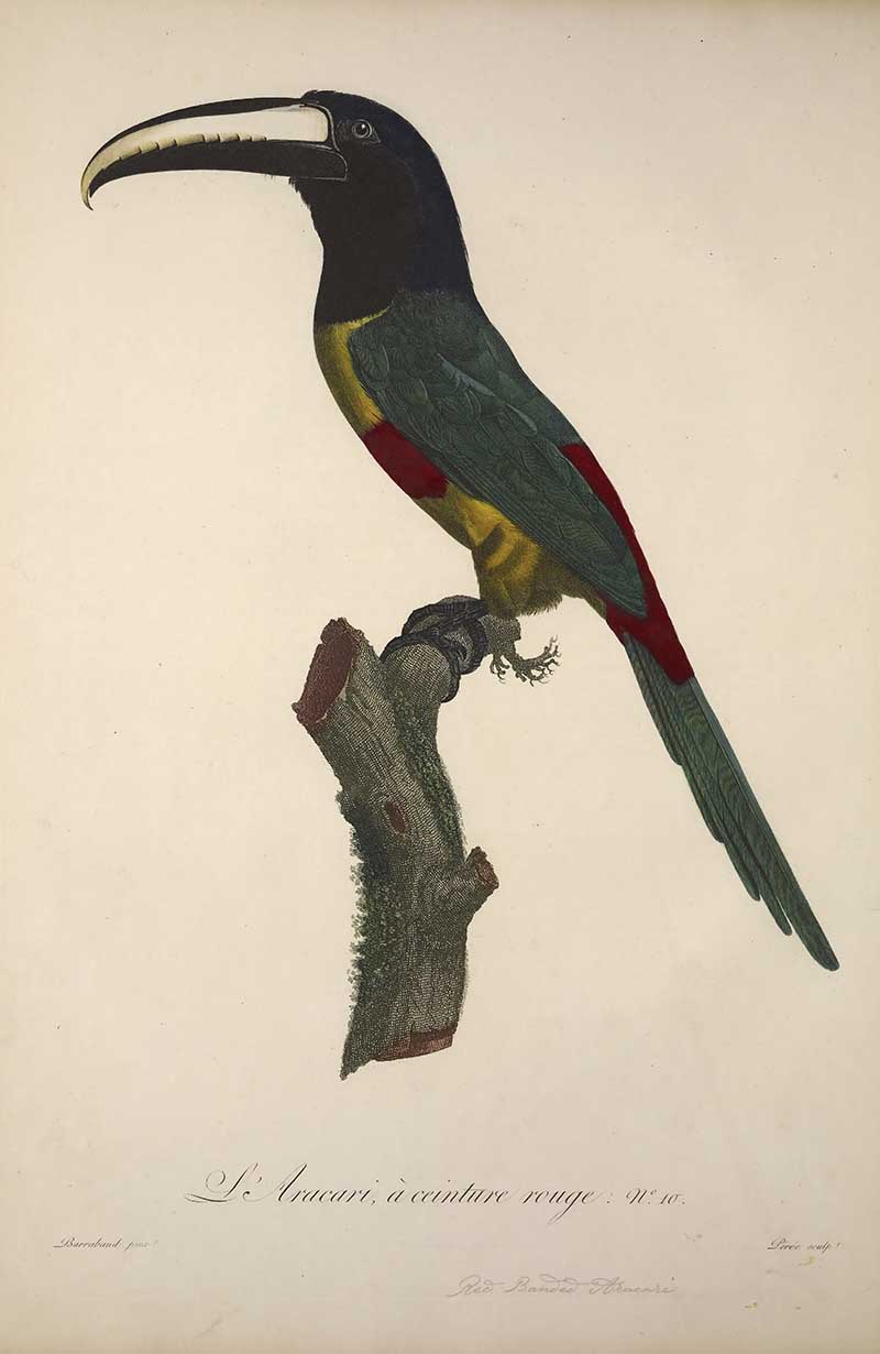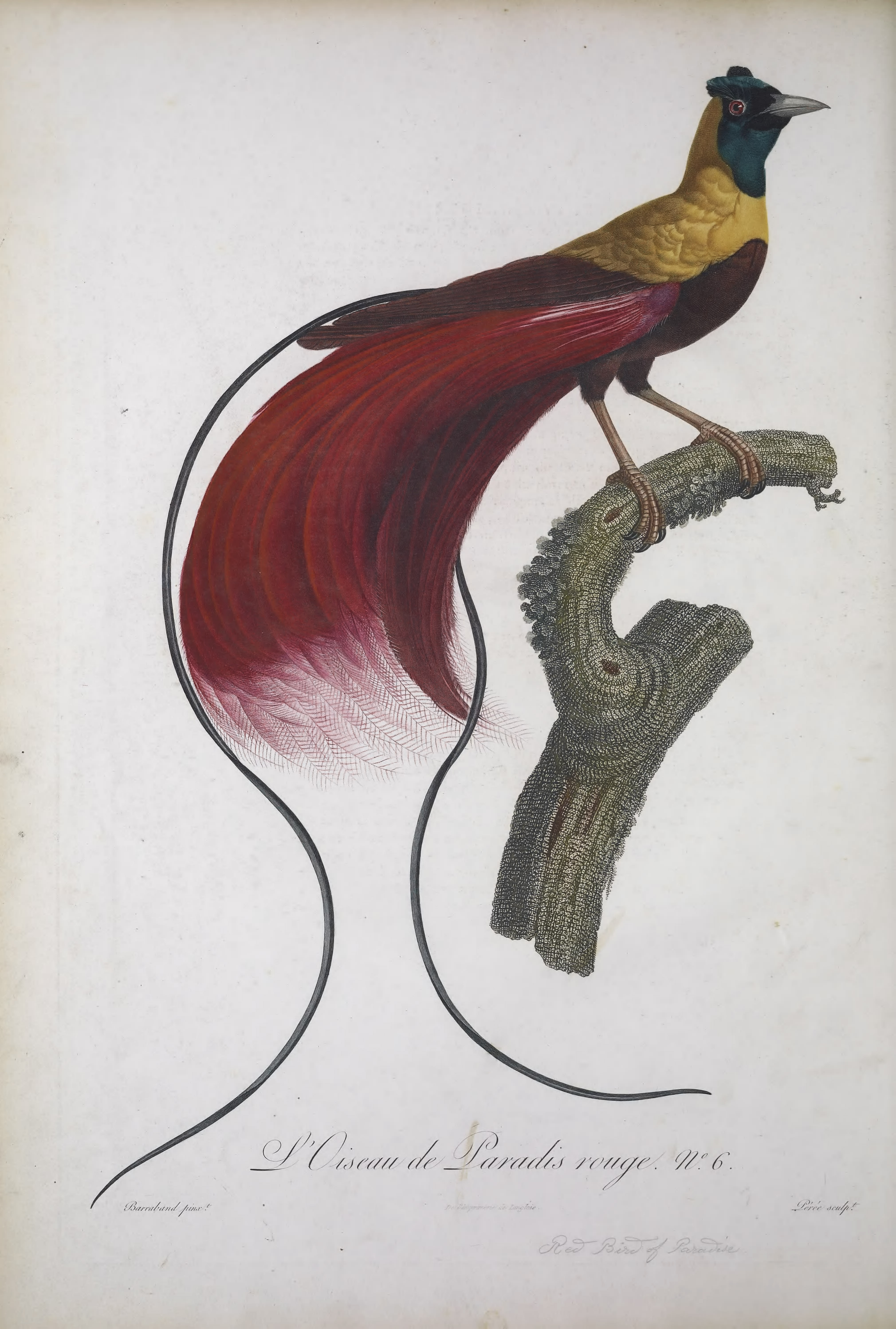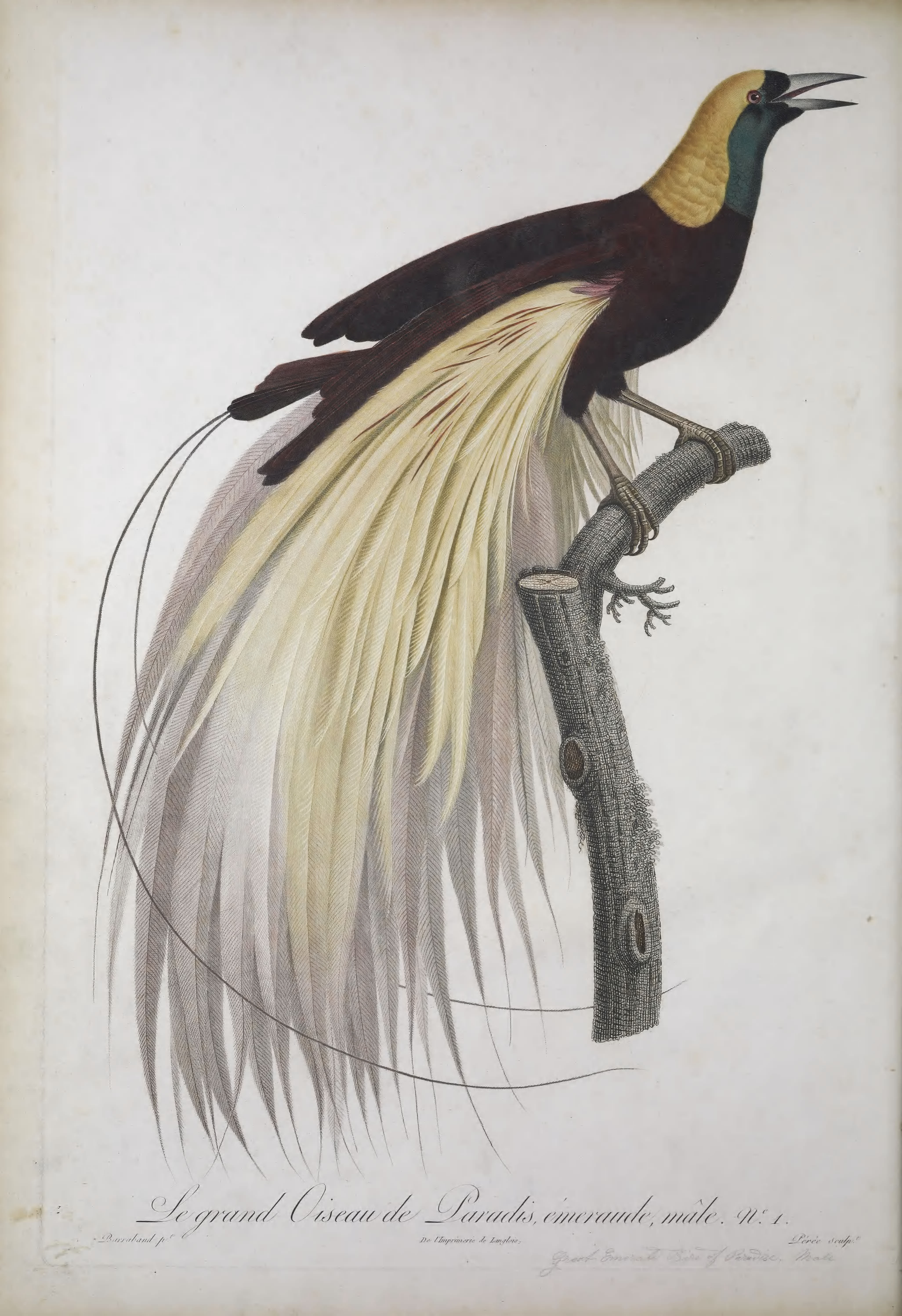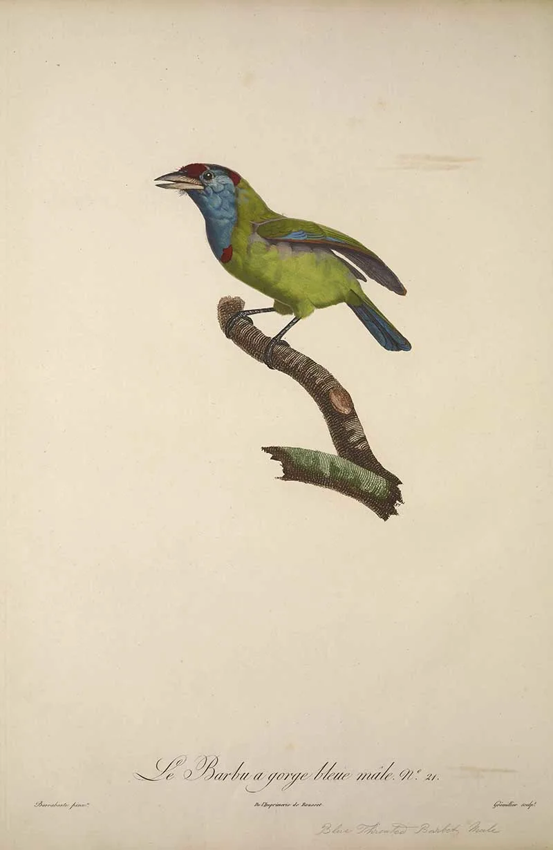 In this masterwork, Le Vaillant focuses on some of the most visually striking species: the ethereal birds of paradise, the vibrant rollers, and toucans and barbets known for their bold colours and distinctive patterns.