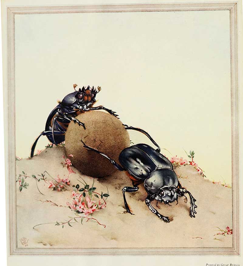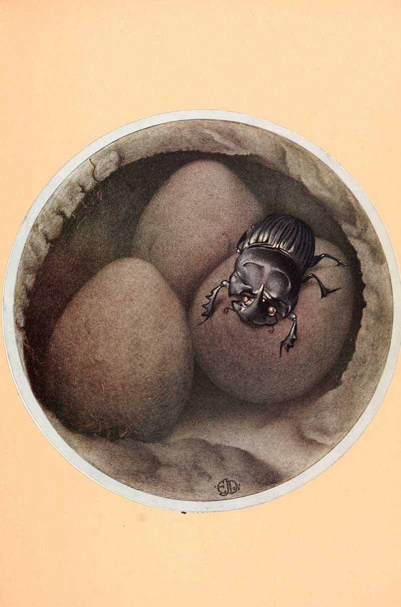 The Sacred Beetle, or dung beetle, fascinated Jean-Henri Fabre. He observed their diligent behaviour of rolling dung balls, which they use for food and laying eggs. Fabre admired their industrious nature and detailed their role in recycling nutrients into the soil.