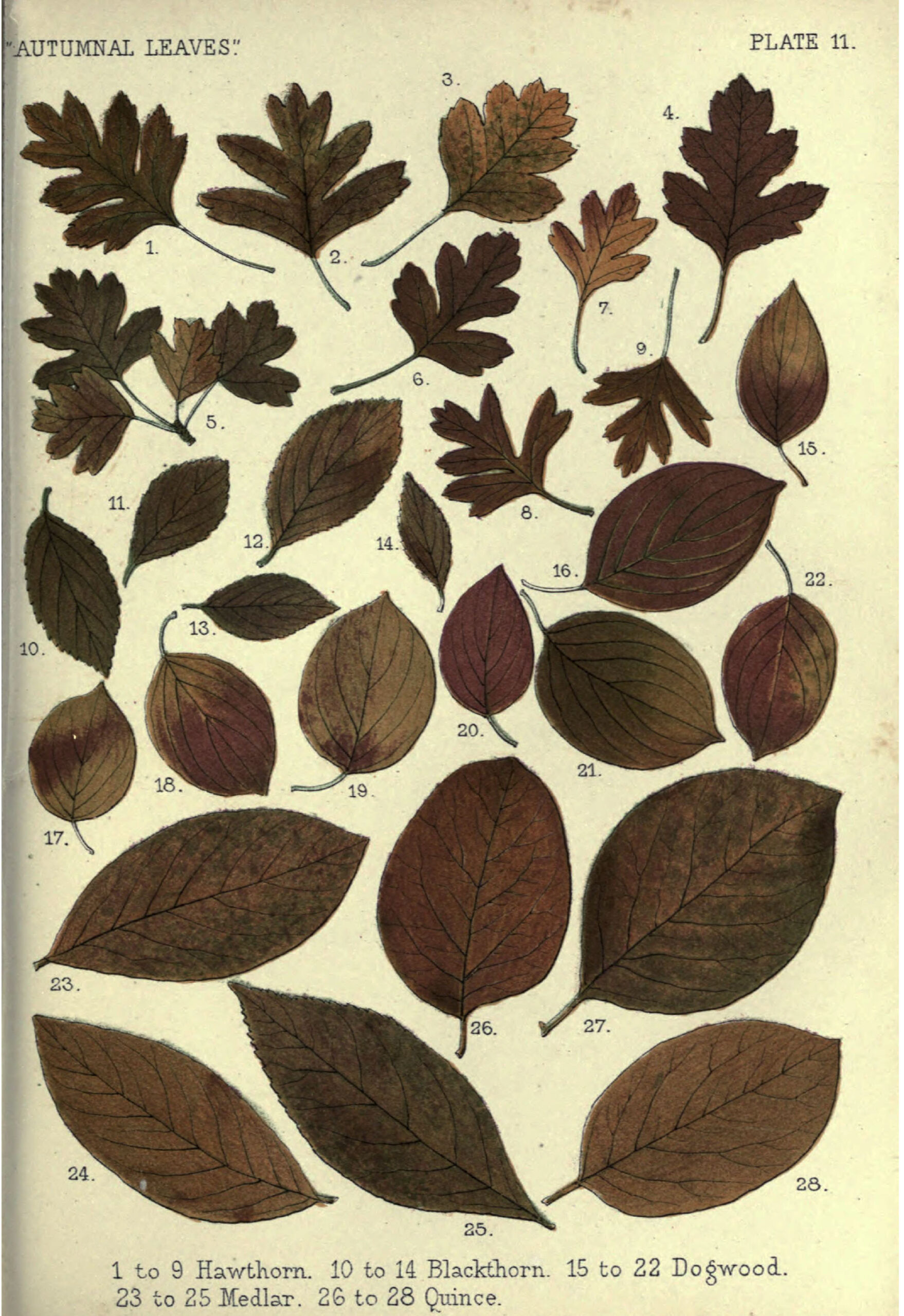 If you liked these autumnal and fall leaves prints and charts, there are many more related images in the botanicals section of Pictureboxblue. This Japanese nature post has a wonderful chart of leaf shapes and patterns.
