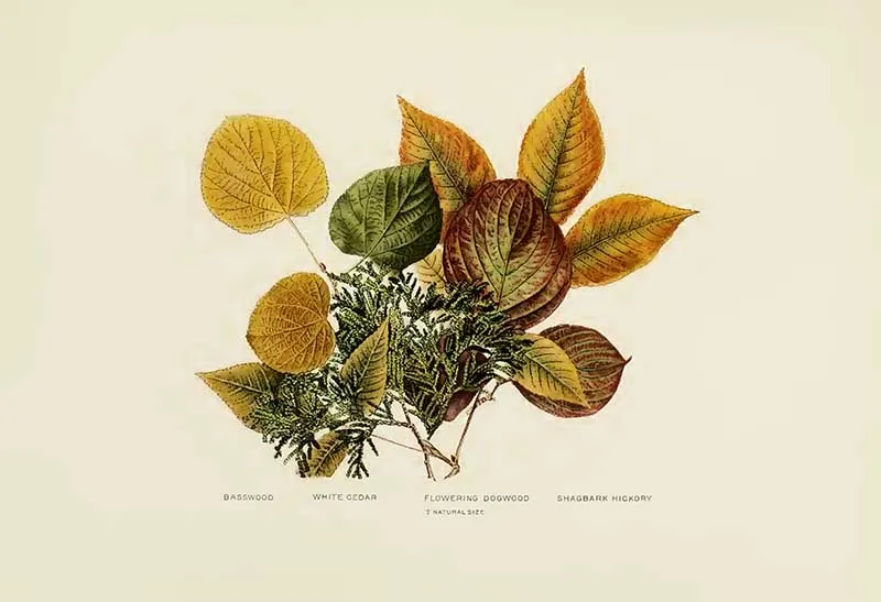 Basswood, White Cedar, Flowering Dogwood & Shagbark Hickory.