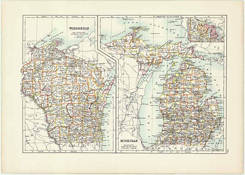 There is a scale drawn on each map and they are highly detailed giving county boundaries, county towns, railroads, and canals etc. The maps have been sharpened and cleaned up after scanning. They are beautifully printed and would look fantastic in a frame.