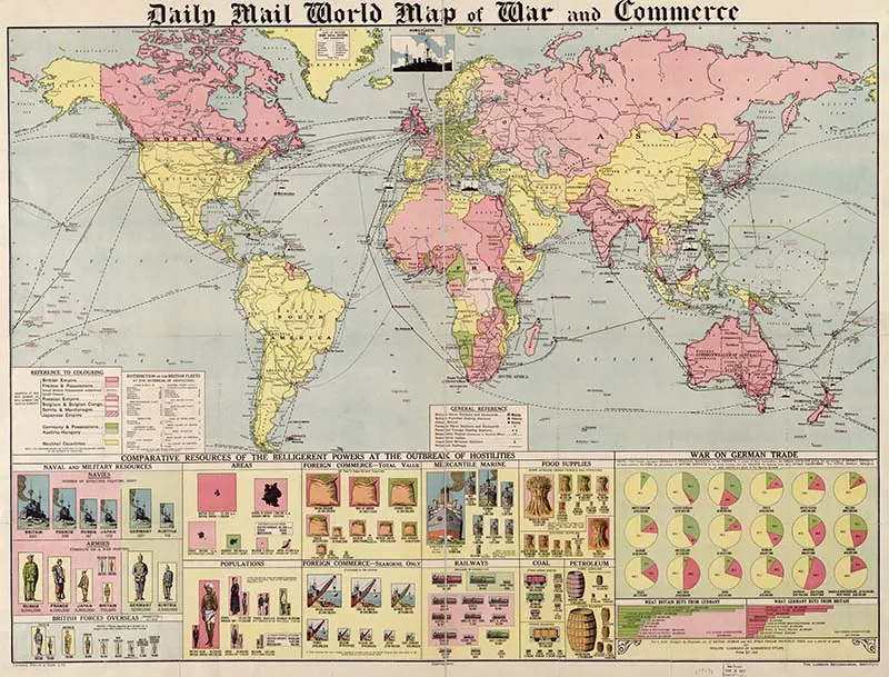 This map printed by the Daily Mail in 1917 is so much more than just an old world map. It shows the economical and political standing of the British and other major Empires at the breakout of World War I. This is also a very large map perfect for a huge wall display.