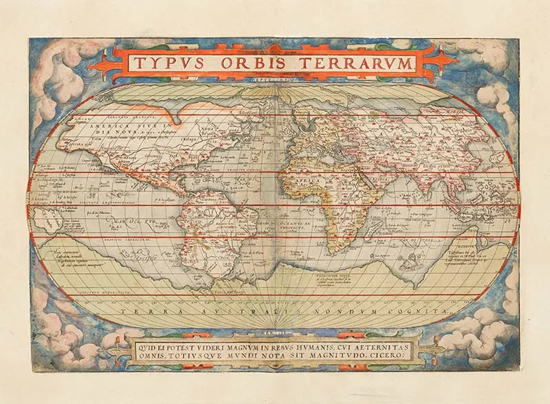This ancient world map is by the Dutch cartographer Abraham Ortelius and was published in the first modern atlas, the Theatrum Orbis Terrarum (Theatre of the World).