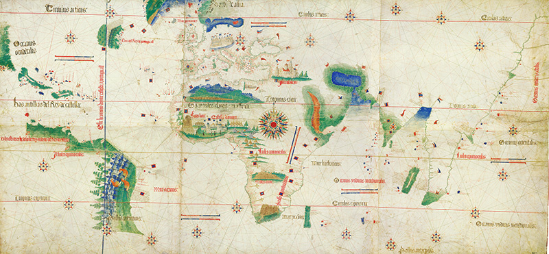 The Cantino planisphere is one of the most precious cartographic documents of all time. It depicts the world, as it became known to the Europeans after the great exploration voyages at the end of the fifteenth and beginning of the sixteenth century to the Americas, Africa and India. It was completed by a Portuguese cartographer in 1502.