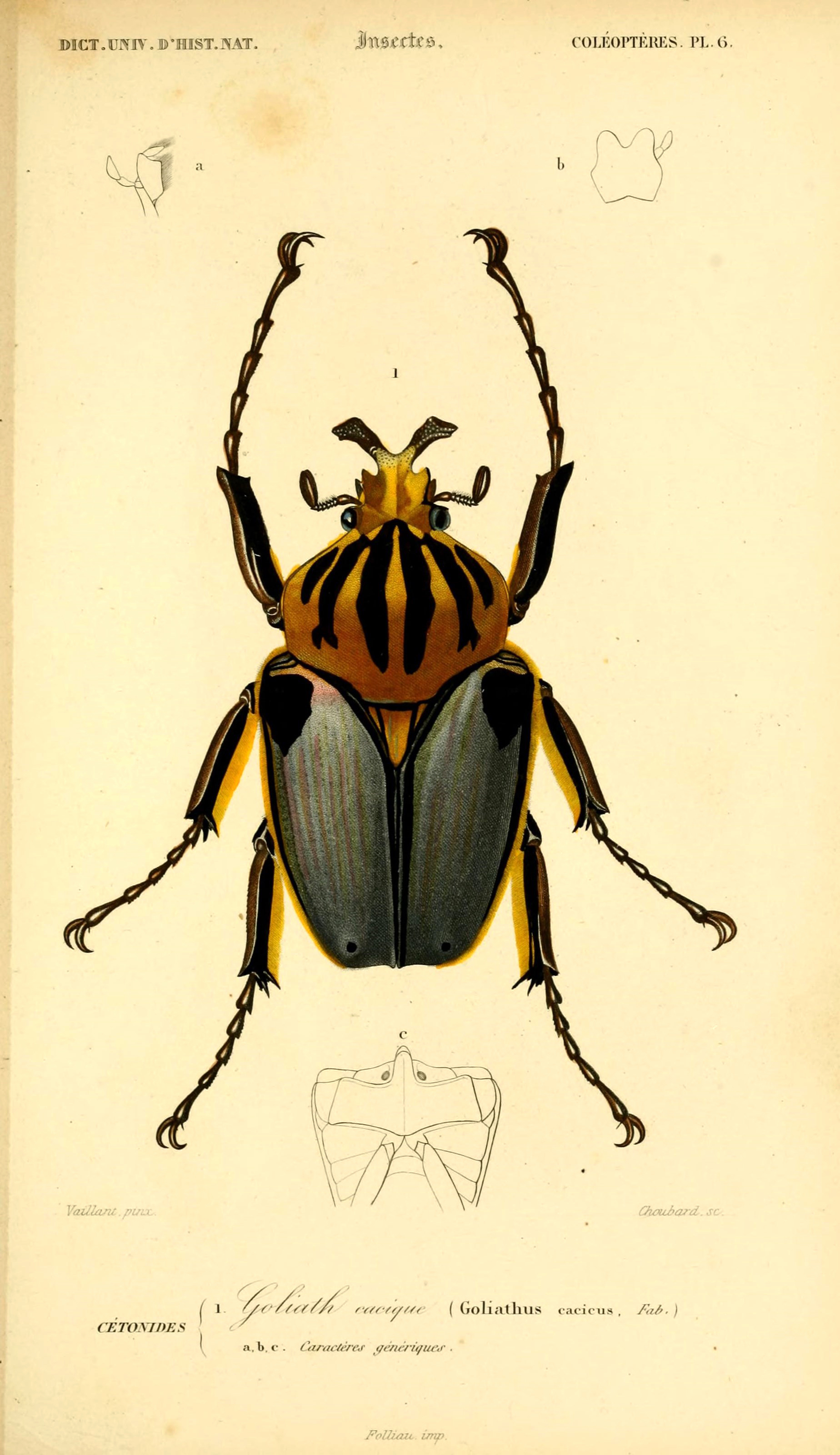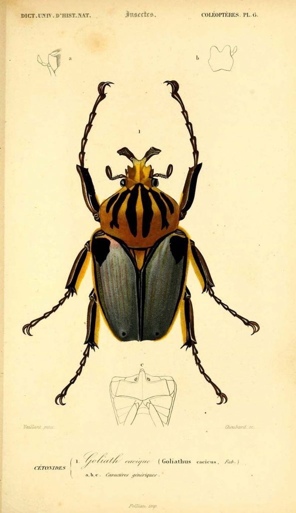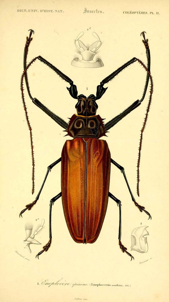 Another fabulous copyright free insect print from “Dictionnaire Universel d’Histoire Naturelle“, 1849. This time an illustration of the Giant Long Horn Beetle.