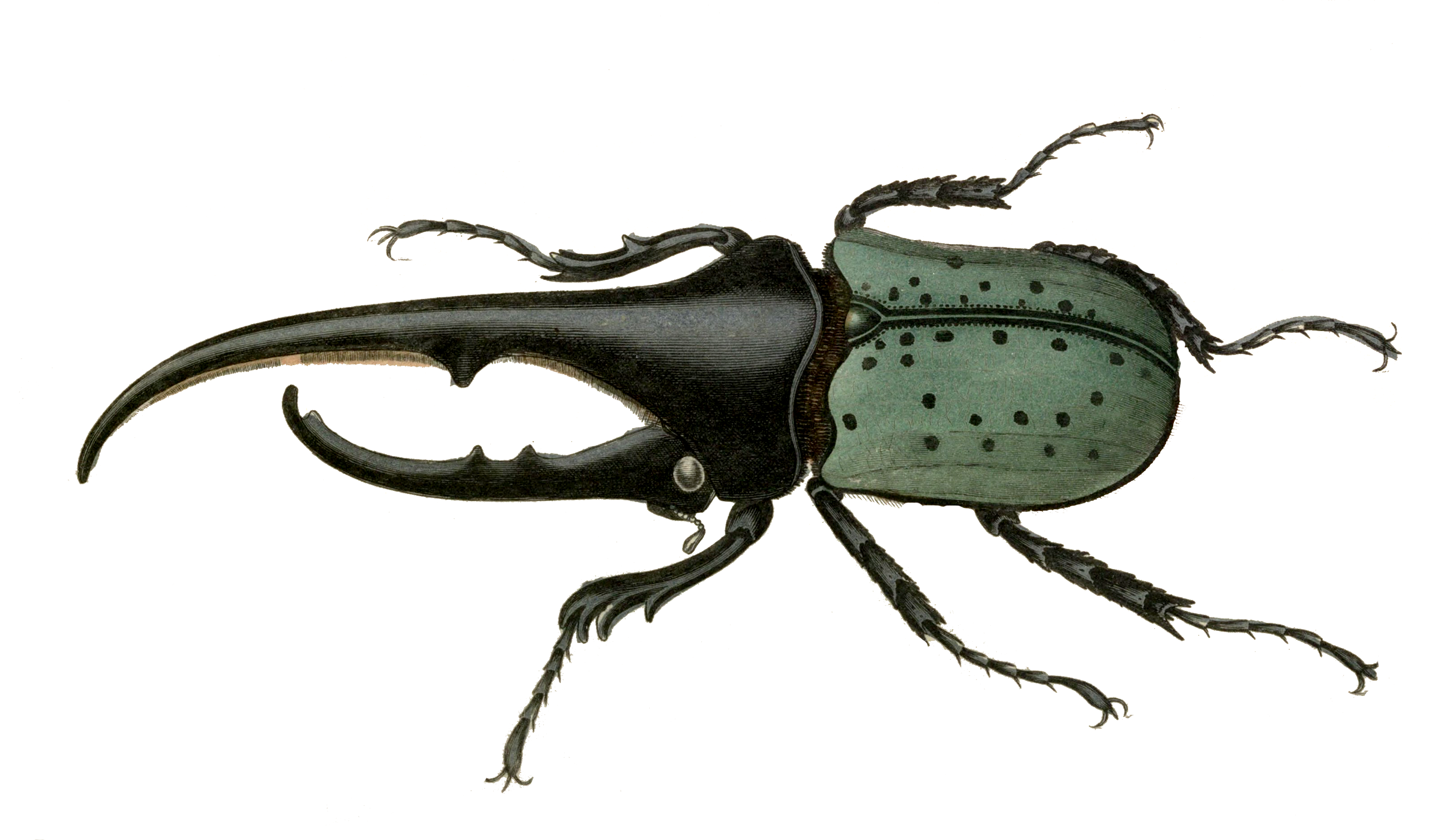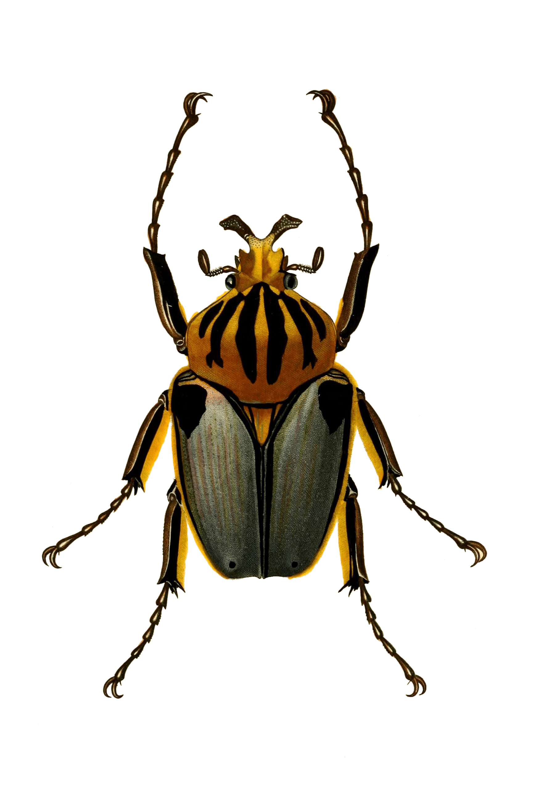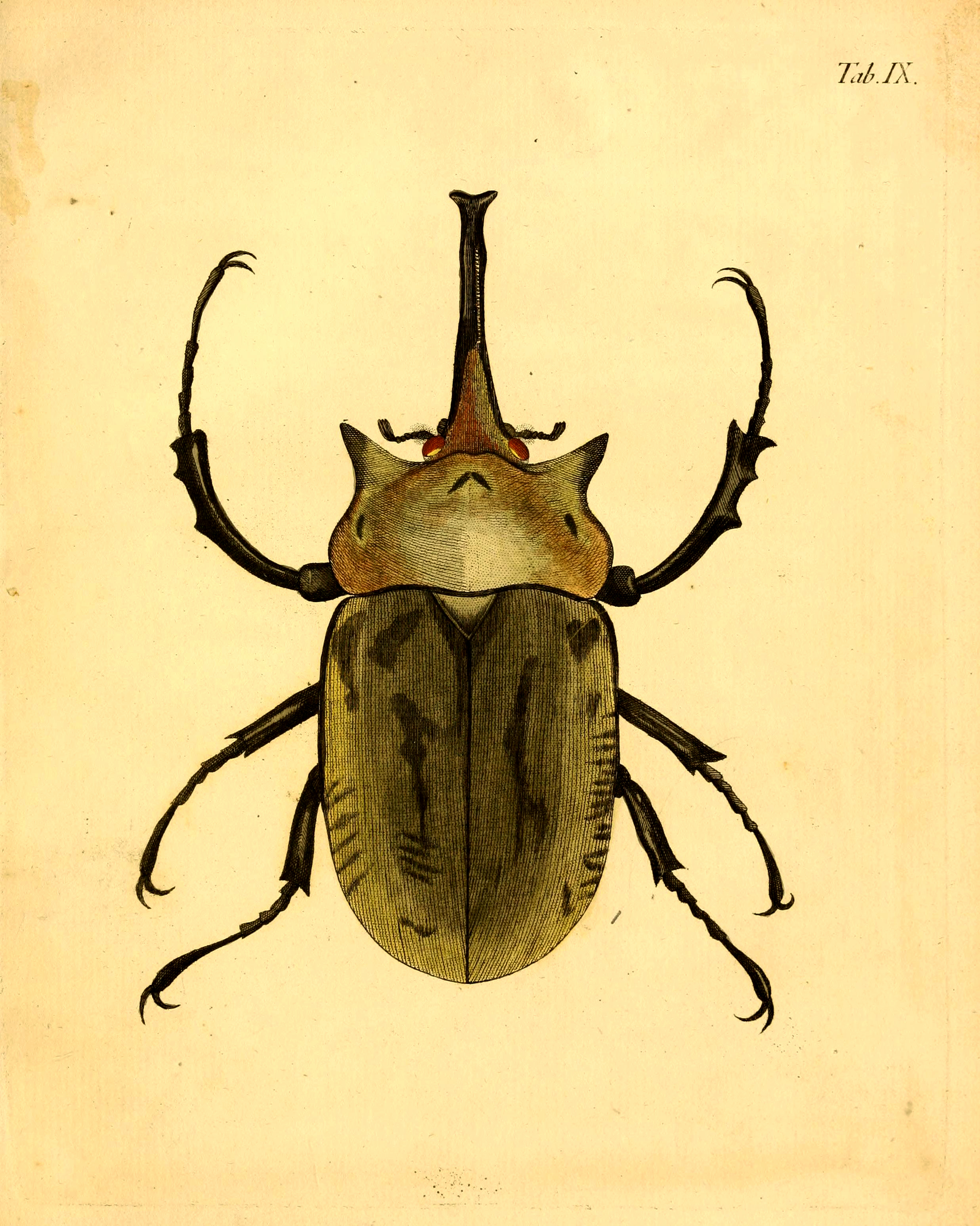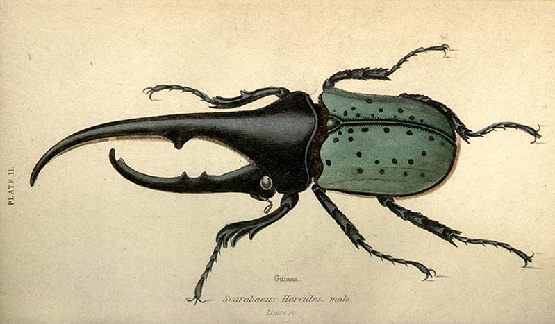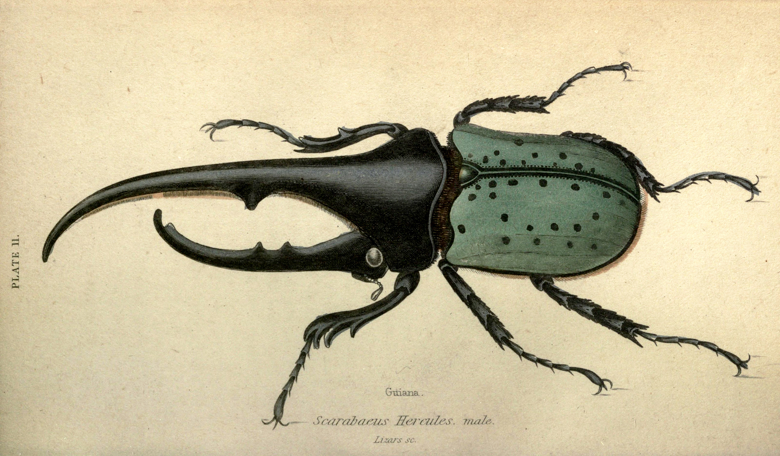 The caption on this wonderful free insect print may say, Scarabaeus Hercules, however, that particular beetle is now known as Dynastes Hercules. The Dynastes Hercules beetle is a species of rhinoceros beetle native to the rainforests of Central America and South America. It is one of the largest flying insects in the world.