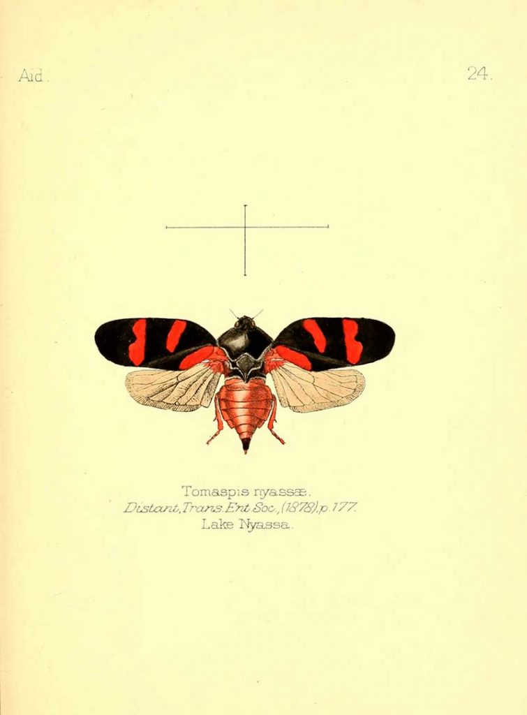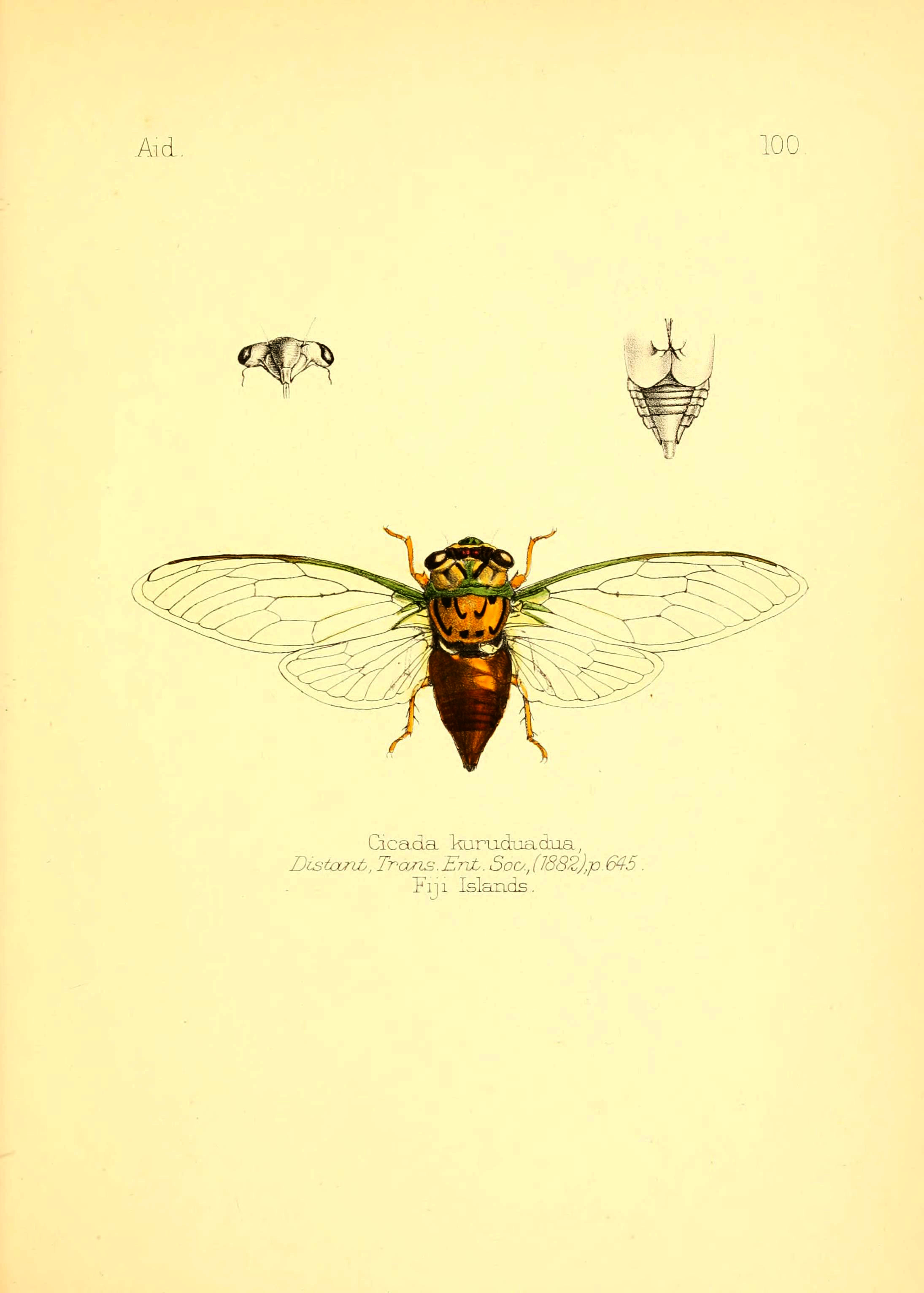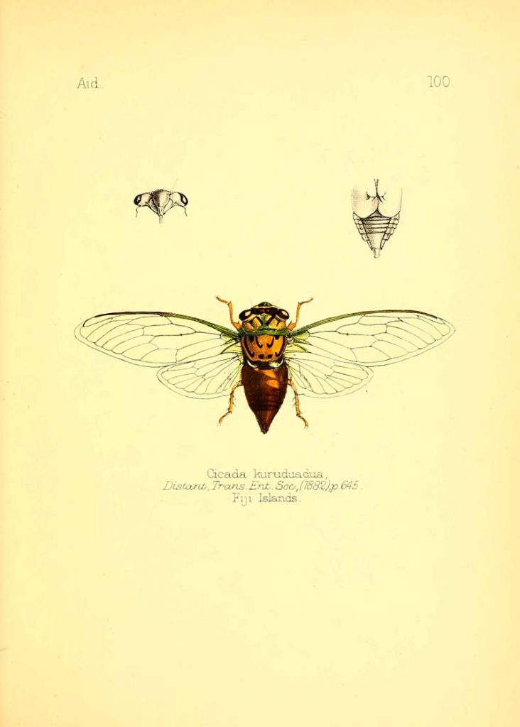 A cicada, native to Fiji. This lovely copyright free insect print is from the book “Aid To The Identification Of Insects” by Charles Owen Waterhouse published 1880-1890.
