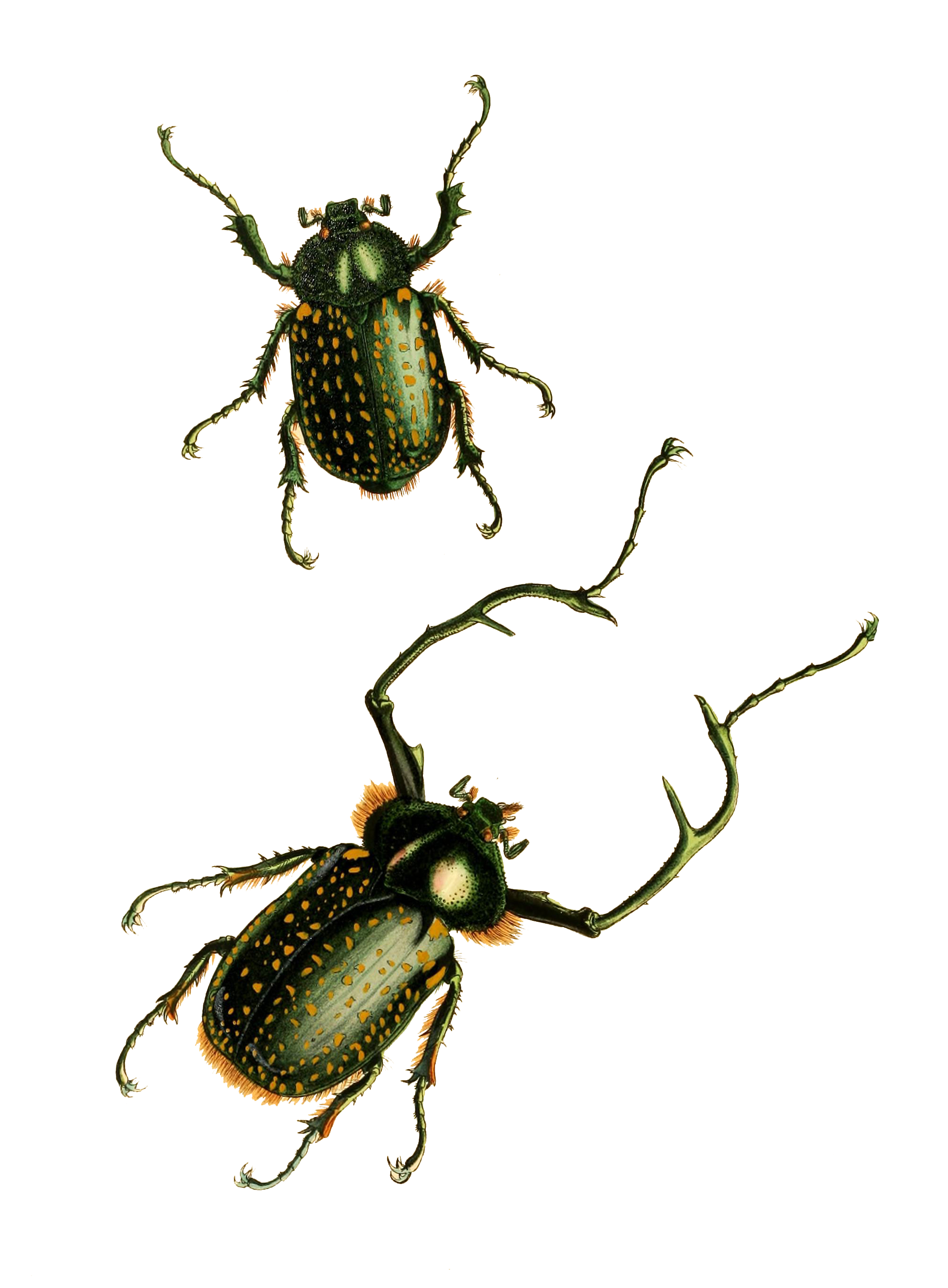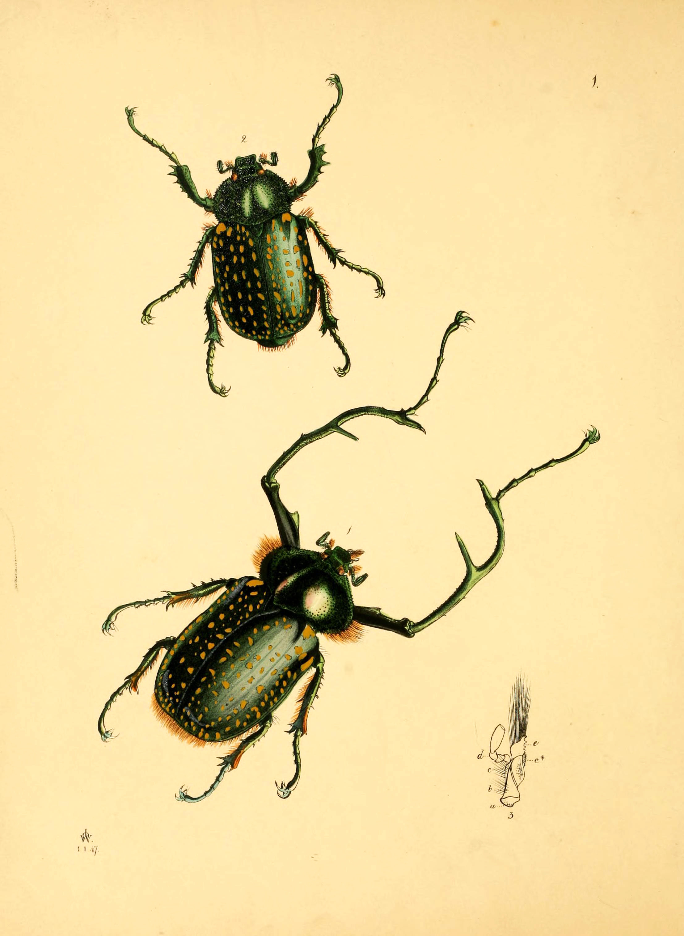 An illustration of beautiful scarab from India. The print is from “The Cabinet of Oriental Entomology“. Published in 1848 by J. Westwood.