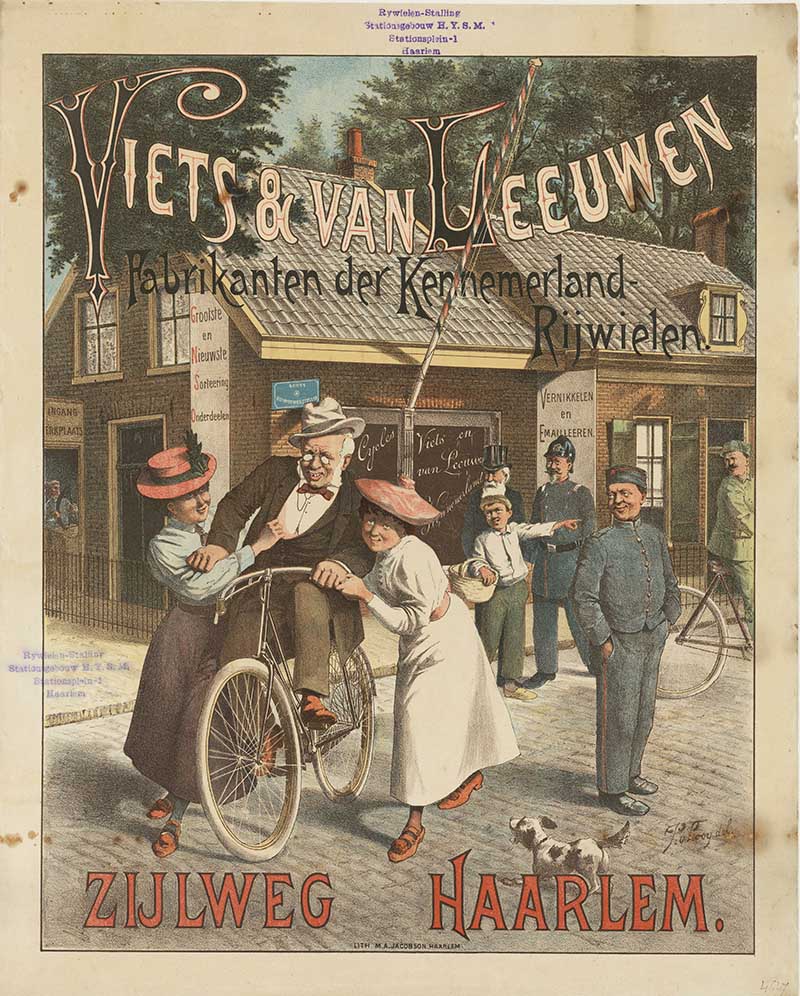 A poster designed by Pieter van Looij (Netherlands) around 1900 showcases a caricature of an old man being held on a bicycle by two younger women, with various onlookers in the background. This poster reflects the playful and engaging advertising style of the time.