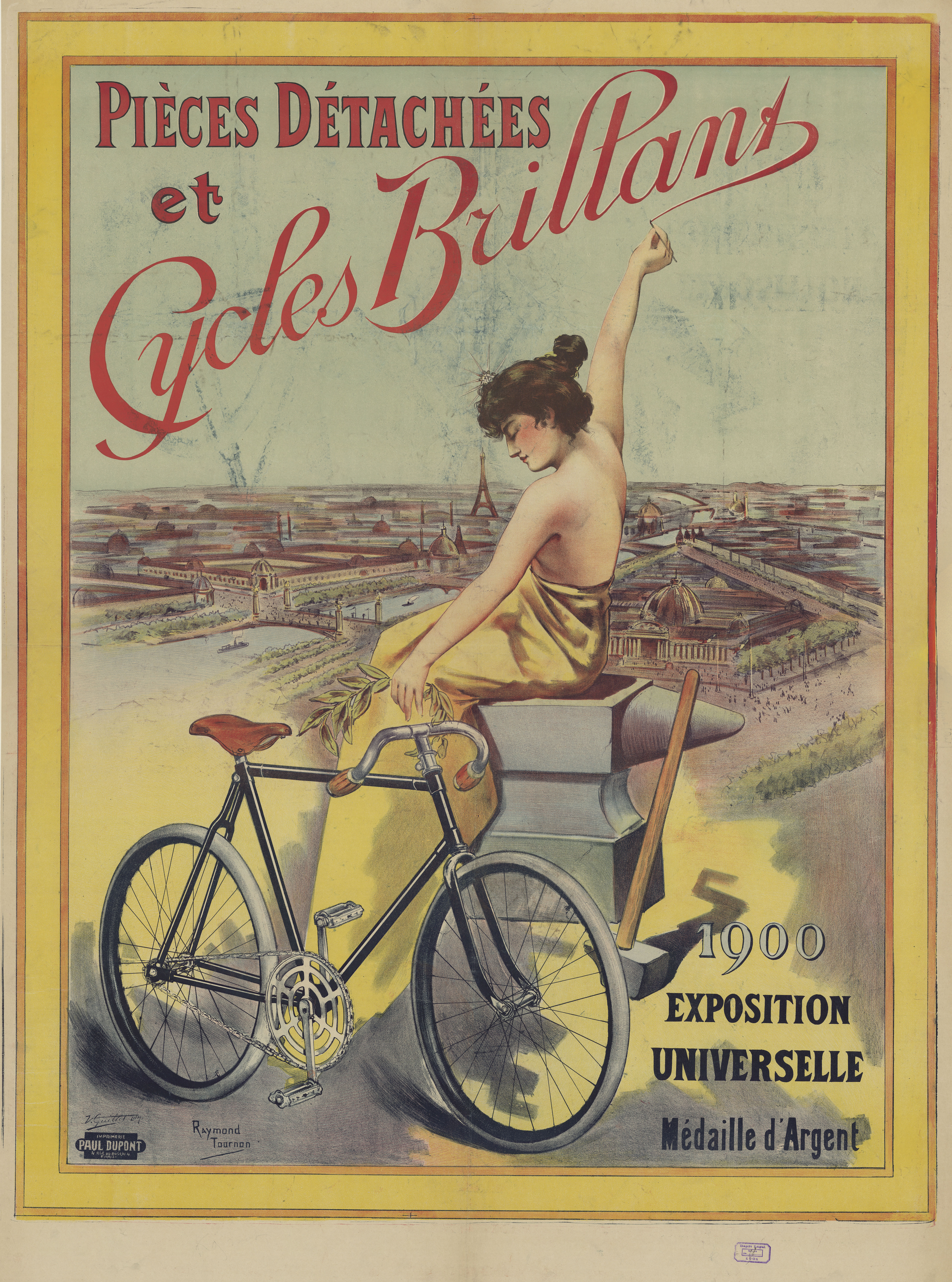 This vintage poster, created by French artist Raymond Tournon (1870-1919), was designed for the 1900 Exposition Universelle in Paris, where it won a silver medal. The poster promotes “Pièces détachées et Cycles Brillant,” showcasing bicycle parts and cycles.
