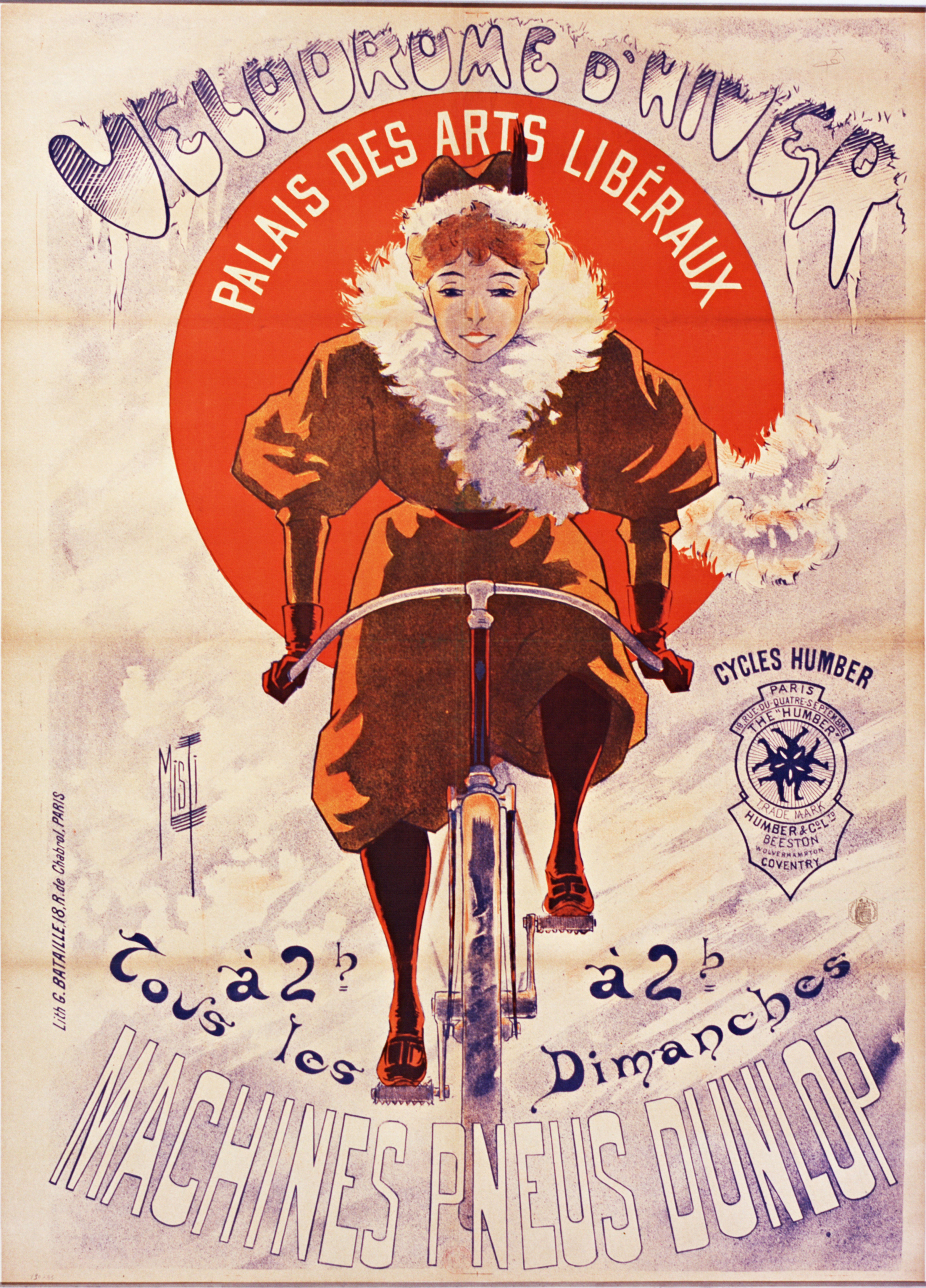 A poster for the Winter Velodrome at the Palace of Liberal Arts, sponsored by Dunlop tyres.