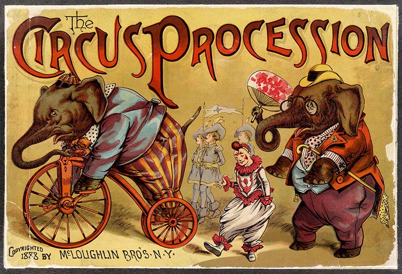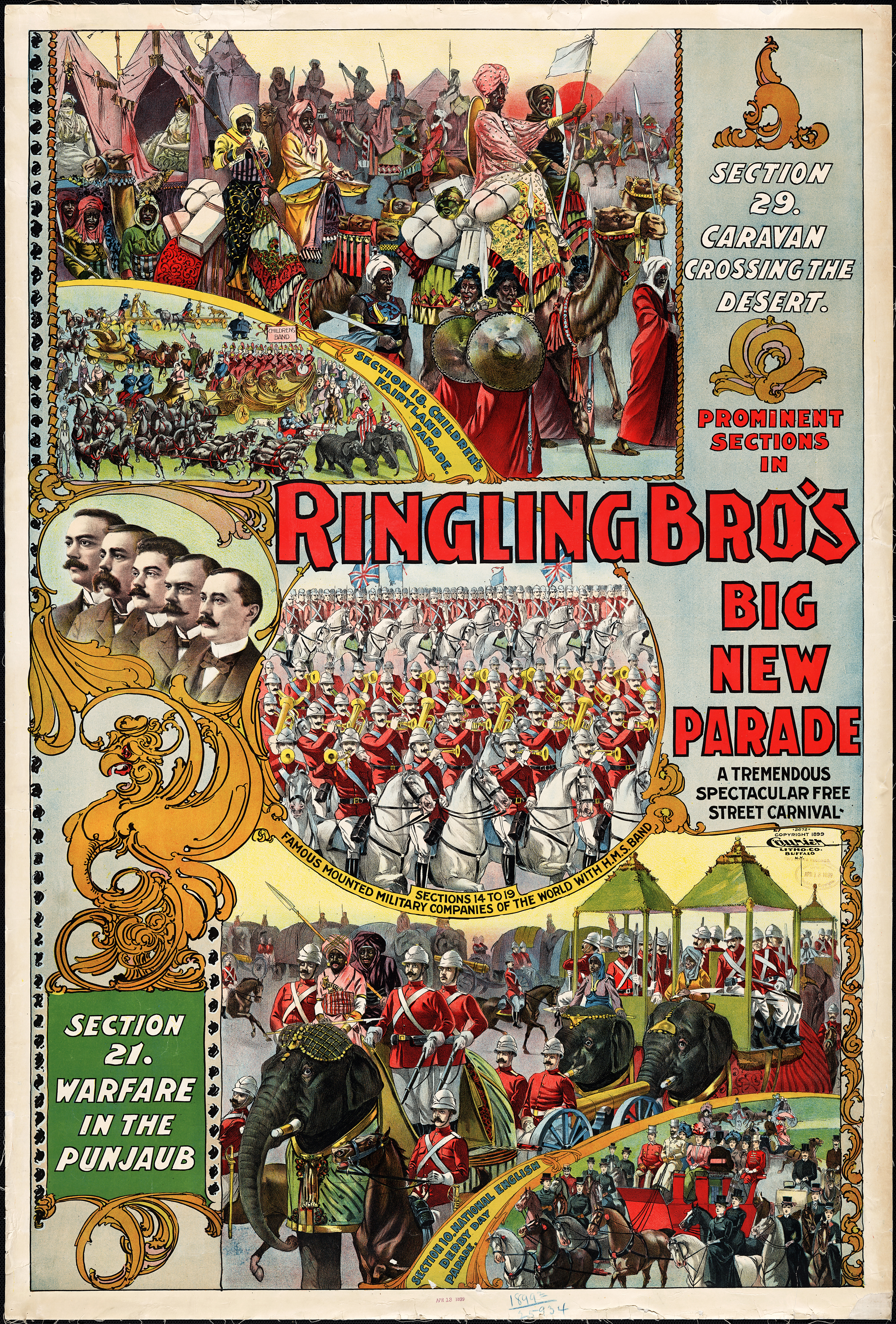 A fabulous large old circus poster (1899) showing five separate parades of people in costume and animals. The parade represents a “caravan crossing the desert,” “children’s fairyland,” “famous mounted military companies of the world,” “warfare in the Punjab,” and “national English derby day.”