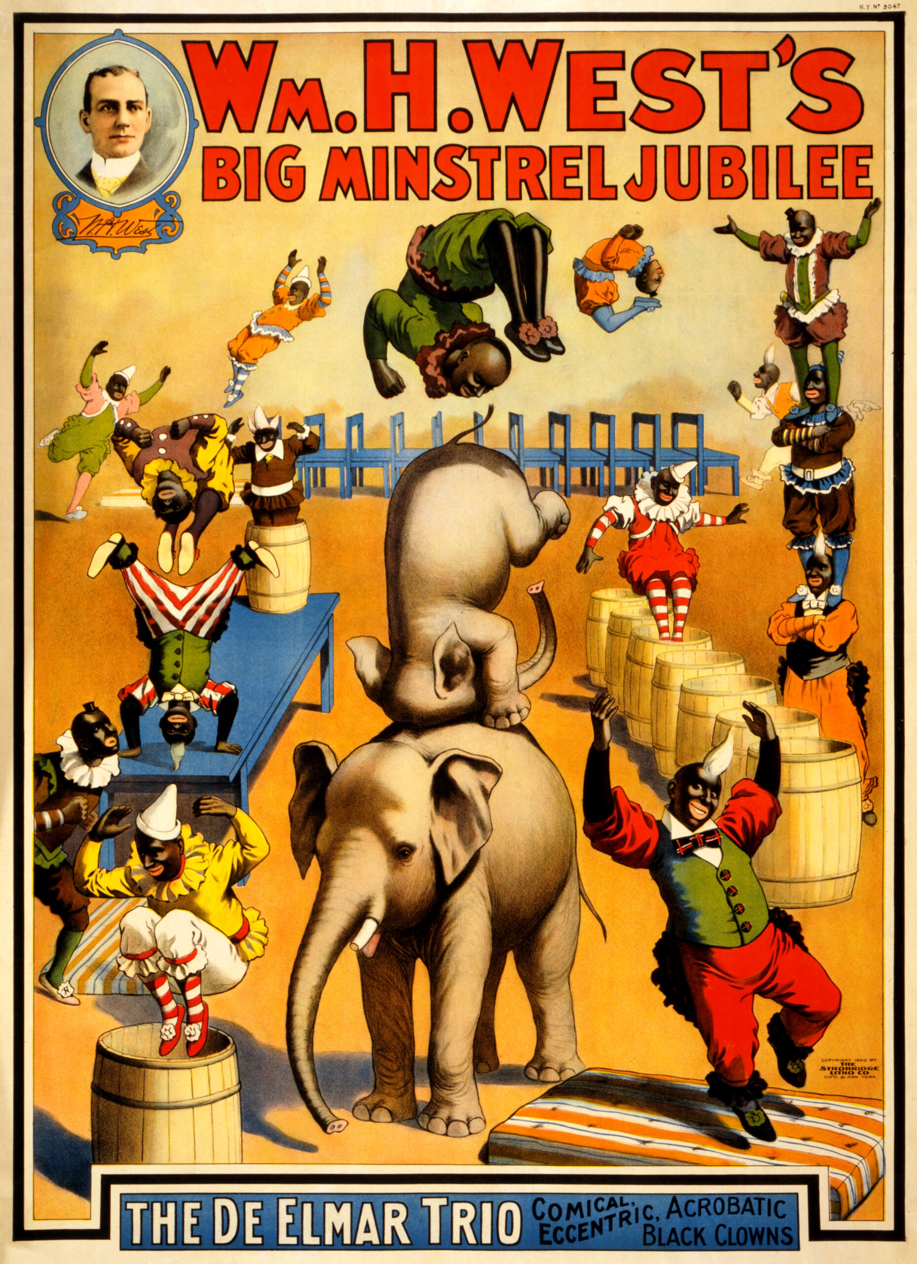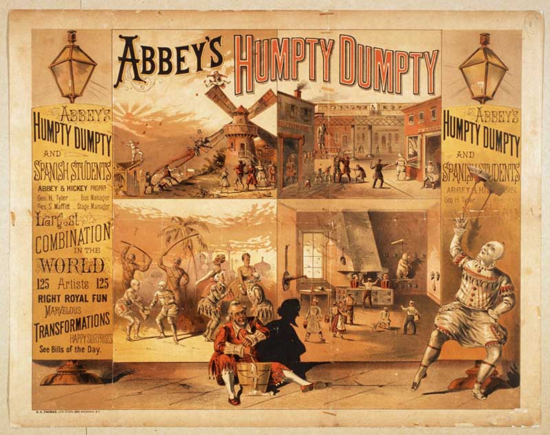An advertisement poster for an American pantomime company called Humpty Dumpty, organized by Abbey & Hickey. The pantomime was a British art form with two parts: a highly stylized harlequinade that involved clown characters derived from older Italian forms, and a slapstick, zany musical theatre component based on a fairy tale or folk tale.
