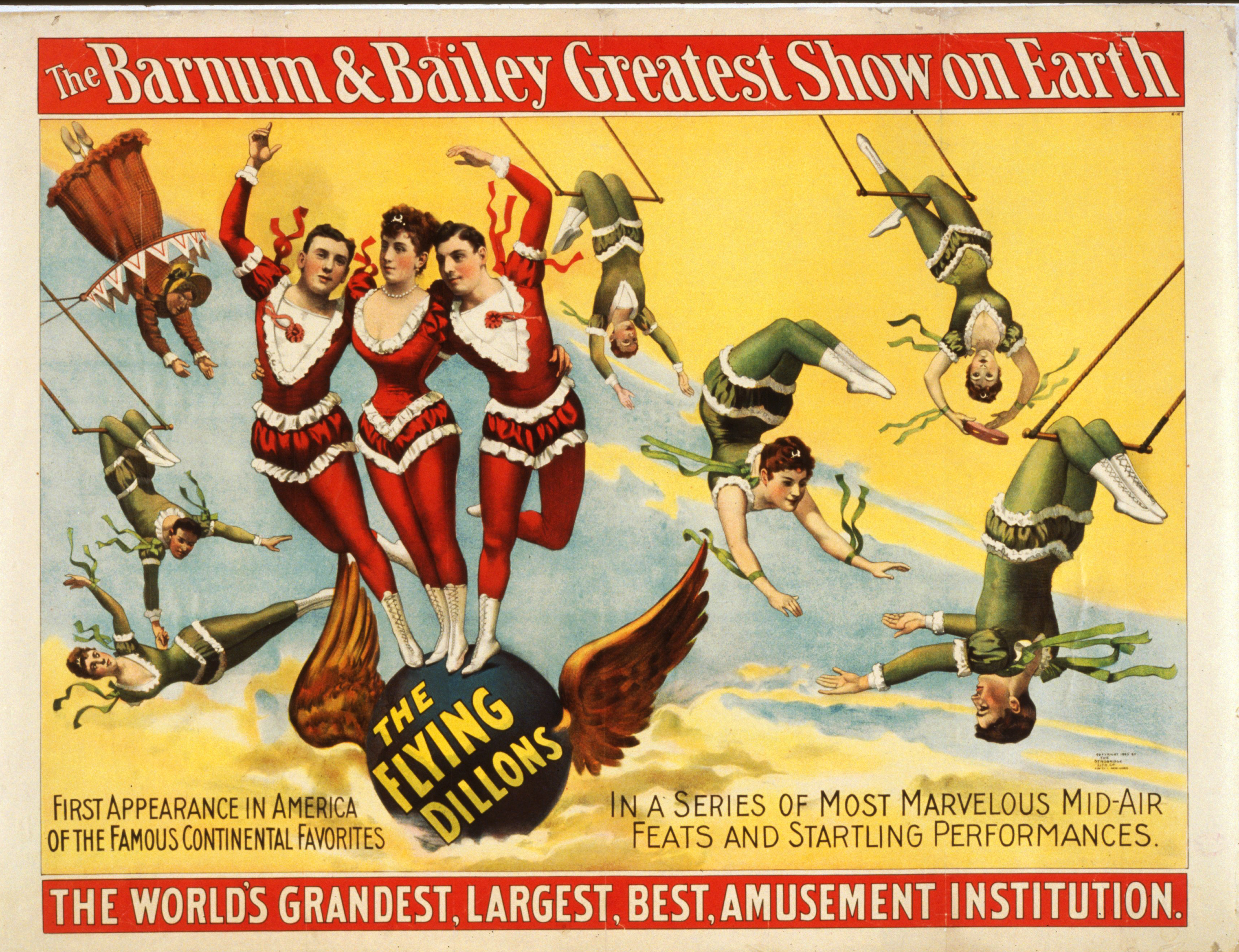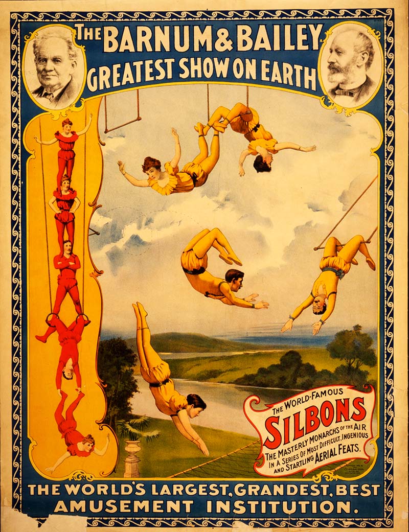 An old circus poster of Barnum & Bailey advertising the Silbons flying trapeze artists. The caption on the poster reads “The Barnum & Bailey Greatest Show on Earth – The world-famous Silbons, the masterly monarchs of the air, in a series of most difficult, ingenious and startling aerial feats – The World’s Largest, Grandest, Best Amusement Institution”.