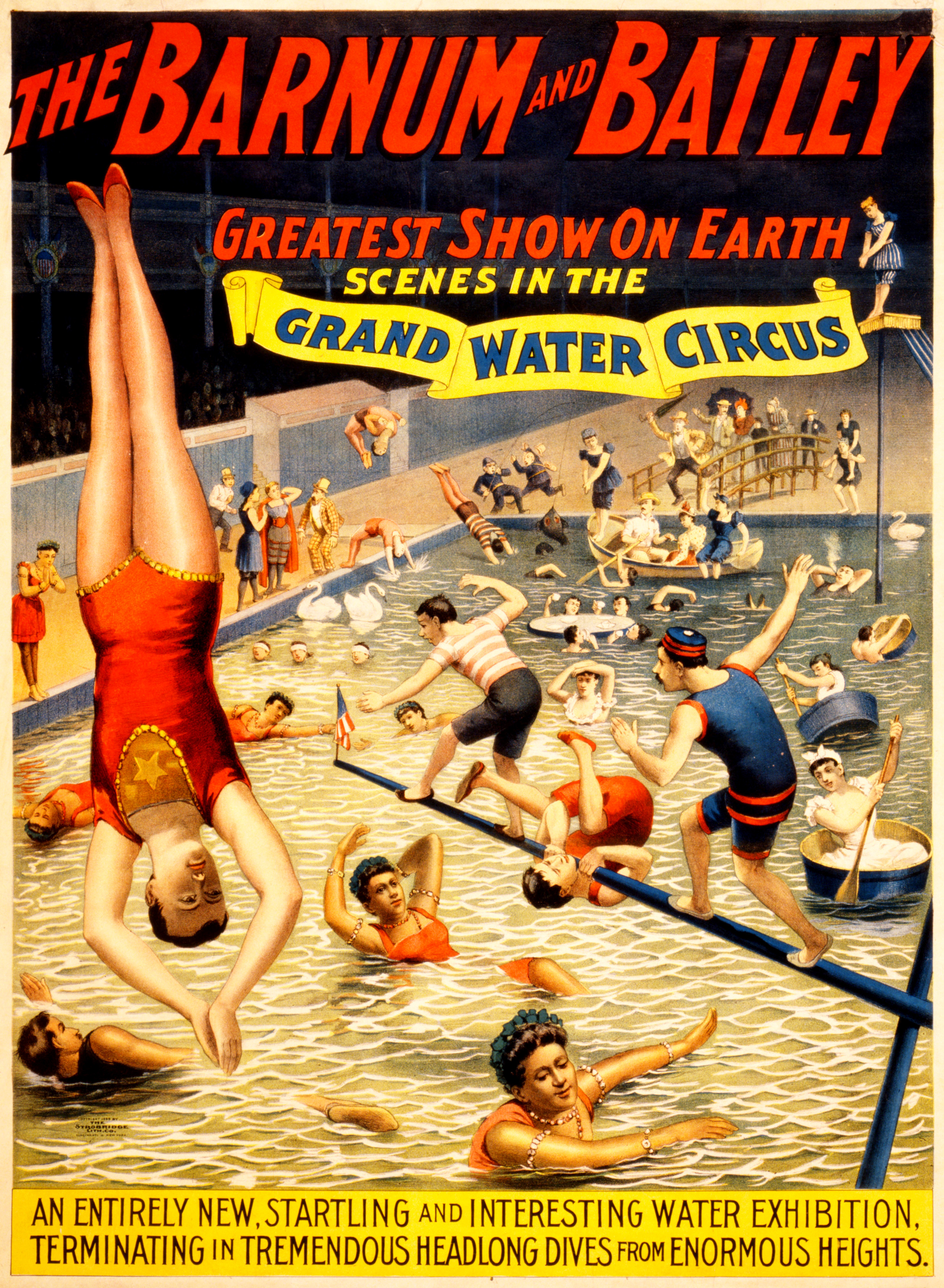 A fabulous advertising poster from Barnum & Baily’s “The Greatest Show On Earth”. The poster shows performers diving from great heights into shallow waters and clowns in the ocean at Coney Island, New York.