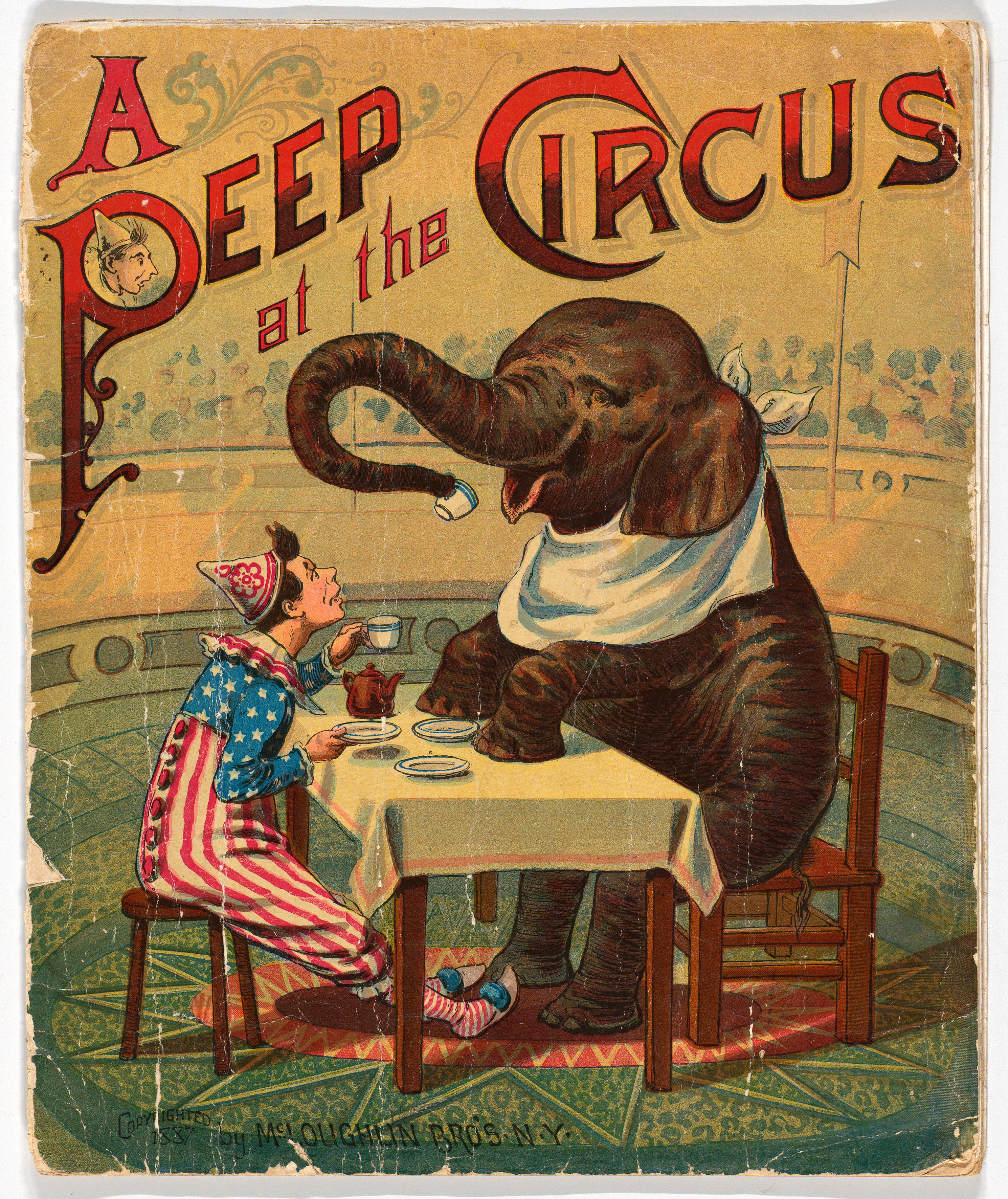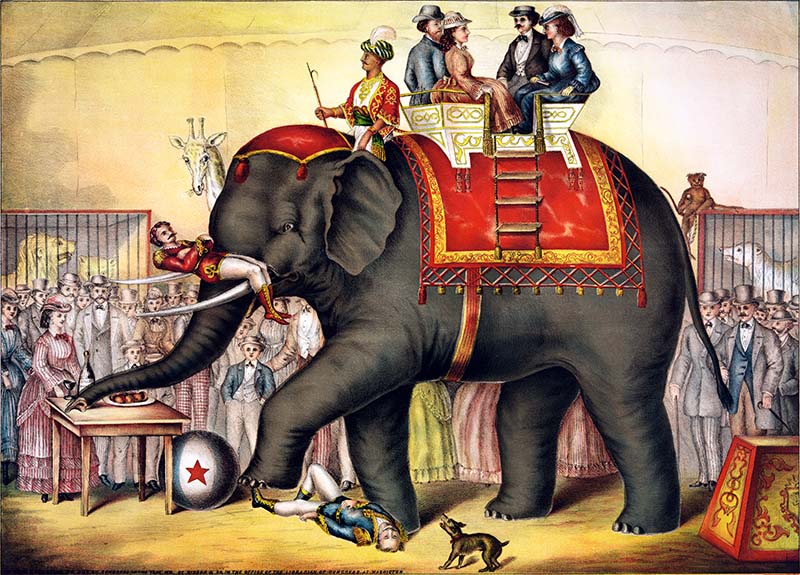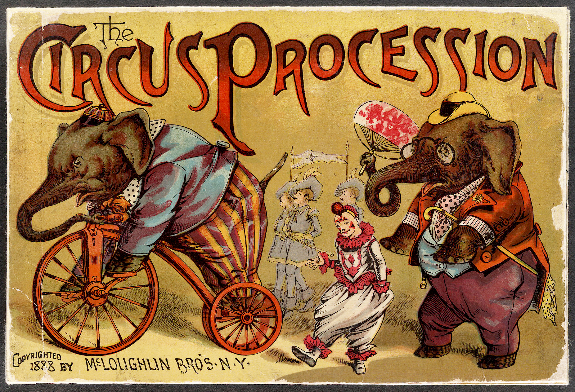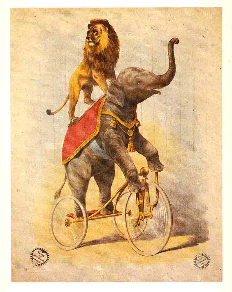 A rather impressive vintage circus illustration of an elephant riding a bike with a lion on it’s back.