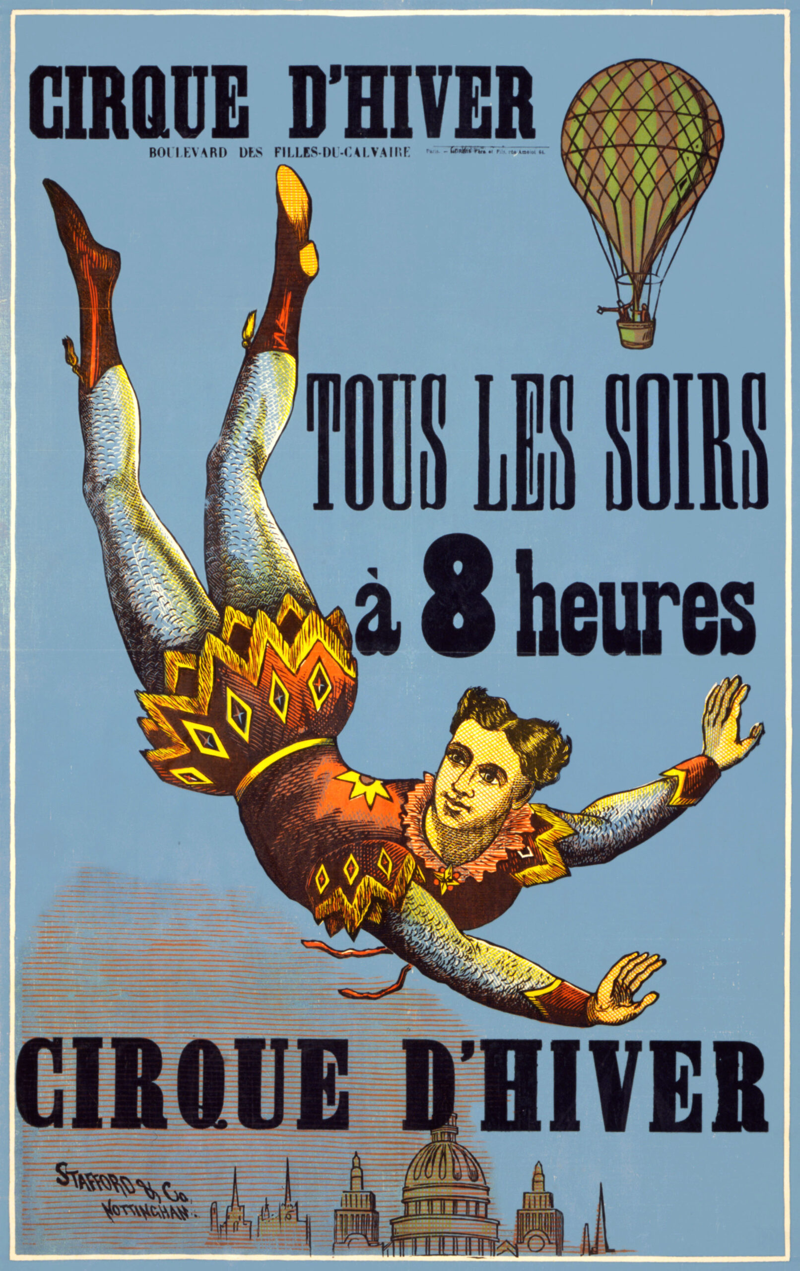 A vintage poster for Cirque d’Hiver (winter circus) shows an aerialist floating with arms outstretched above a city skyline with a hot air balloon in the background.