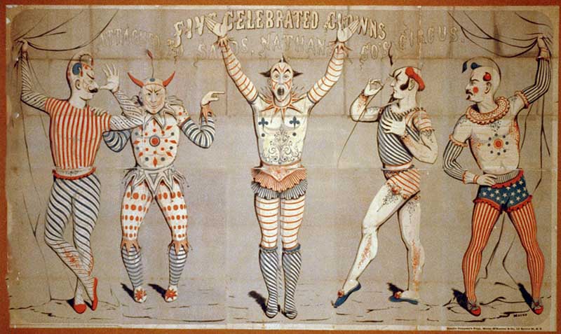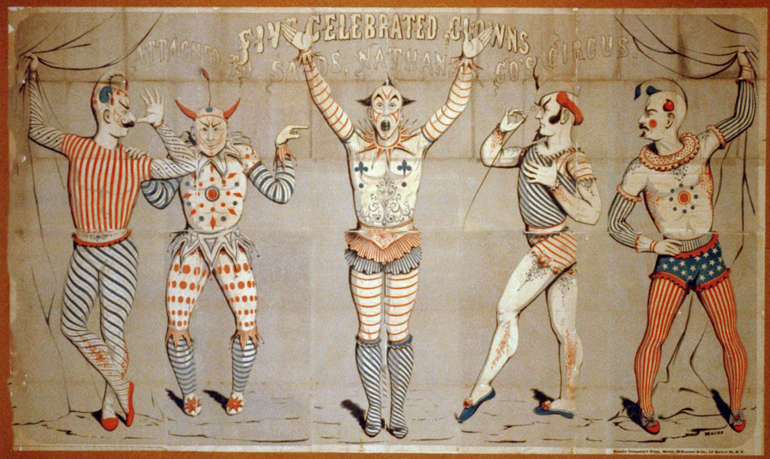 Five celebrated clowns attached to Sands, Nathans Co’s Circus 1856. From the Library of Congress.