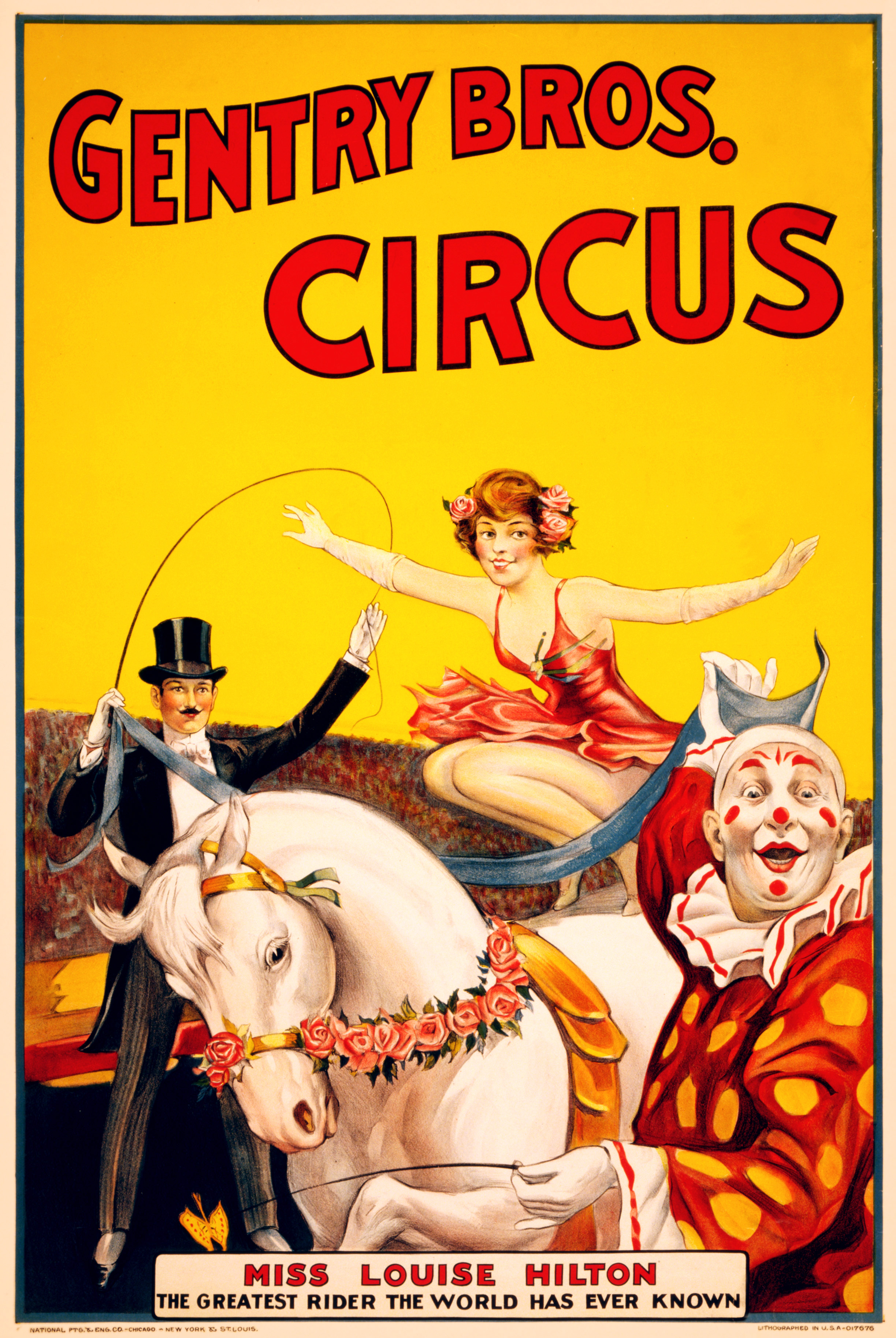 The Gentry brothers circus was formed by four brothers from Bloomington, Indiana. Their circus was noted for the dog and pony acts. This advertising circus poster features Louise Hilton, “the greatest rider the world has ever known.”