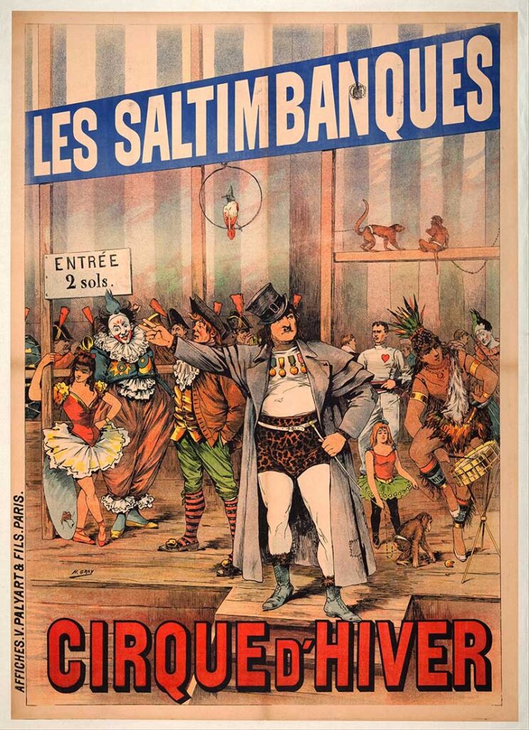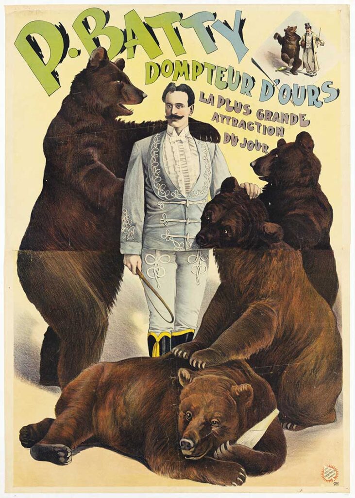 A 1902 French circus poster, “Batty bear trainer, the biggest attraction of the day“.