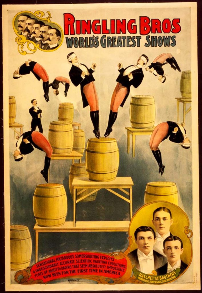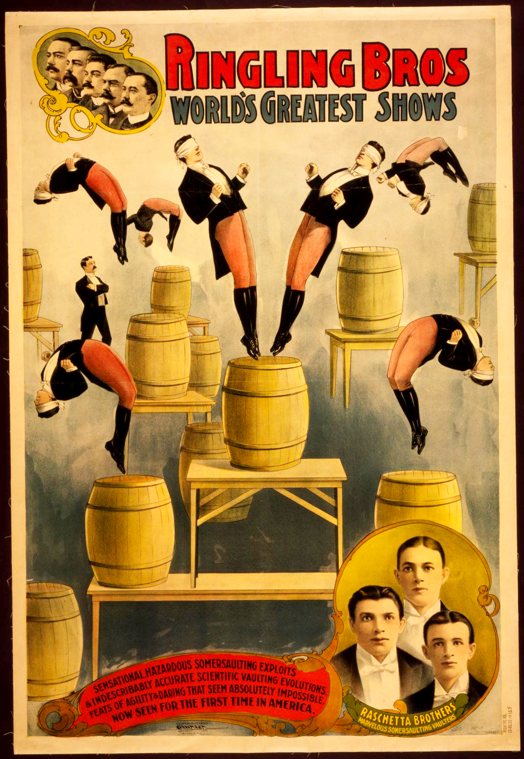 This vintage circus poster describes the Raschetta Brothers act as the following: “Sensational hazardous somersaulting exploits & indescribably accurate scientific vaulting evolution’s. Feats of agility & daring that seem absolutely impossible. Now seen for the first time in America.”