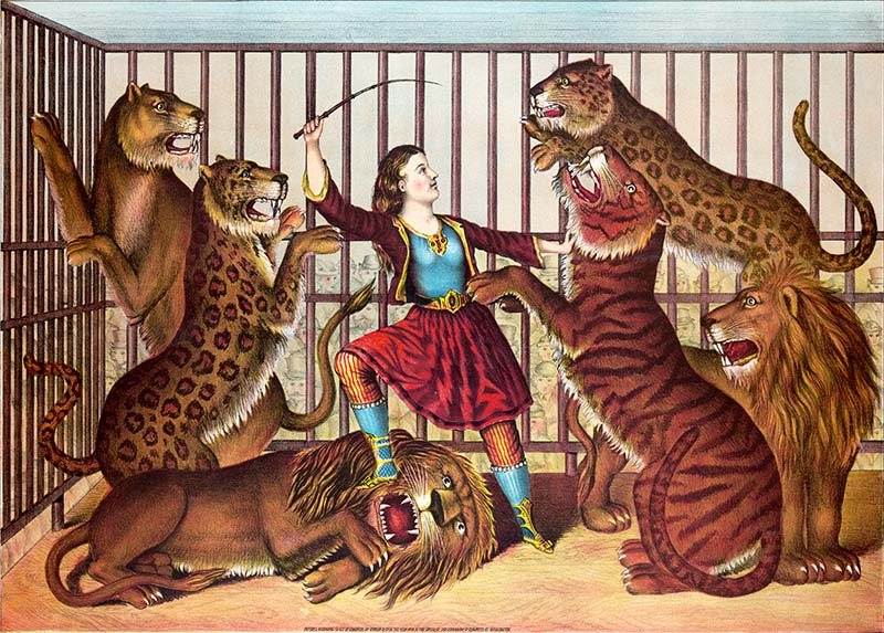 This beautiful 1874 circus painting is called “The Lion Queen”. If you notice the main three big cats, lion, tiger and jaguar are all in the painting.