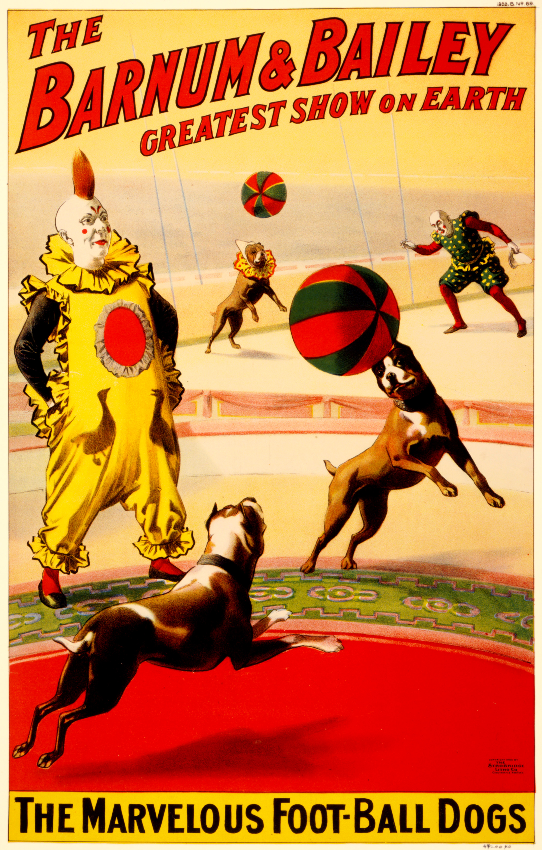 Another fabulously colourful Barnum & Bailey vintage circus poster of “the marvelous foot-ball dogs”.