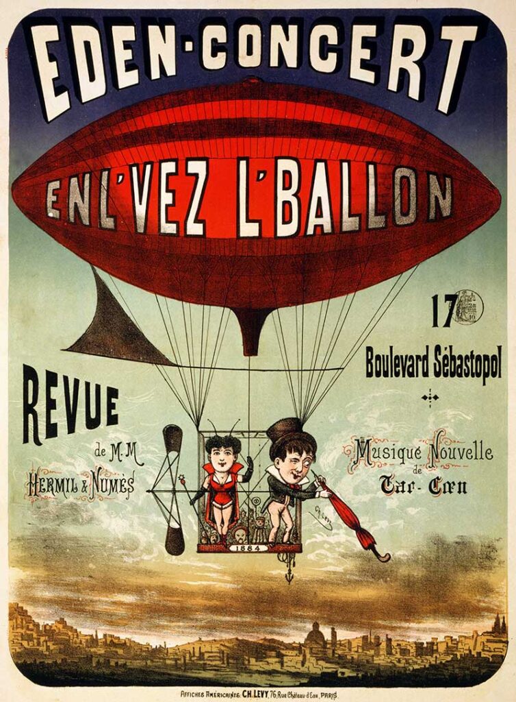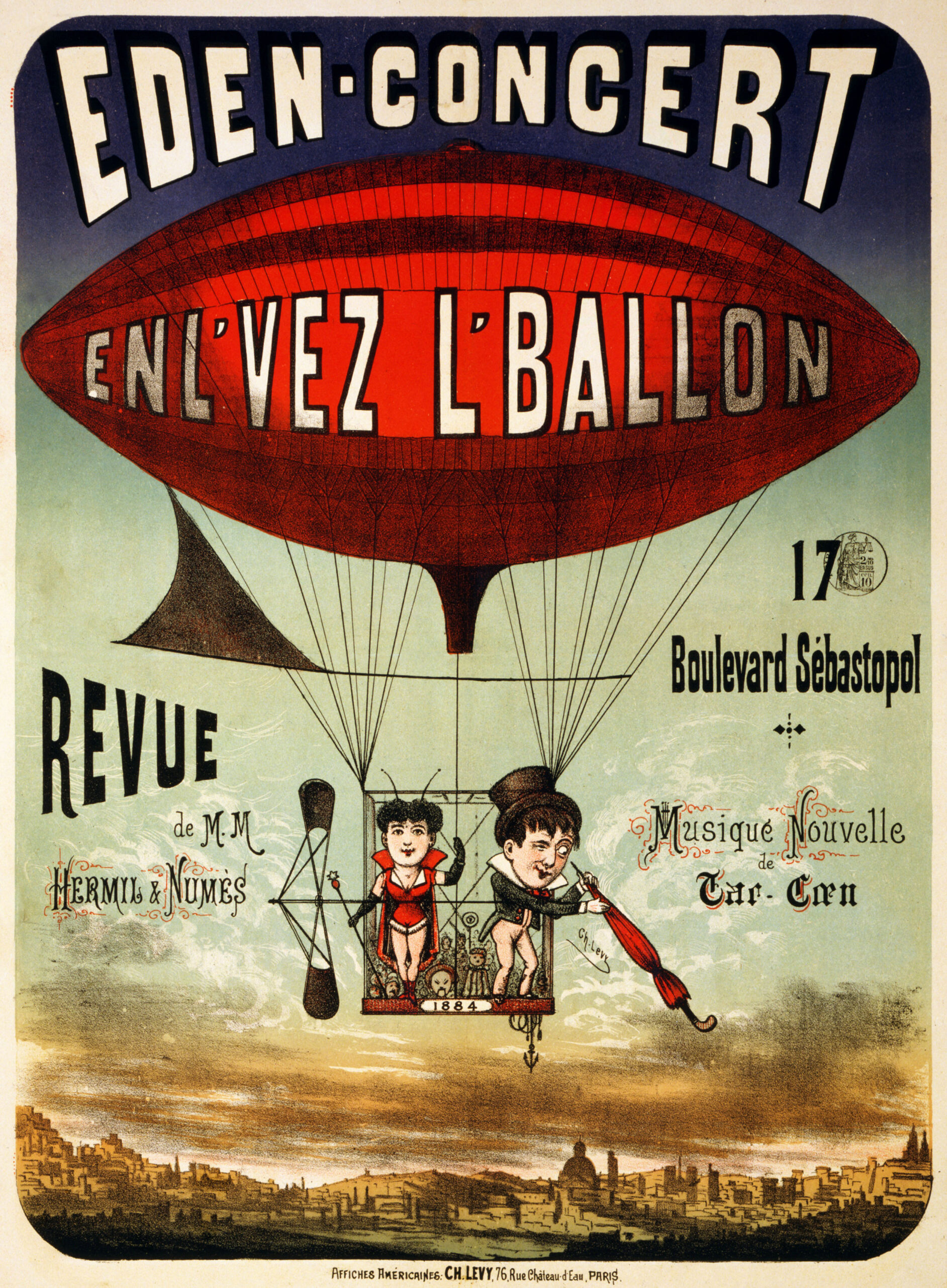 French circus poster shows two performers in the basket of an airship navigated by a rudder and a propeller. The basket bears the date 1884.