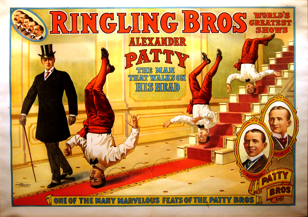 This vintage circus poster advertises the novel head walker Alexander Patty. The New York Athletic Club Journal (1905) described the act as follows