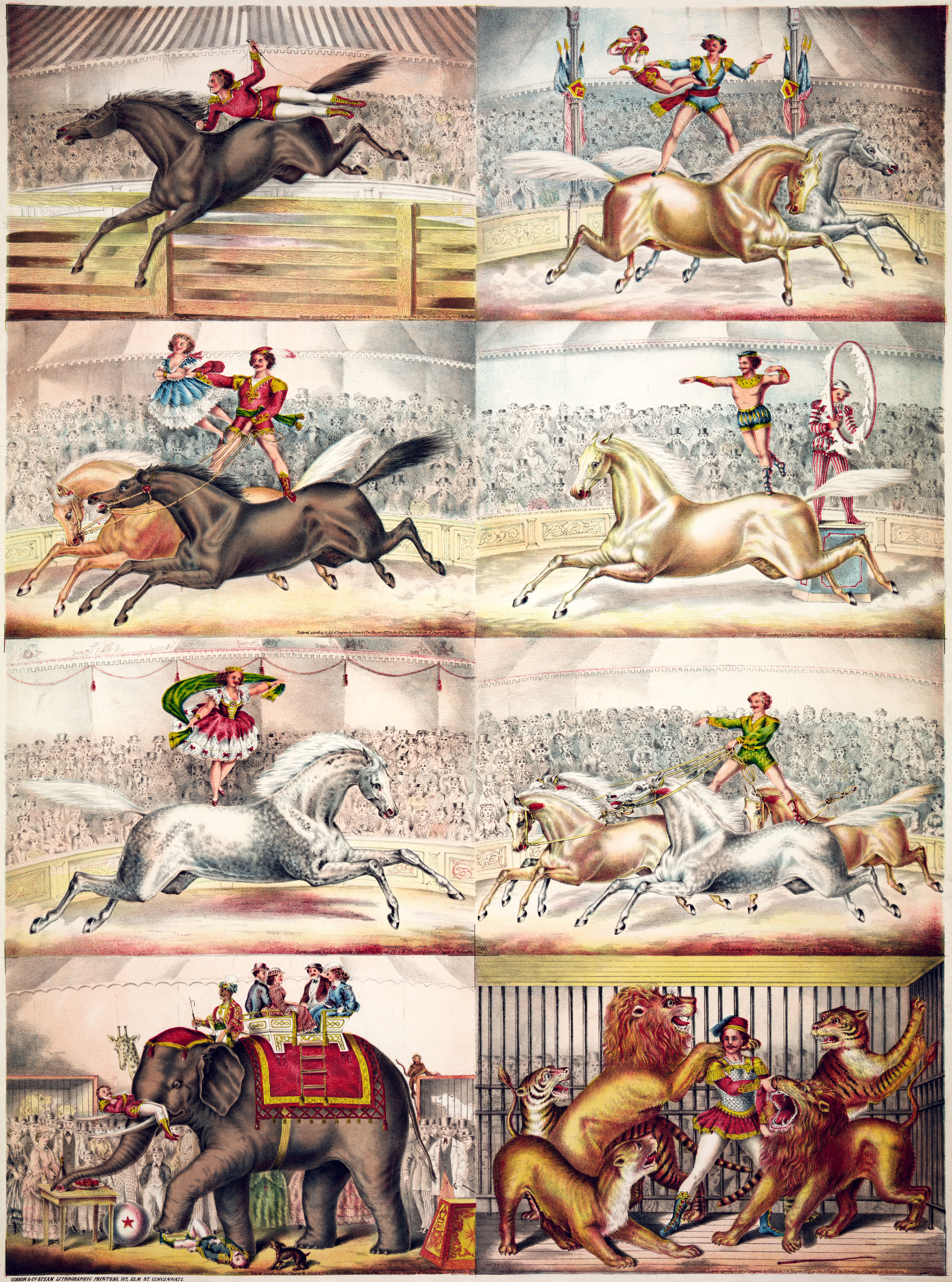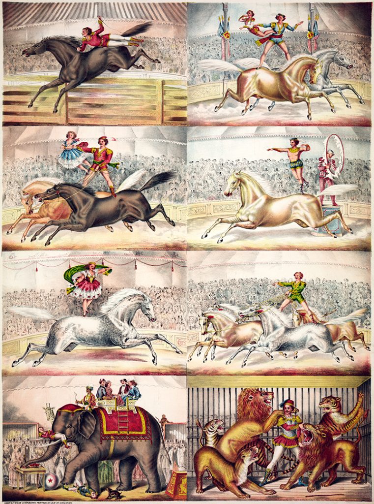 A montage of vintage circus acts, all featuring animals. Many examples of bareback horse acrobatics, an elephant ride and a lion tamer.