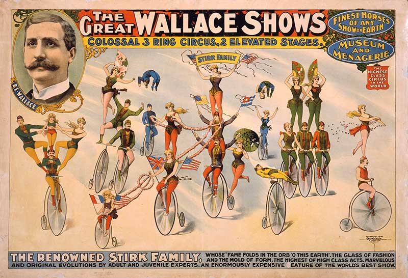 A 1898 poster advertising The Great Wallace Shows circus, featuring “the renowned Stirk Family.”