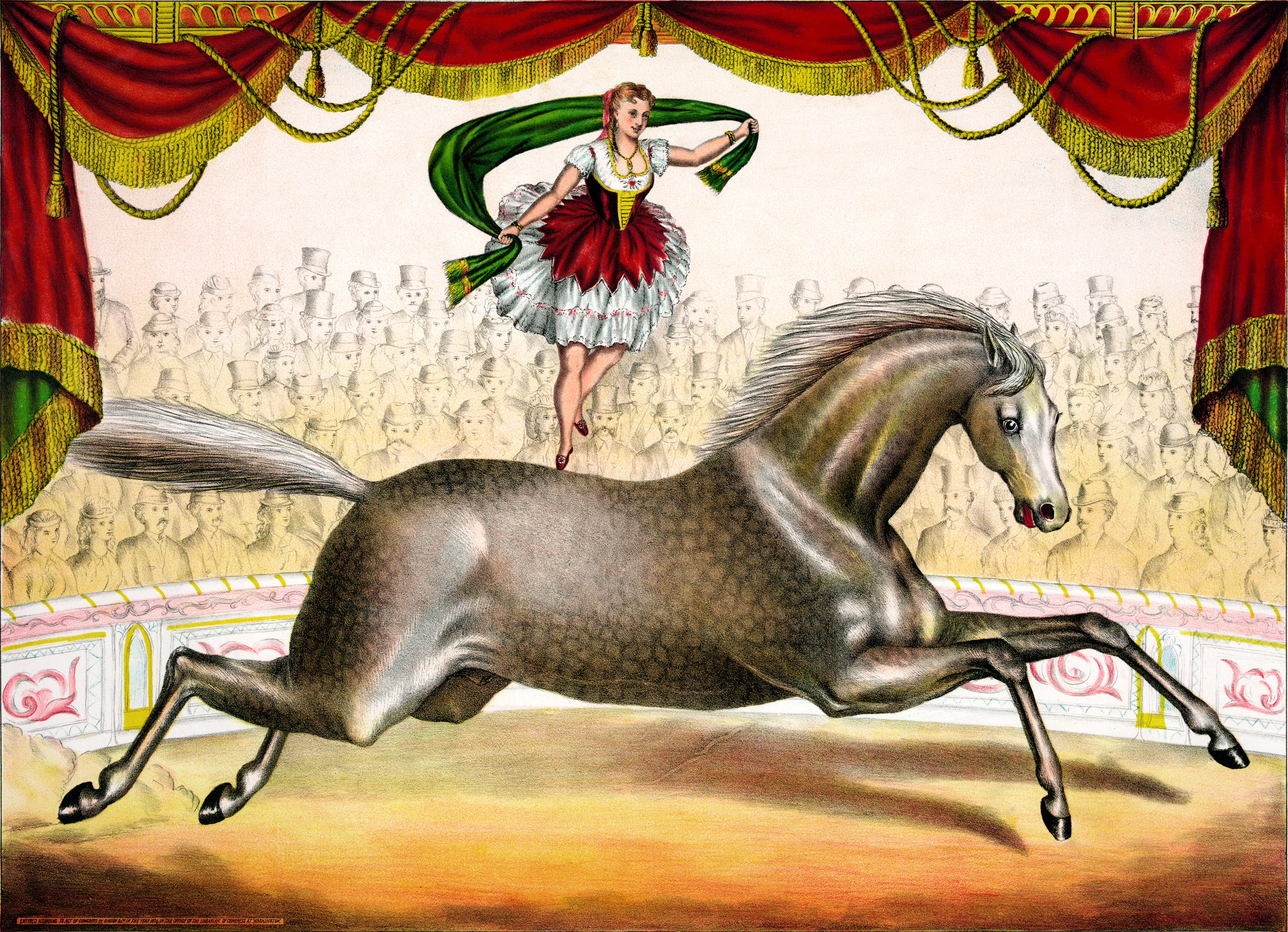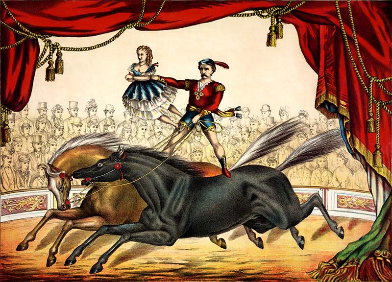 The art of performing acrobatic and gymnastic feats on the bare backs of loping horses was referred to as bareback riding in the circus