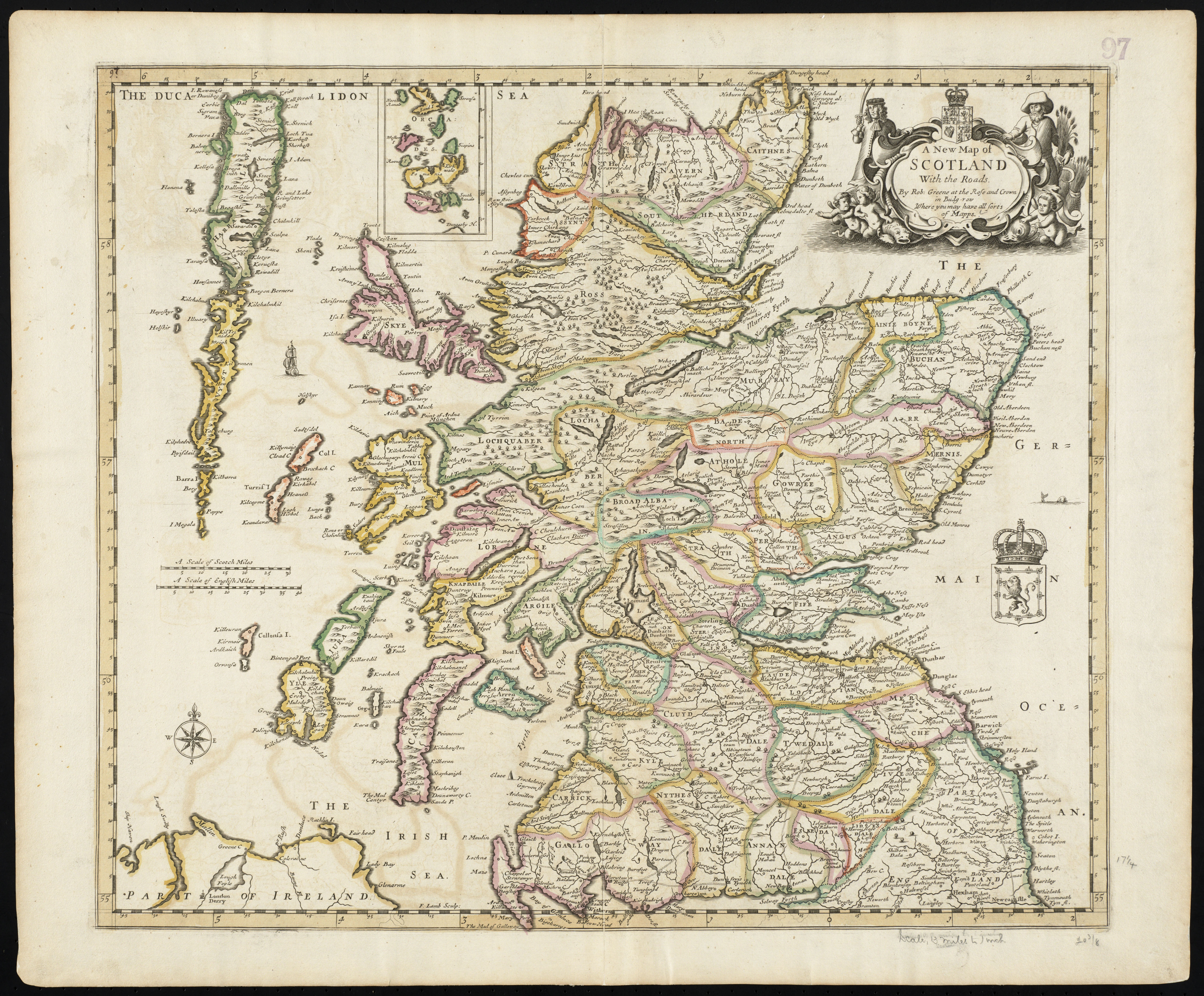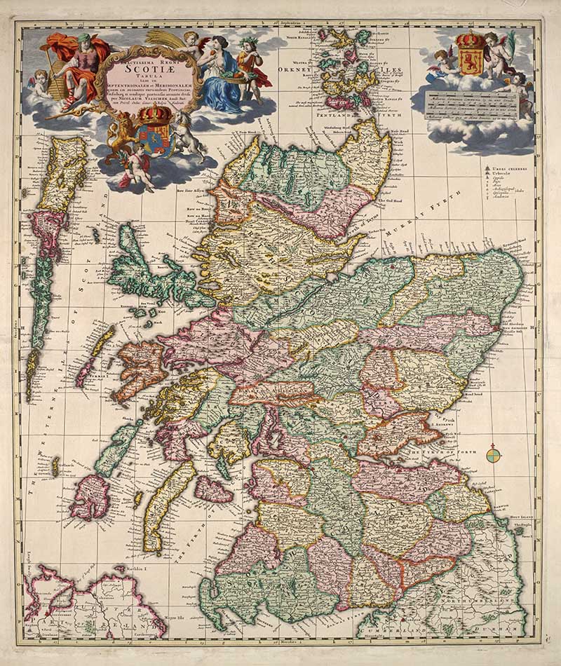 There are some lovely illustrations on the map showing the shield of Scotland, a unicorn the national anima. There are also several cherubs.
