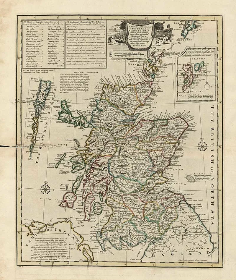 A new & accurate map of Scotland or North Britain: drawn from surveys and most approved maps and charts with several improvements not to be found in any other map extant.  Relief is shown pictorially. Depths are shown by soundings in the local area. Hand-colored to emphasize shire boundaries.