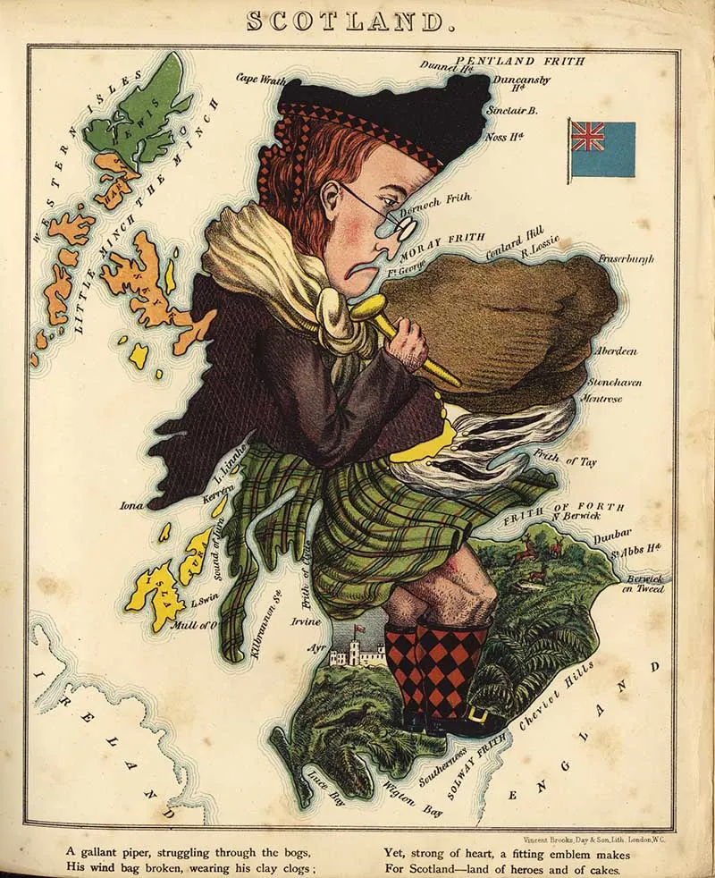 This map of Scotland is shown illustrated as a caricature of a Scotsman.