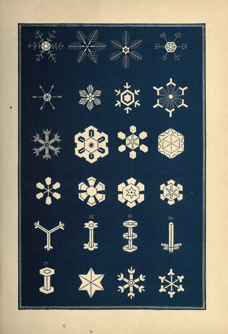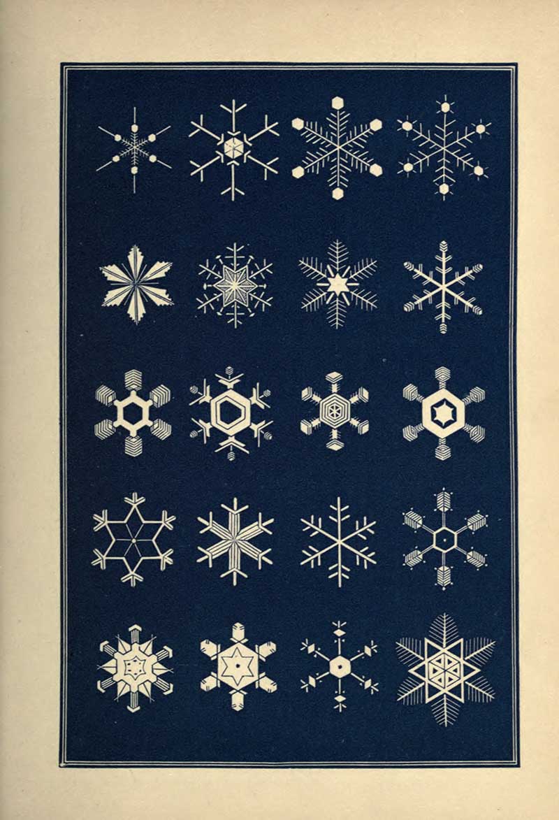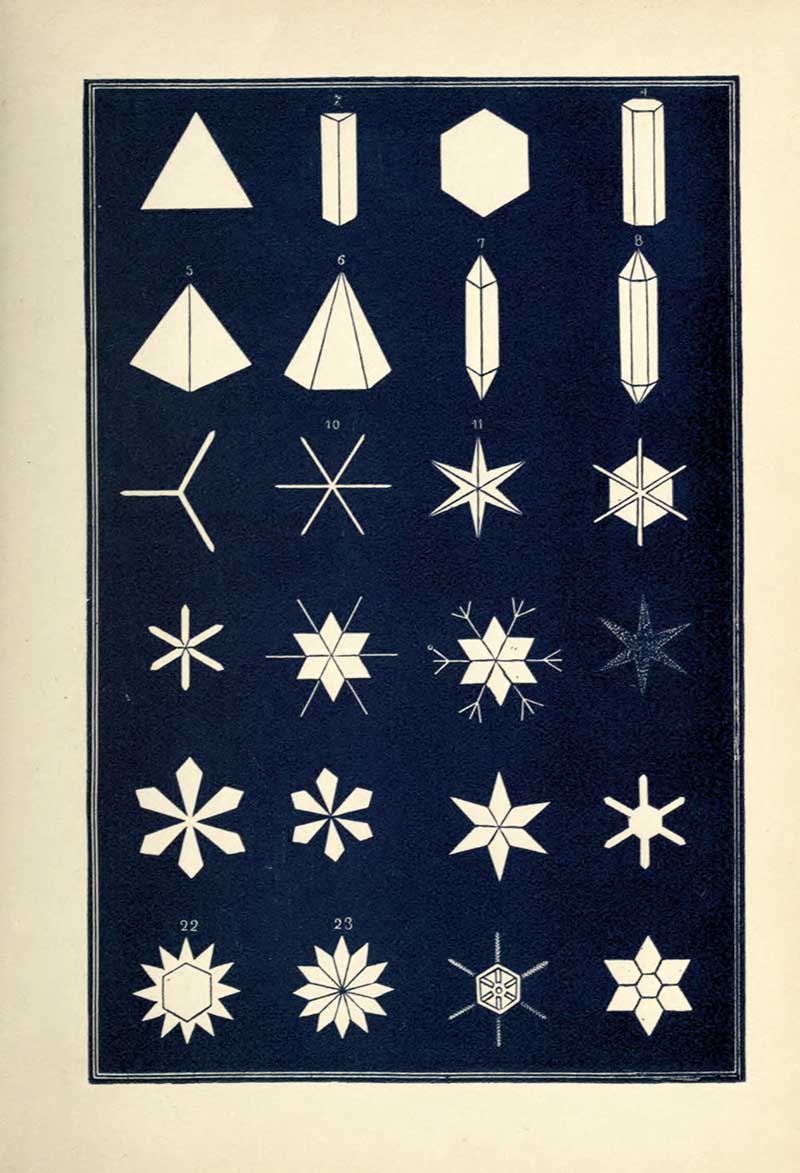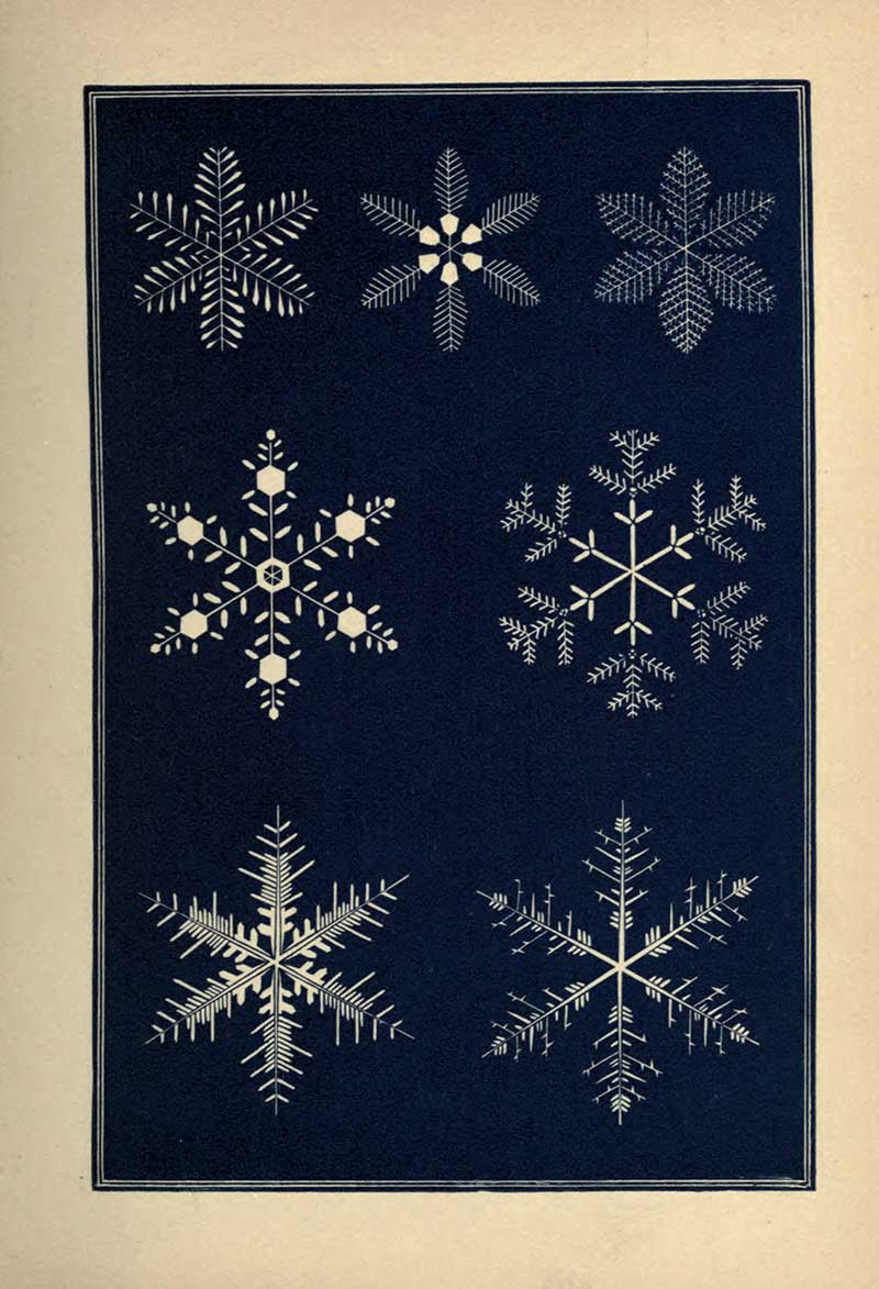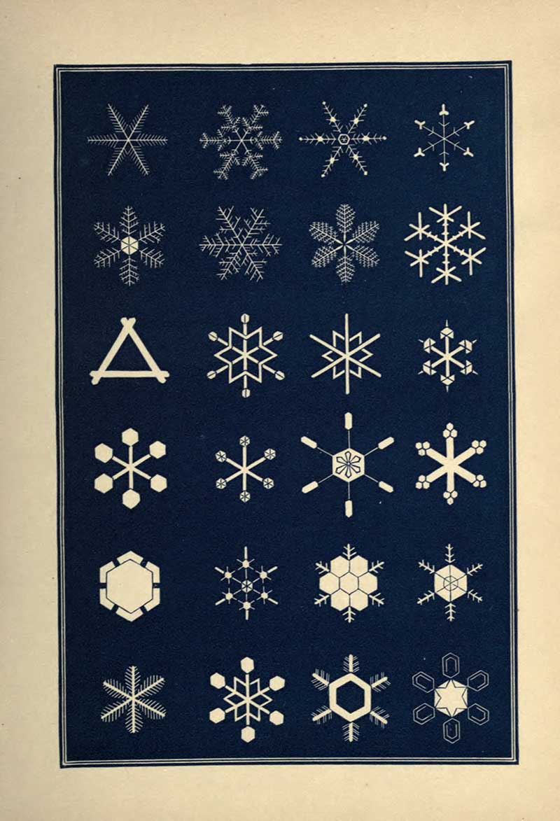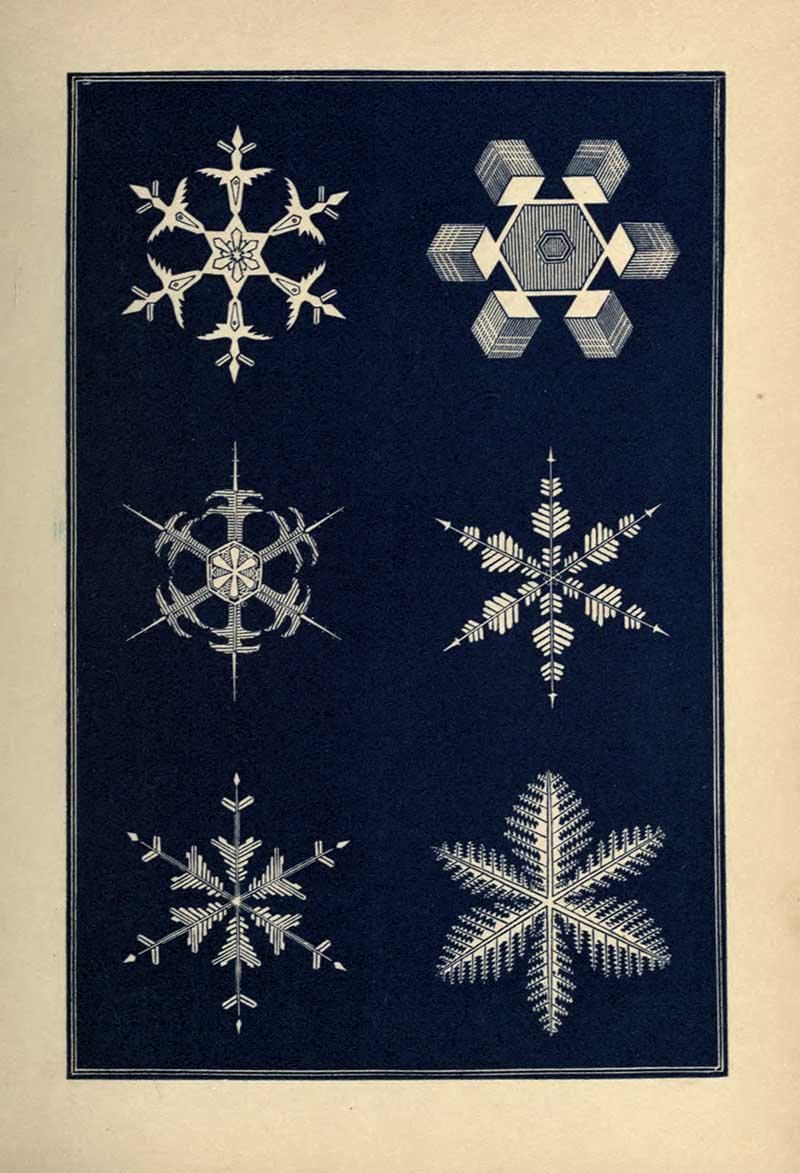 “A STRIKING characteristic of the snow crystal is its perfection of form. Whatever be the type of its structure, that type is completed with the utmost regularity and nicety. Every angle is of the prescribed size, not a degree more or less. The number of parts is uniform. You will never see a star with five rays nor seven. With a precision which art would strive in vain to excel, the pattern is carried out in detail with the most exact symmetry and in the most nicely-adjusted proportions.”