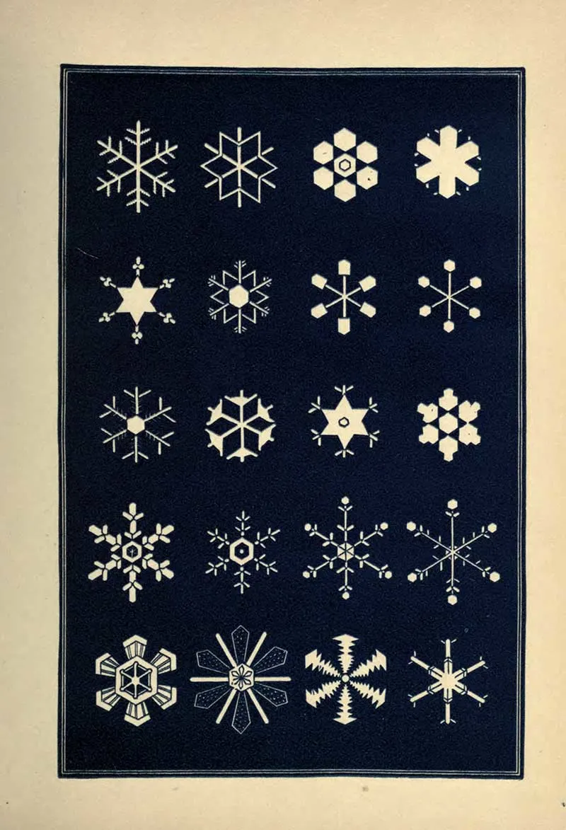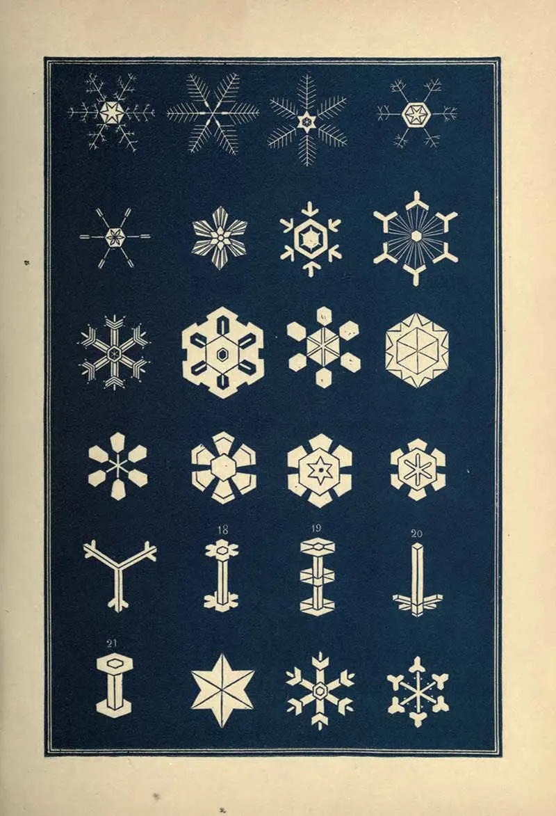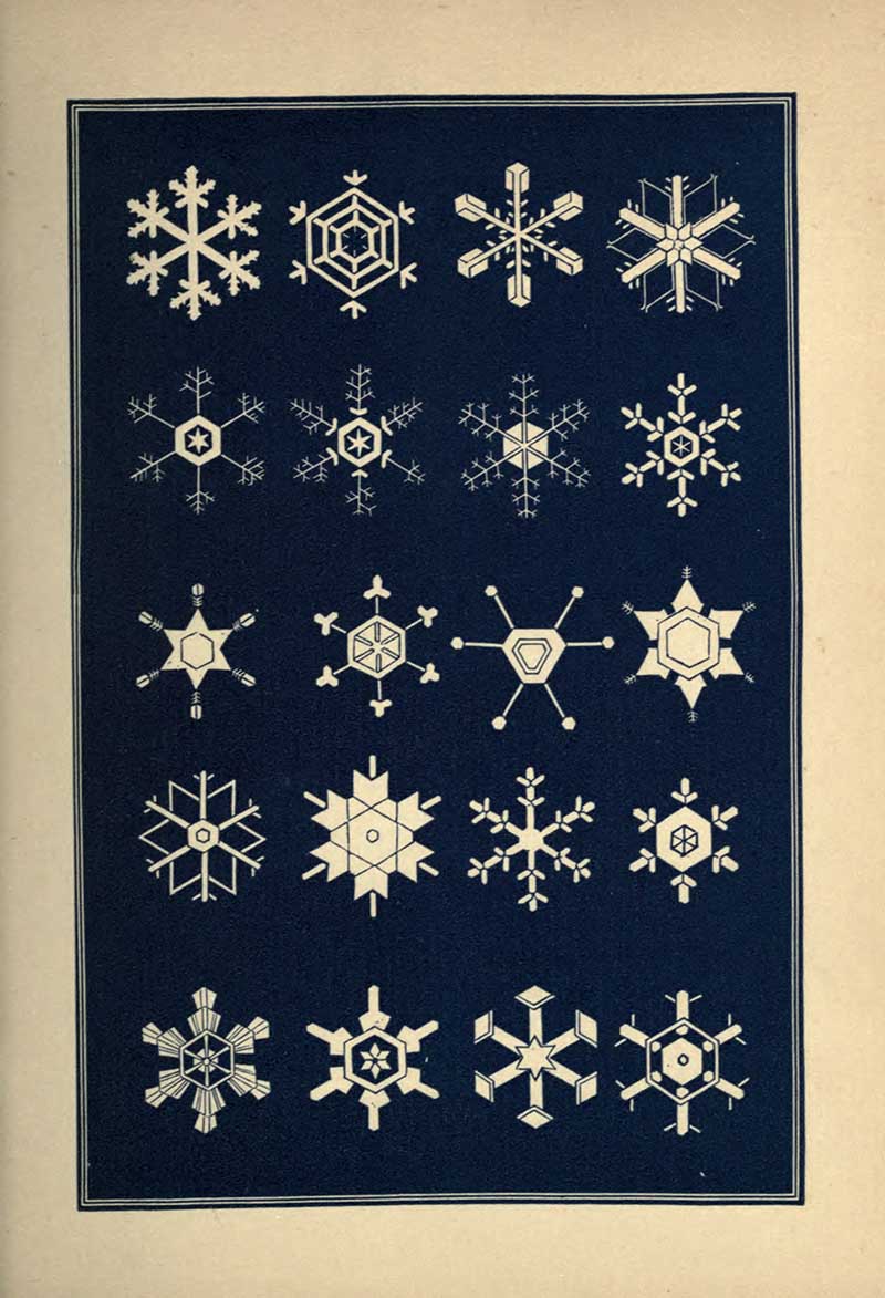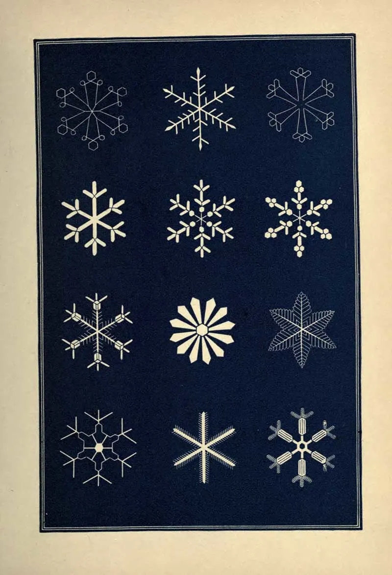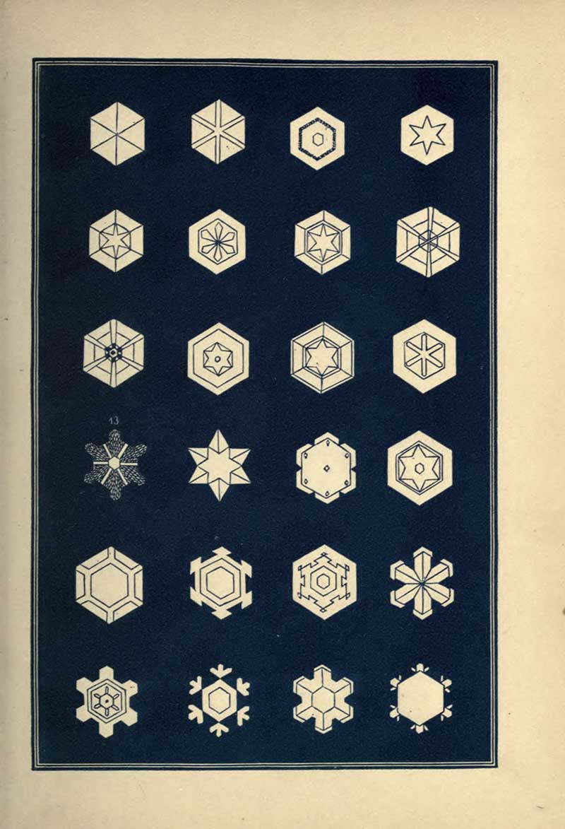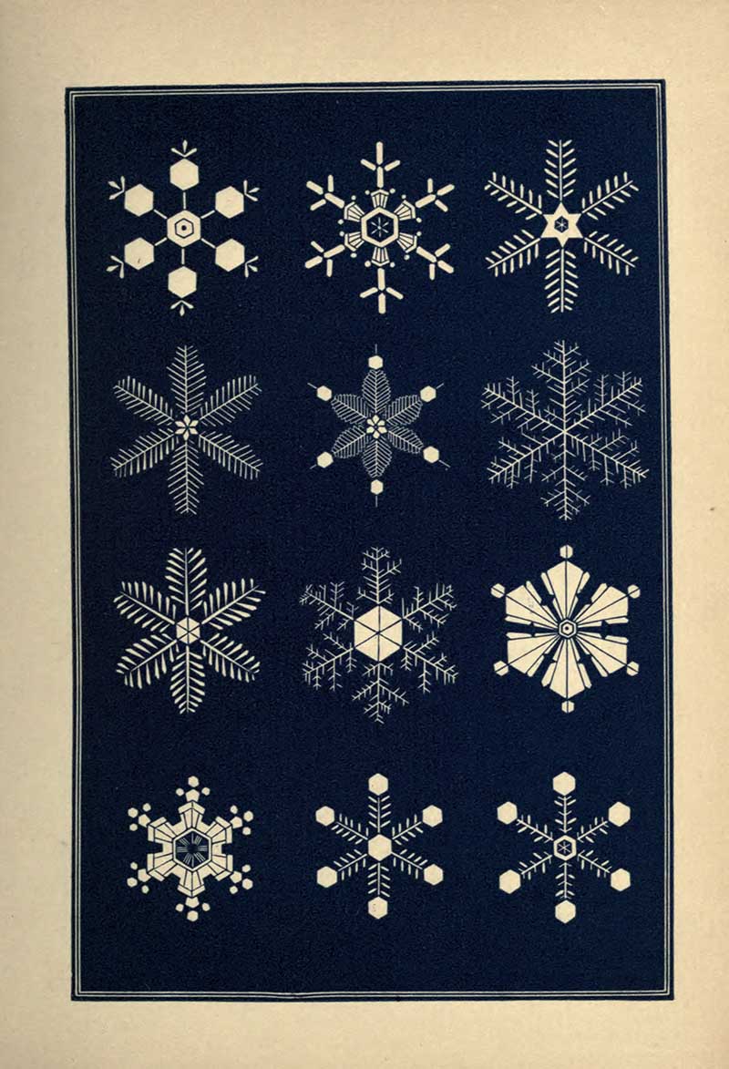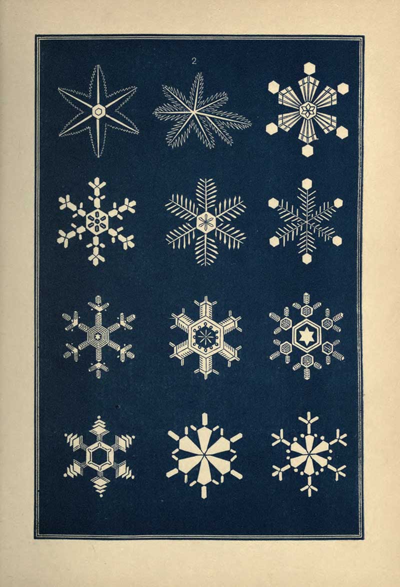 “A STRIKING characteristic of the snow crystal is its perfection of form. Whatever be the type of its structure, that type is completed with the utmost regularity and nicety. Every angle is of the prescribed size, not a degree more or less. The number of parts is uniform. You will never see a star with five rays nor seven. With a precision which art would strive in vain to excel, the pattern is carried out in detail with the most exact symmetry and in the most nicely-adjusted proportions.”