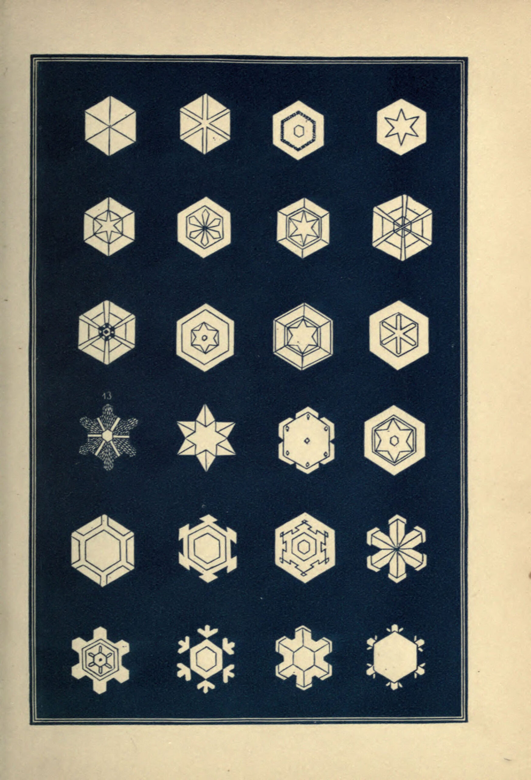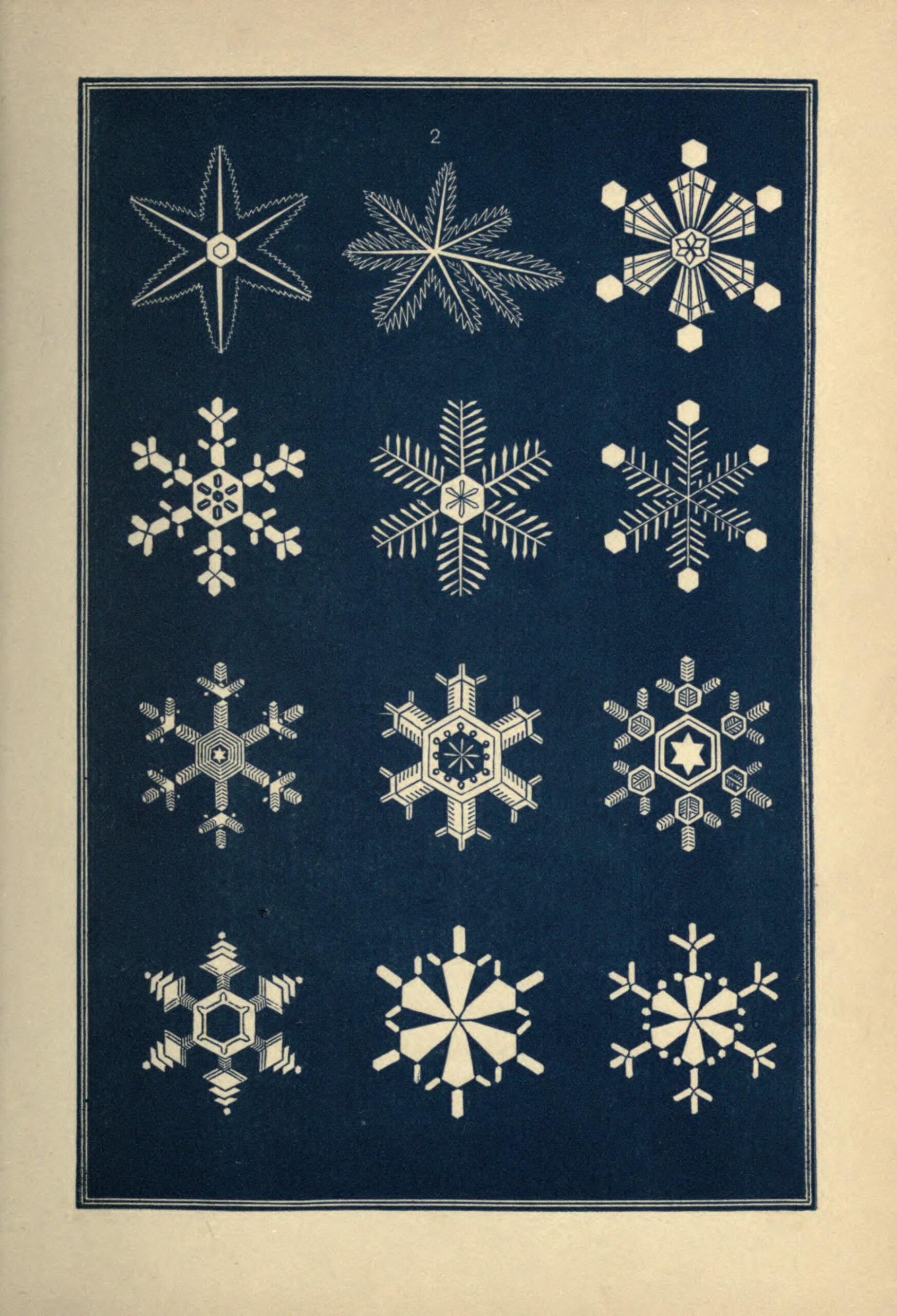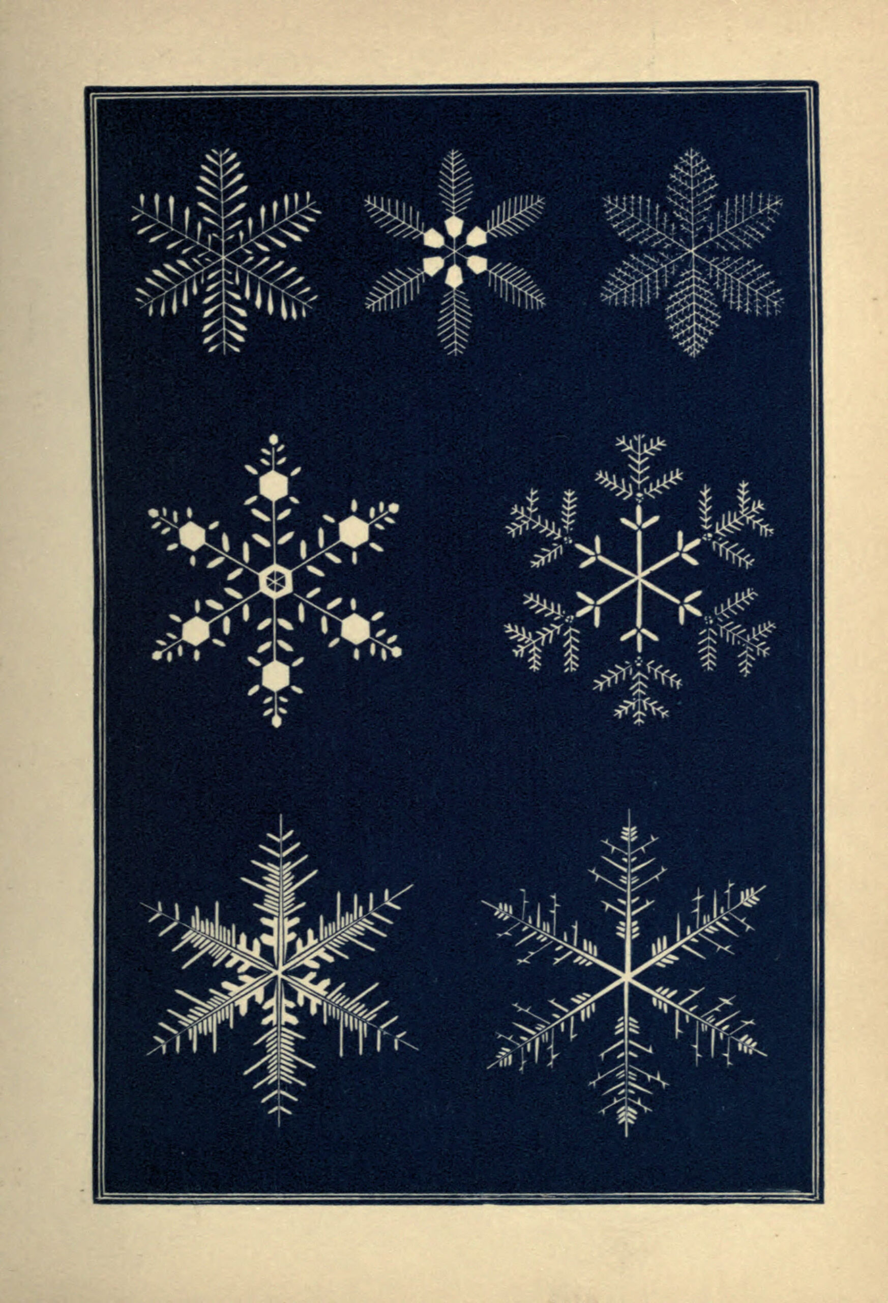 Except for the first few figures on the first print, which shows the primary geometric forms of snow vapour crystals, the drawings are of actual snowflakes observed through a microscope and then sketched.