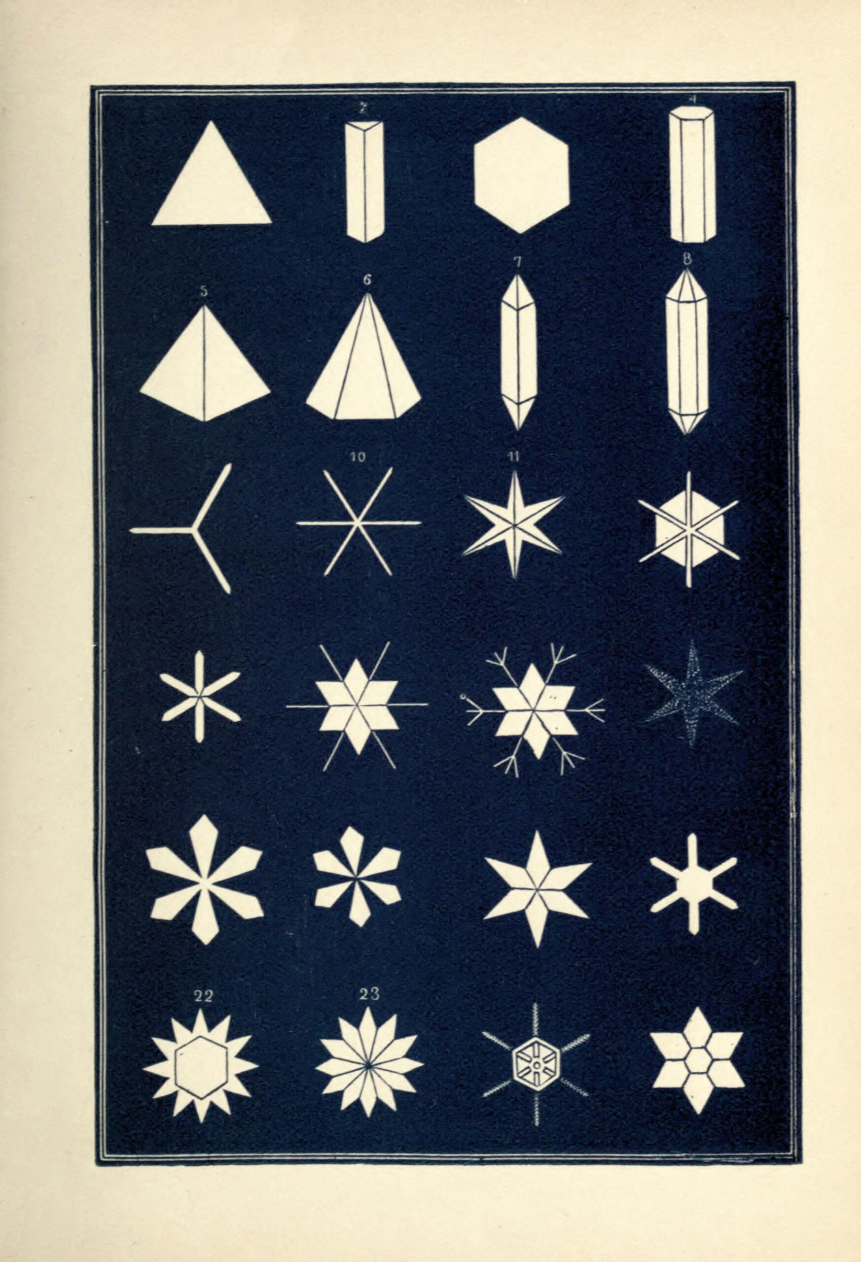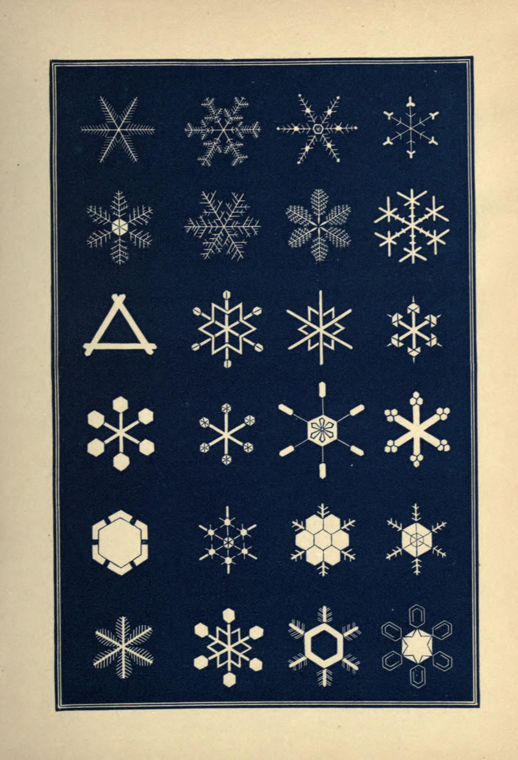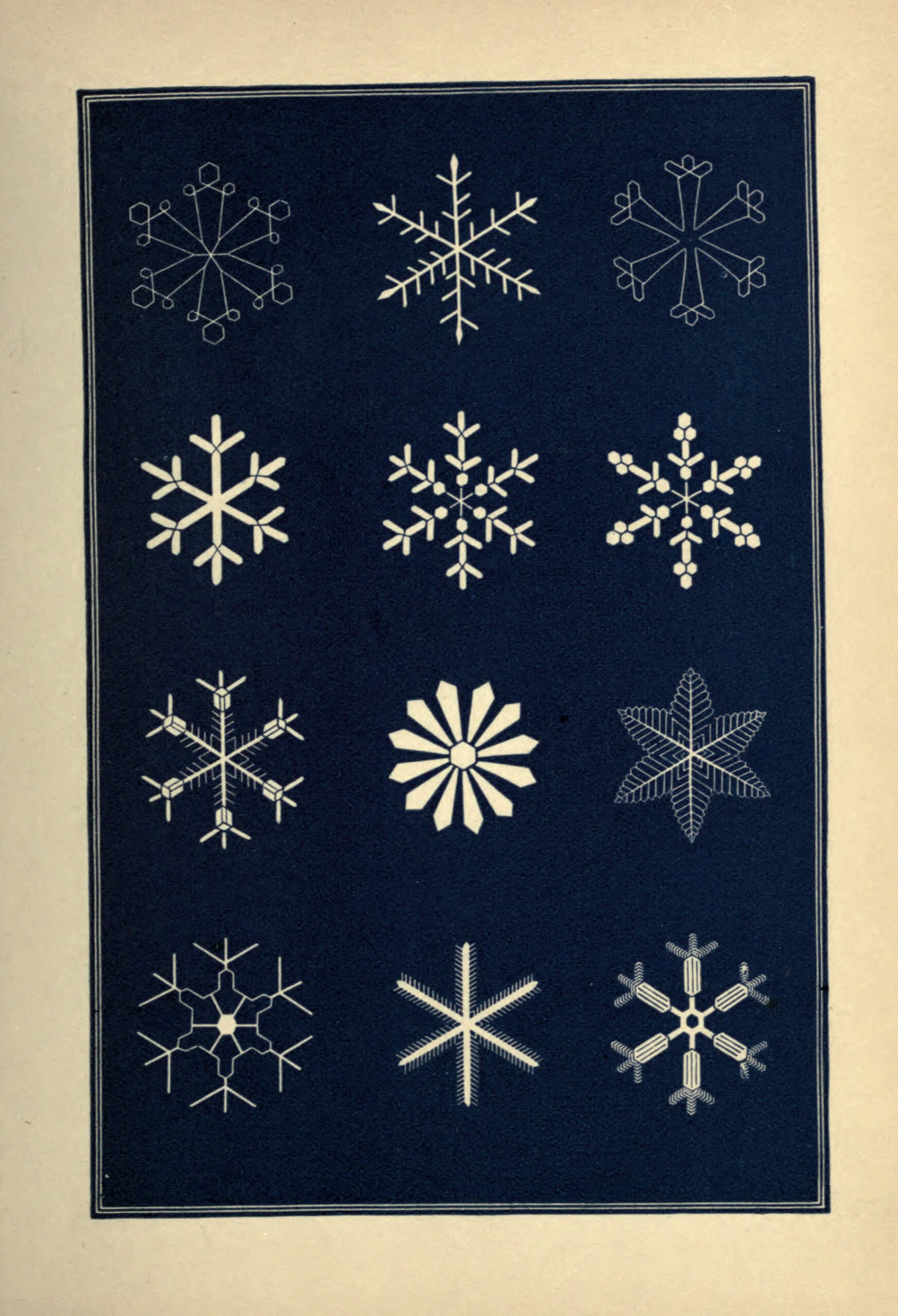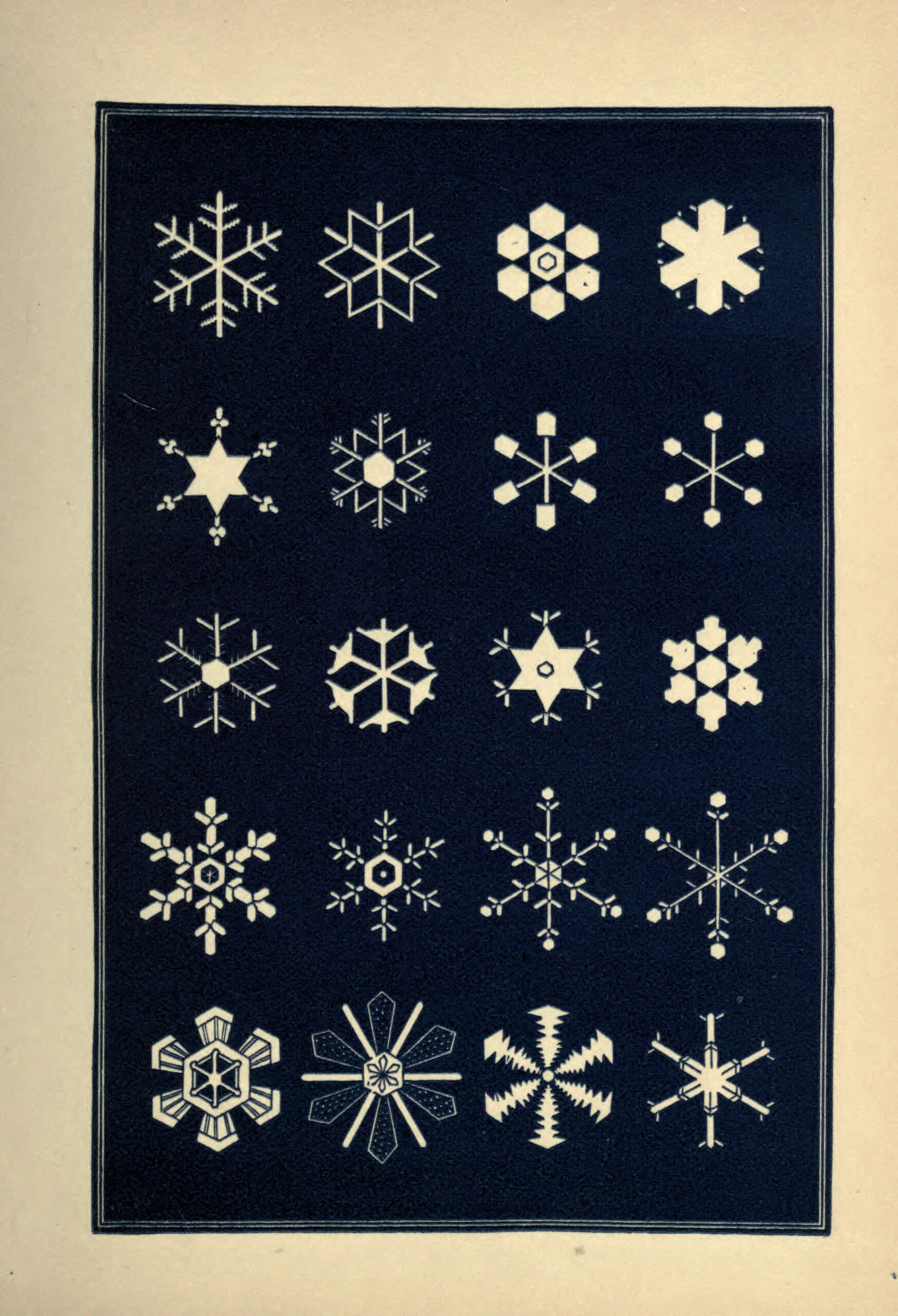 Except for the first few figures on the first print, which shows the primary geometric forms of snow vapour crystals, the drawings are of actual snowflakes observed through a microscope and then sketched.