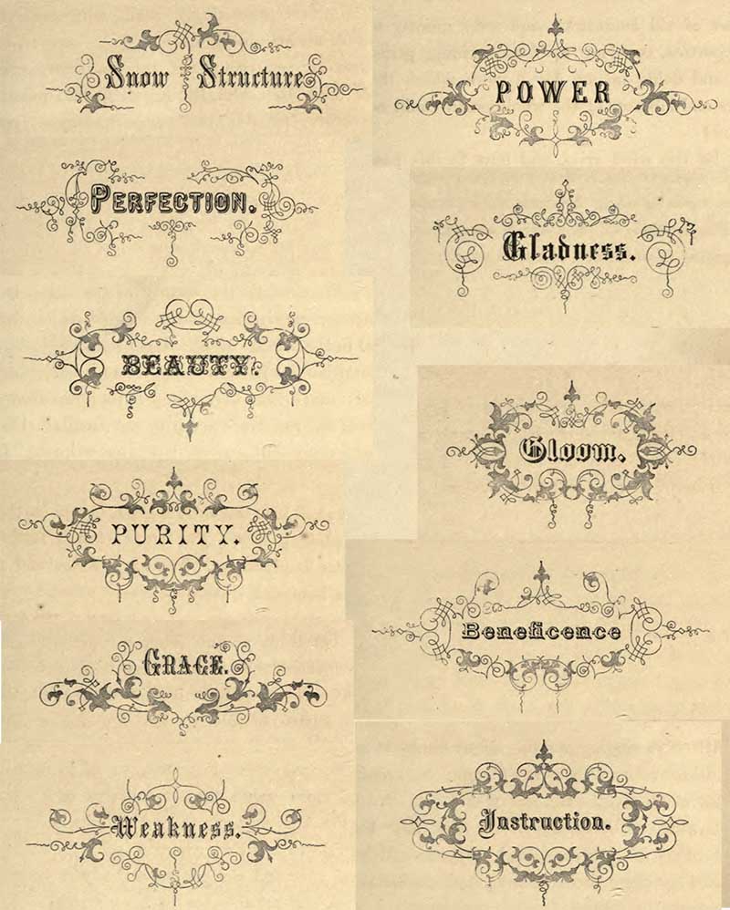 As I mentioned with the collection of American Founders Type, I’m a bit of a typography nerd. I particularly liked the typography of the chapter headings in this book of snowflakes and have collected them together here.